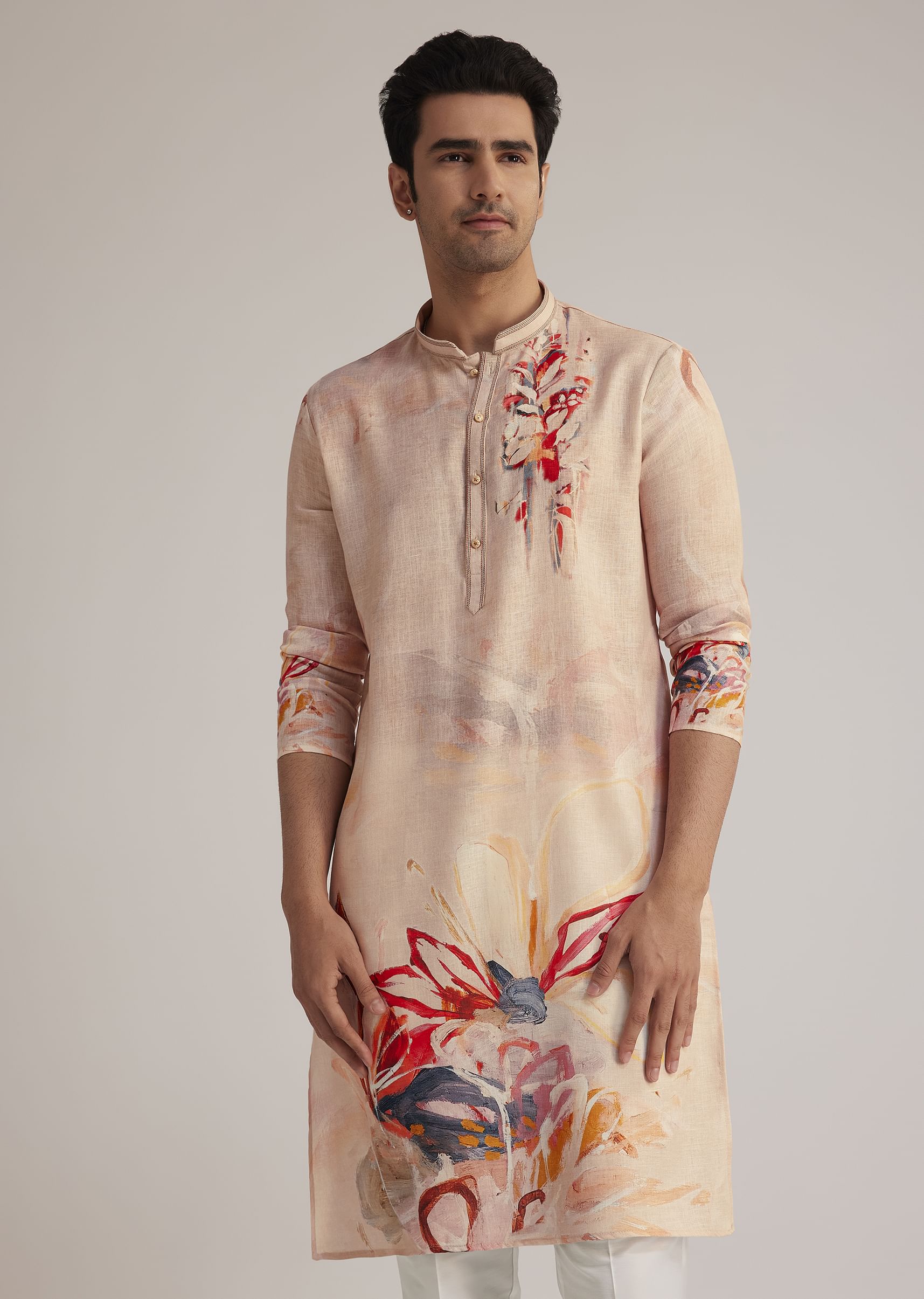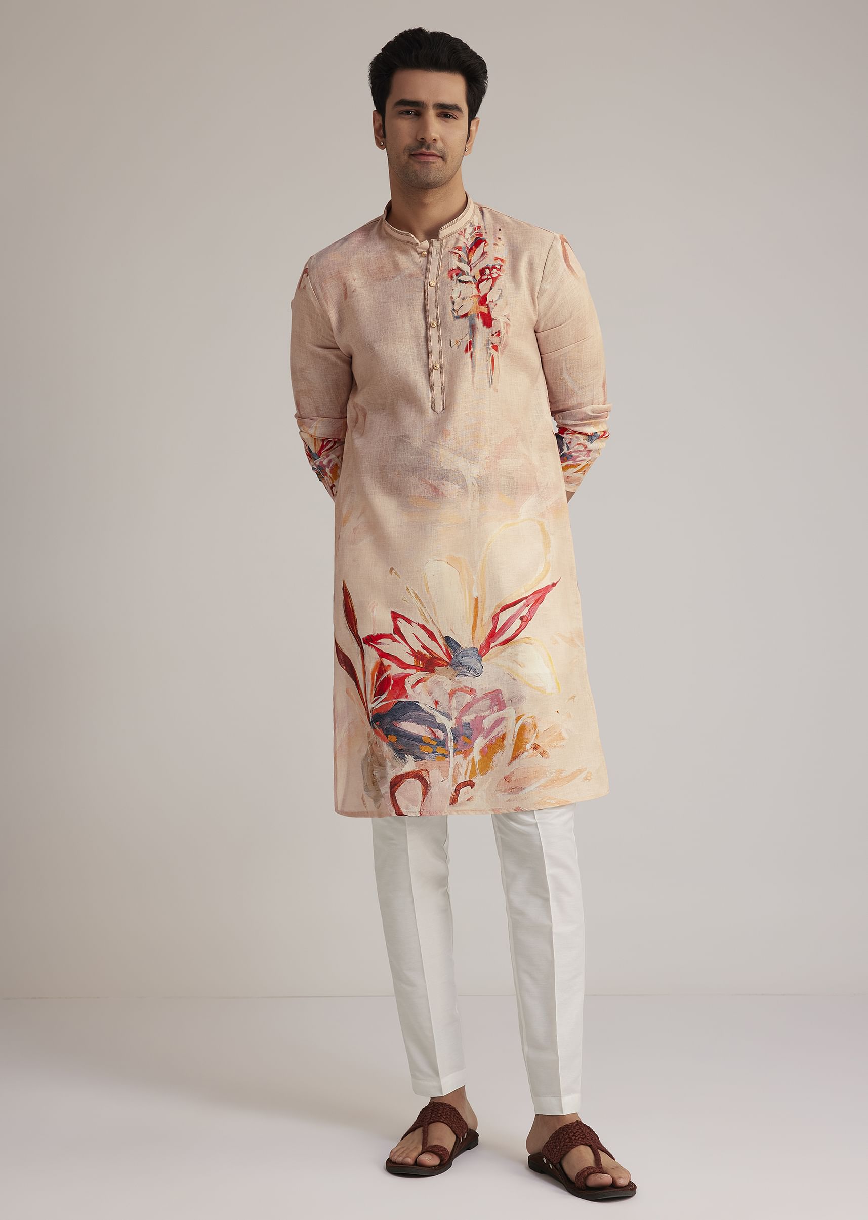 This Beige Linen Kurta Is A Masterpiece Of Vibrant Artistry, Featuring Floral Prints That Cascade Across The Front And Sleeves. The Earthy Base Contrasts Beautifully With The Vivid Colors, Creating... More Product Details