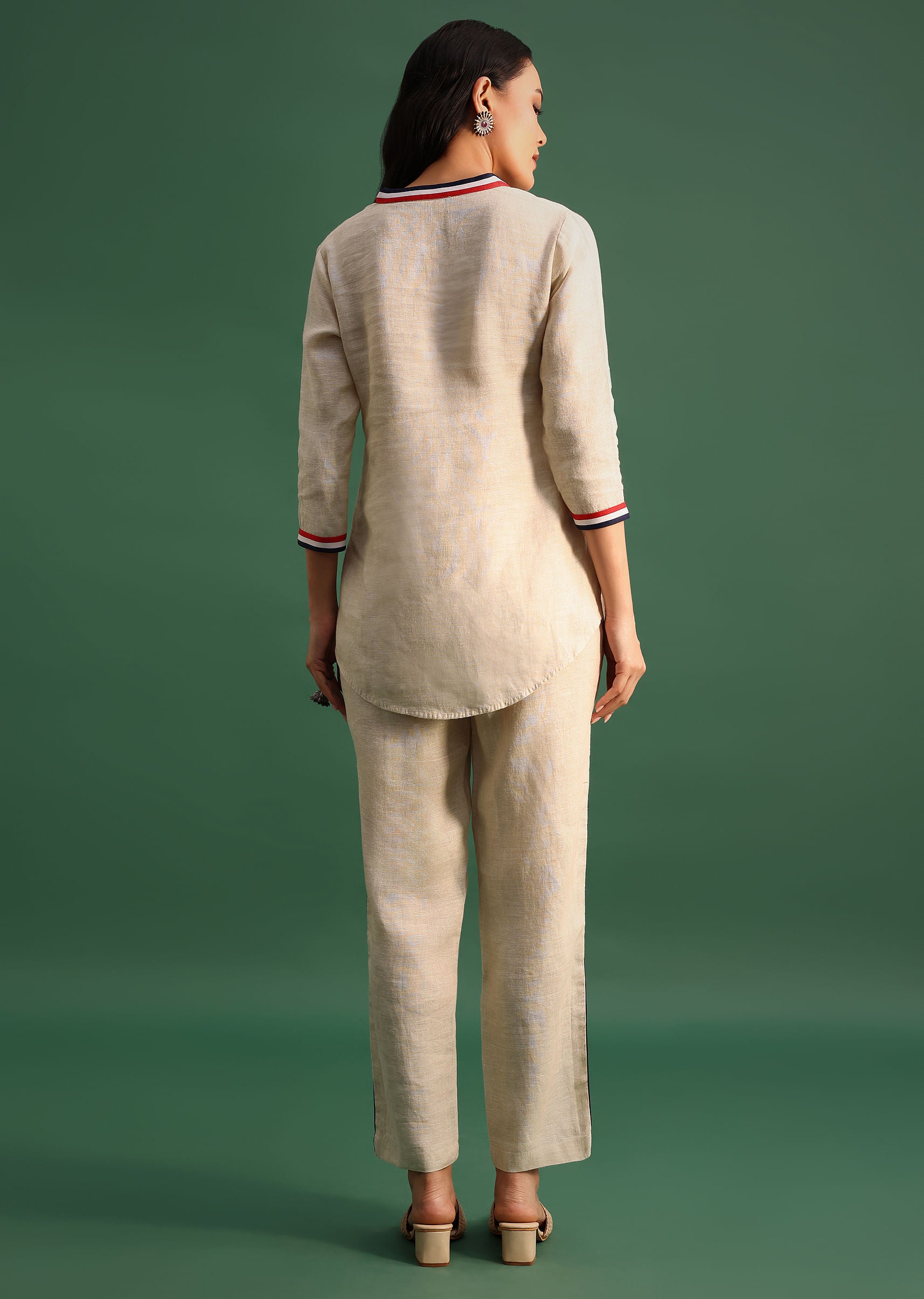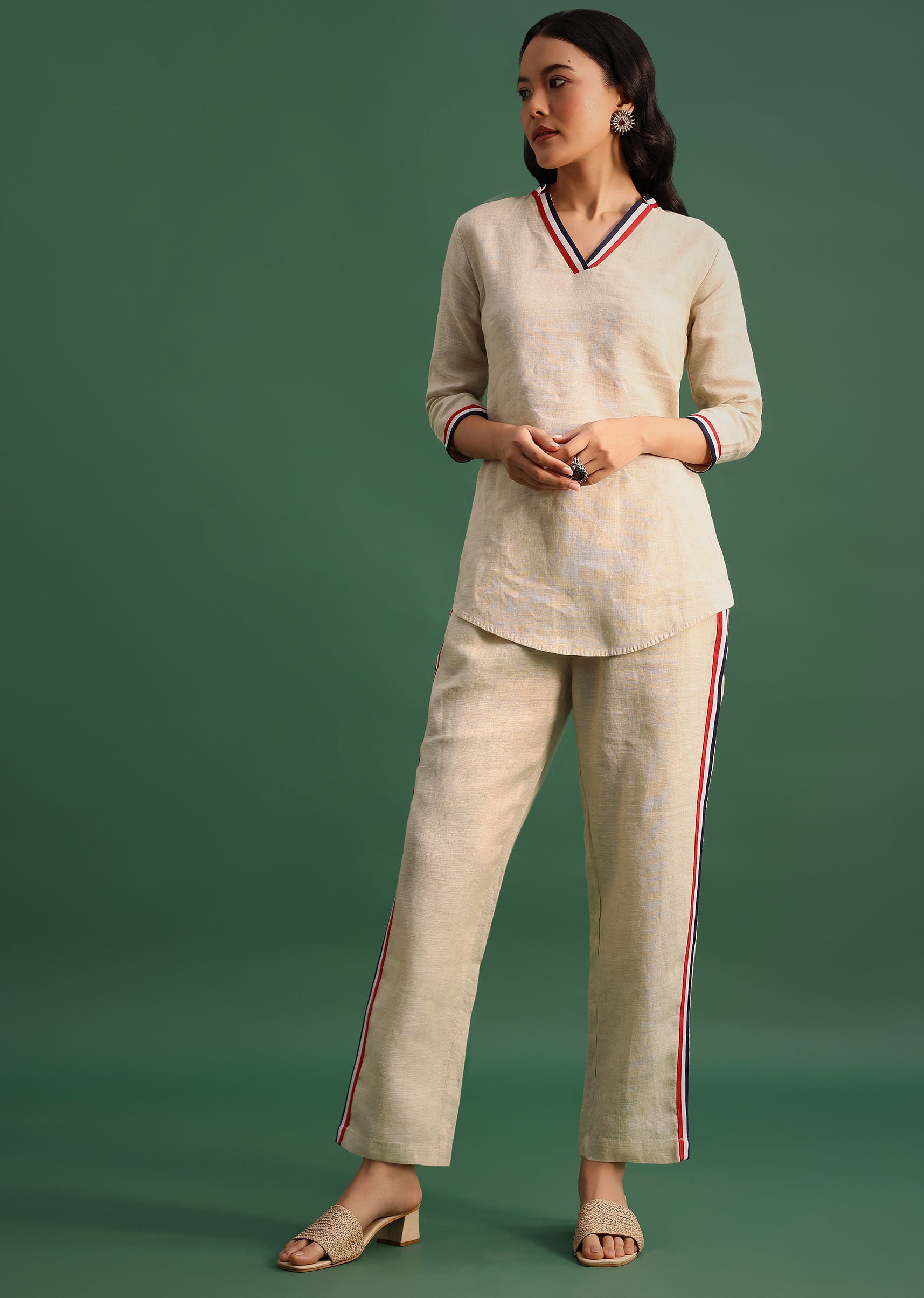 - Refresh your casual attire with our beige top and pants tailored for effortless chic.