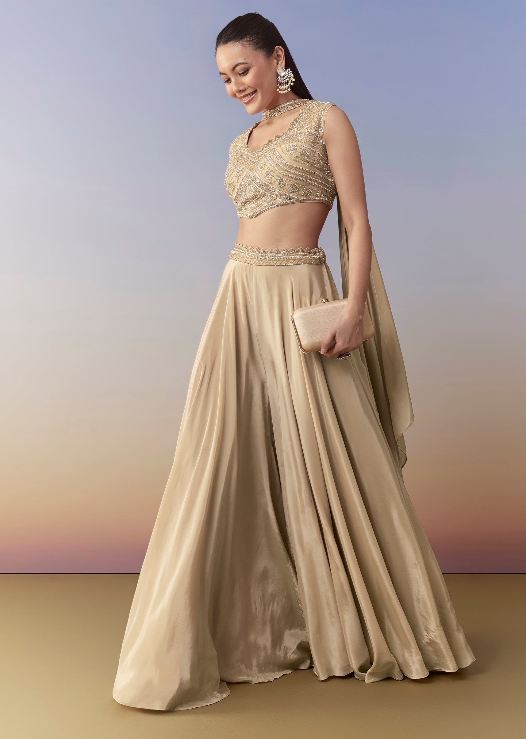 Beige Moti Work Crop Top Palazzo and Dupatta Set