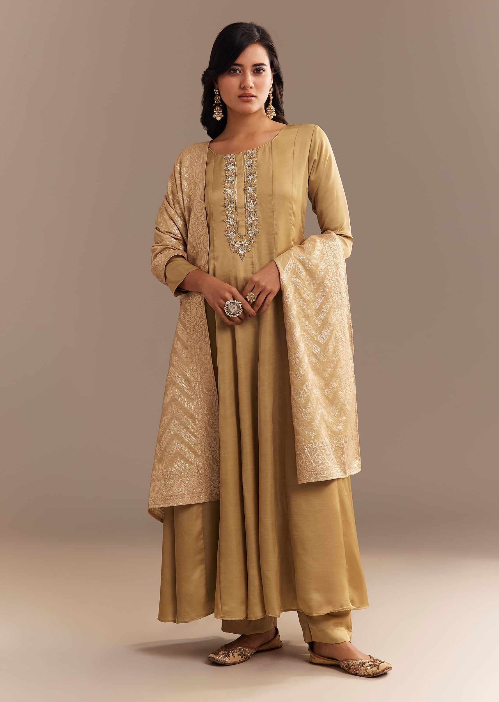 Embrace graceful sophistication with this Beige Muslin Mirror Embroidered Kurta Set. Crafted from soft muslin fabric it features delicate mirror and moti work on the neckline radiating subtle elegance and... More Product Details