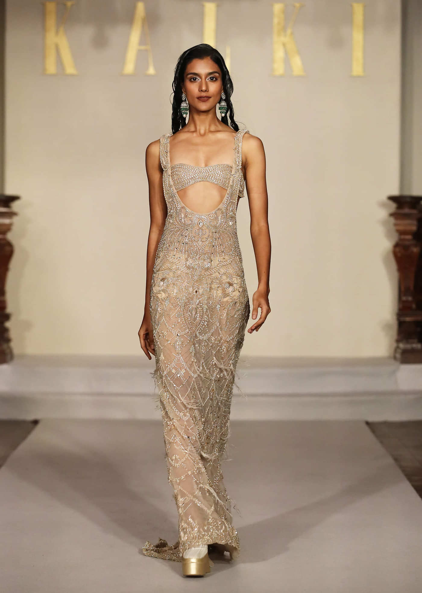 Soft-focus romance reads instantly when this beige net bridal gown meets its matching bustier in a clean layered composition. Fine embroidery gives a gentle cadence that flatters in motion and... More Product Details