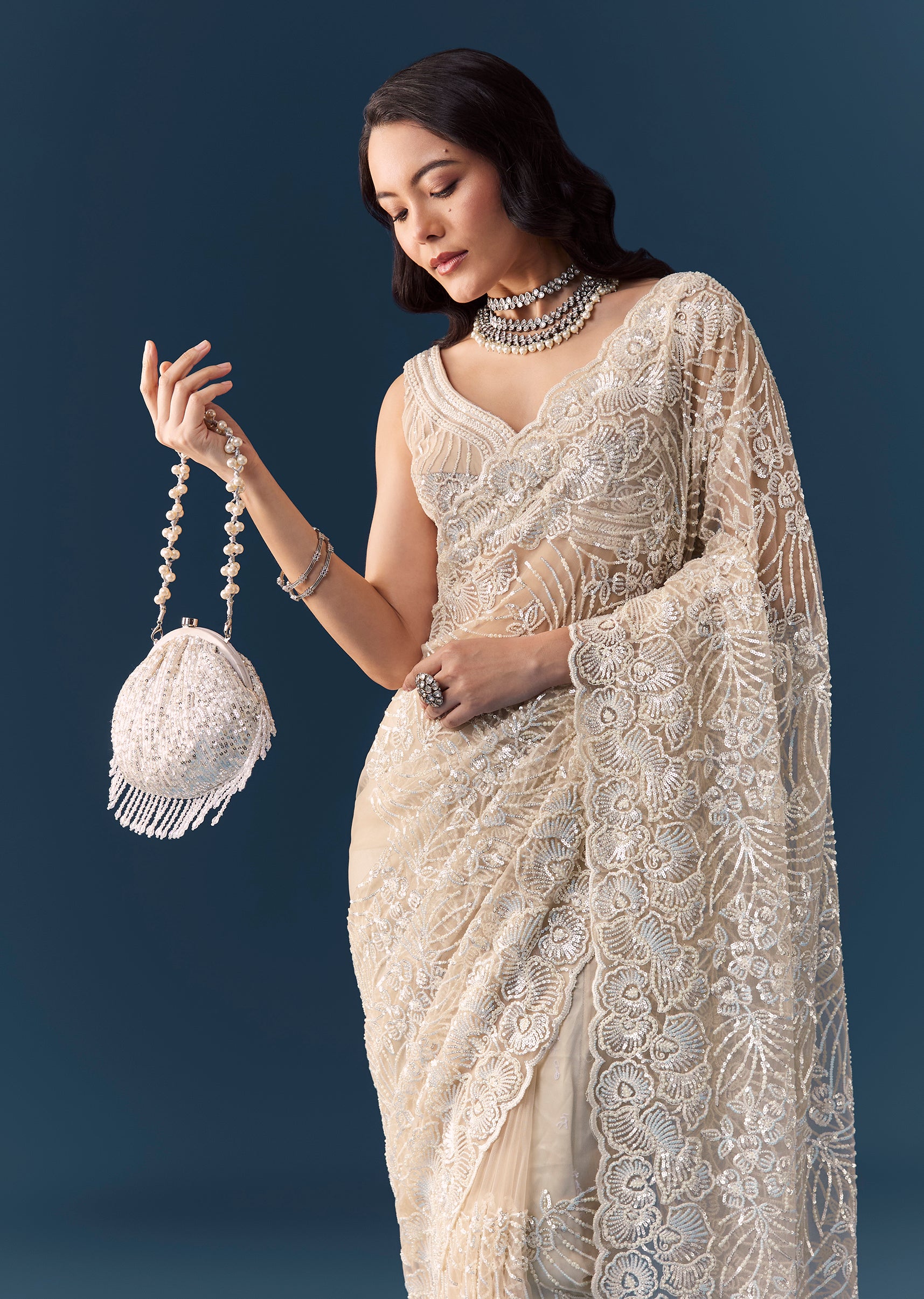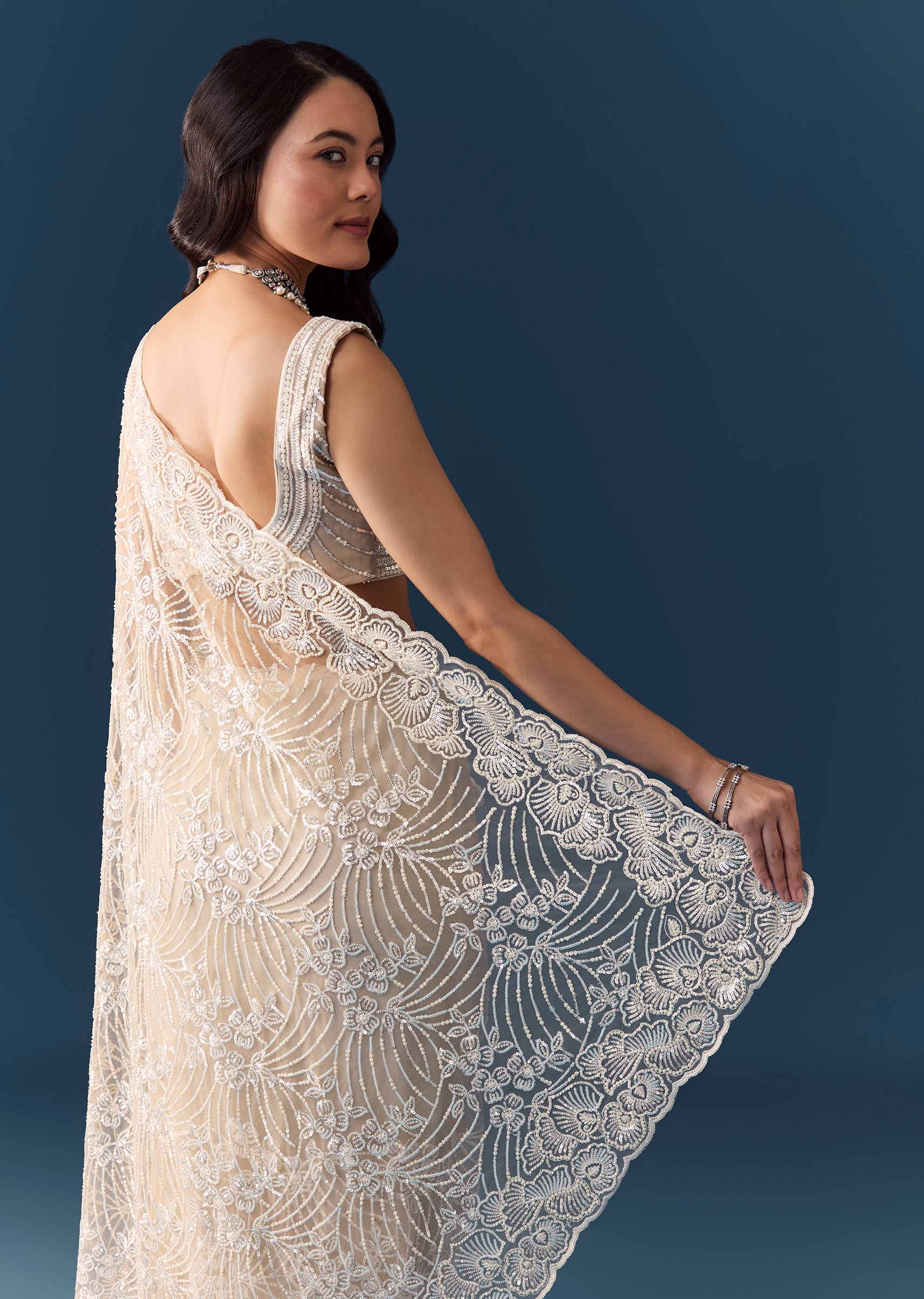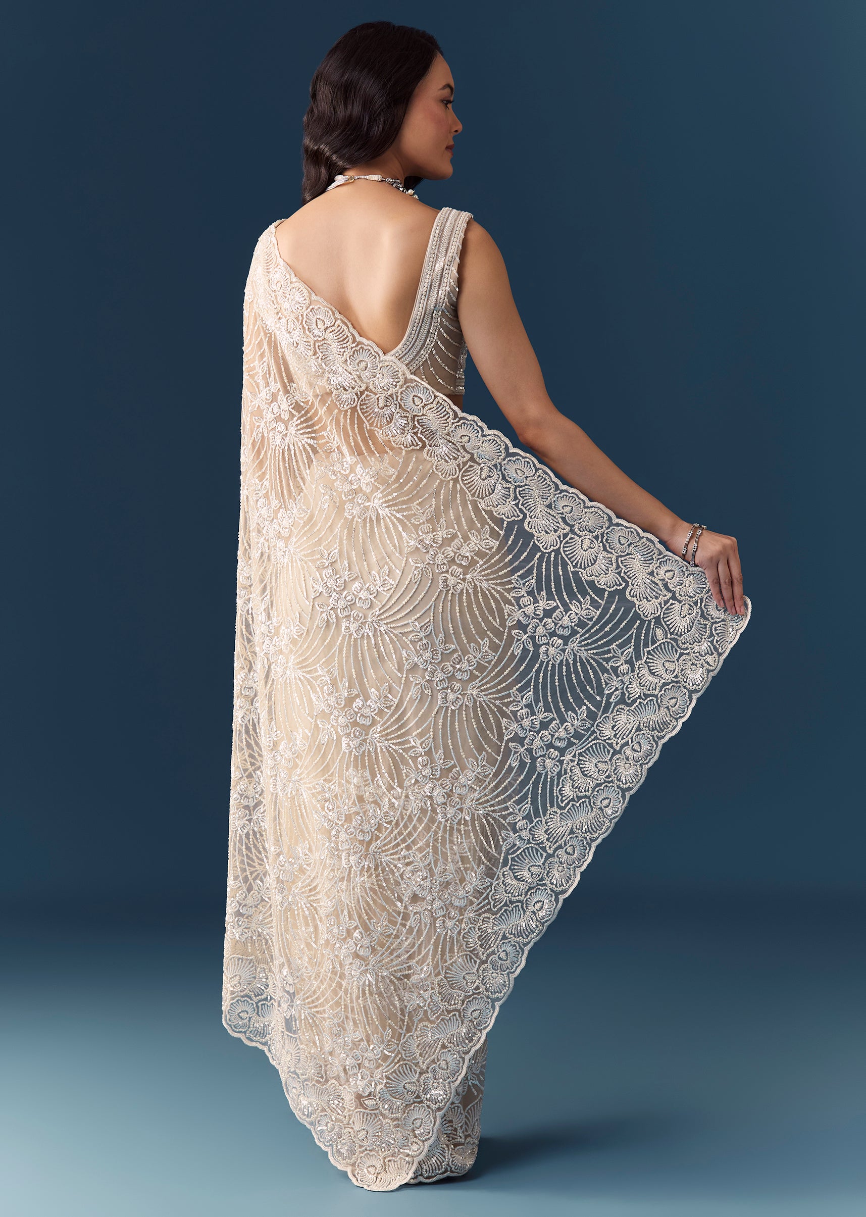 Beige Net Floral Jaal Sequin Work Saree with Unstitched Blouse