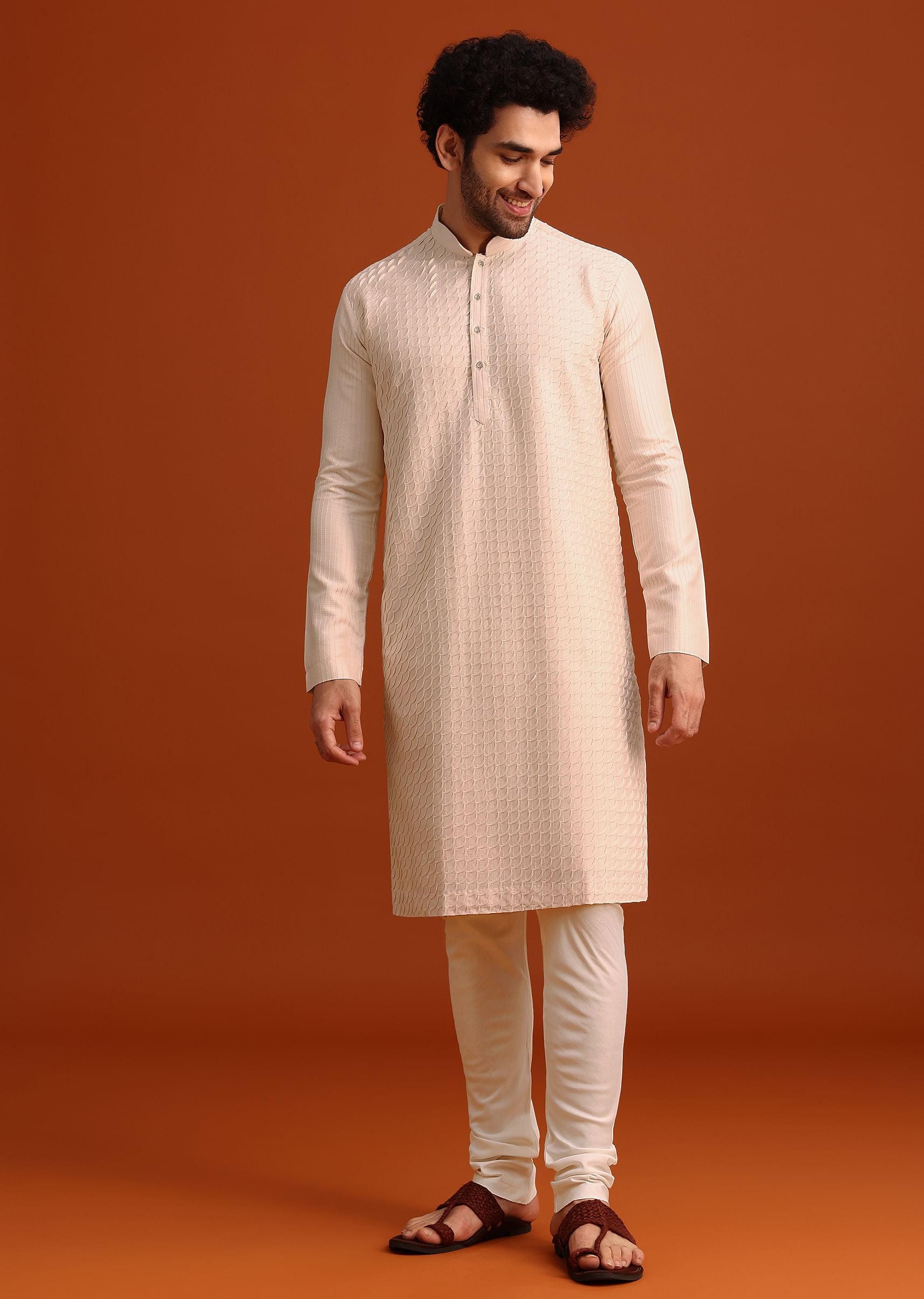 -  Thoughtfully desinged with a mandarin collar and full sleeves the earthy beige hue and skinfriendly silk fabric enhance its allure.