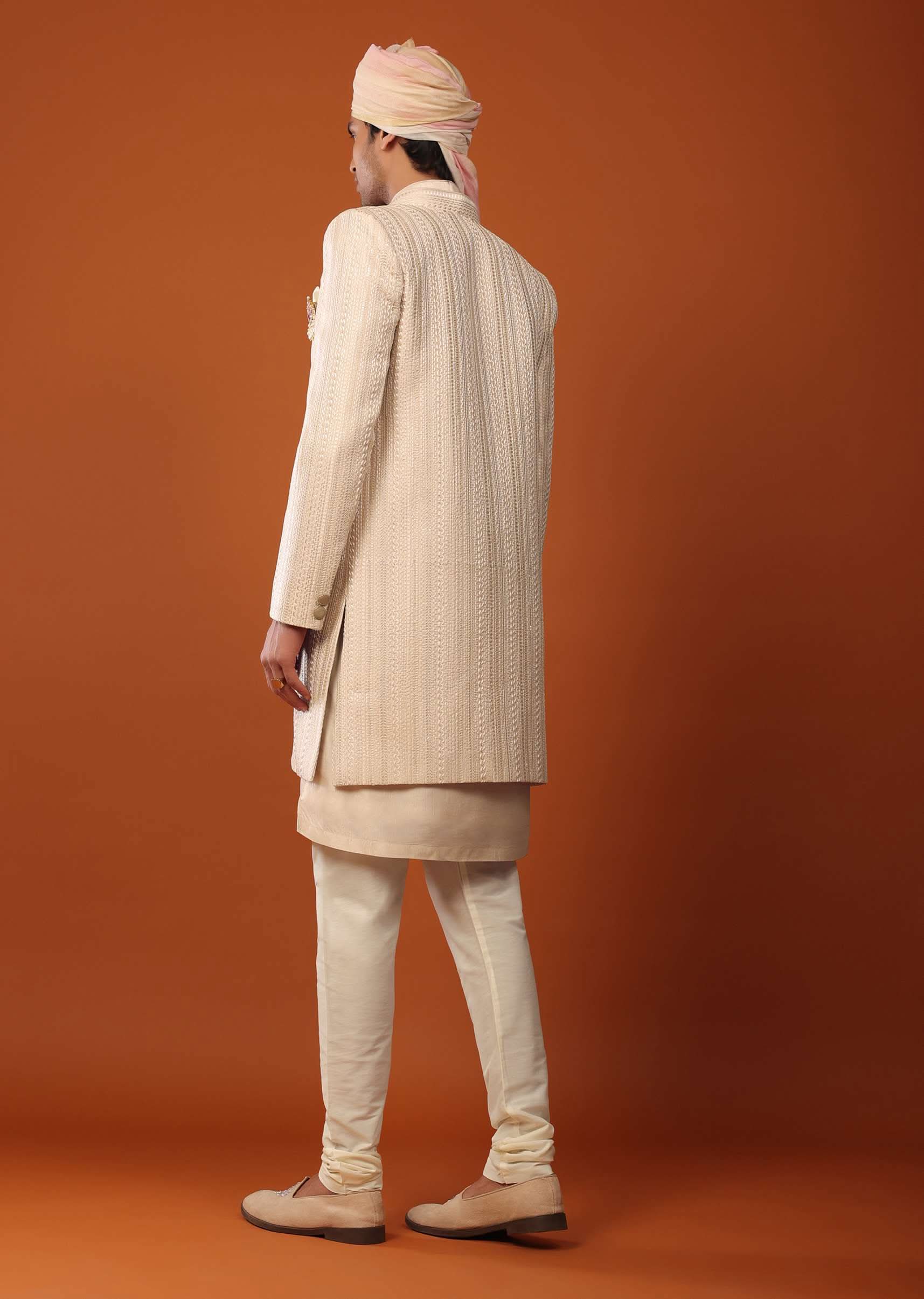 - Our beige silk sherwani is another addition to our quirky traditional outfits.