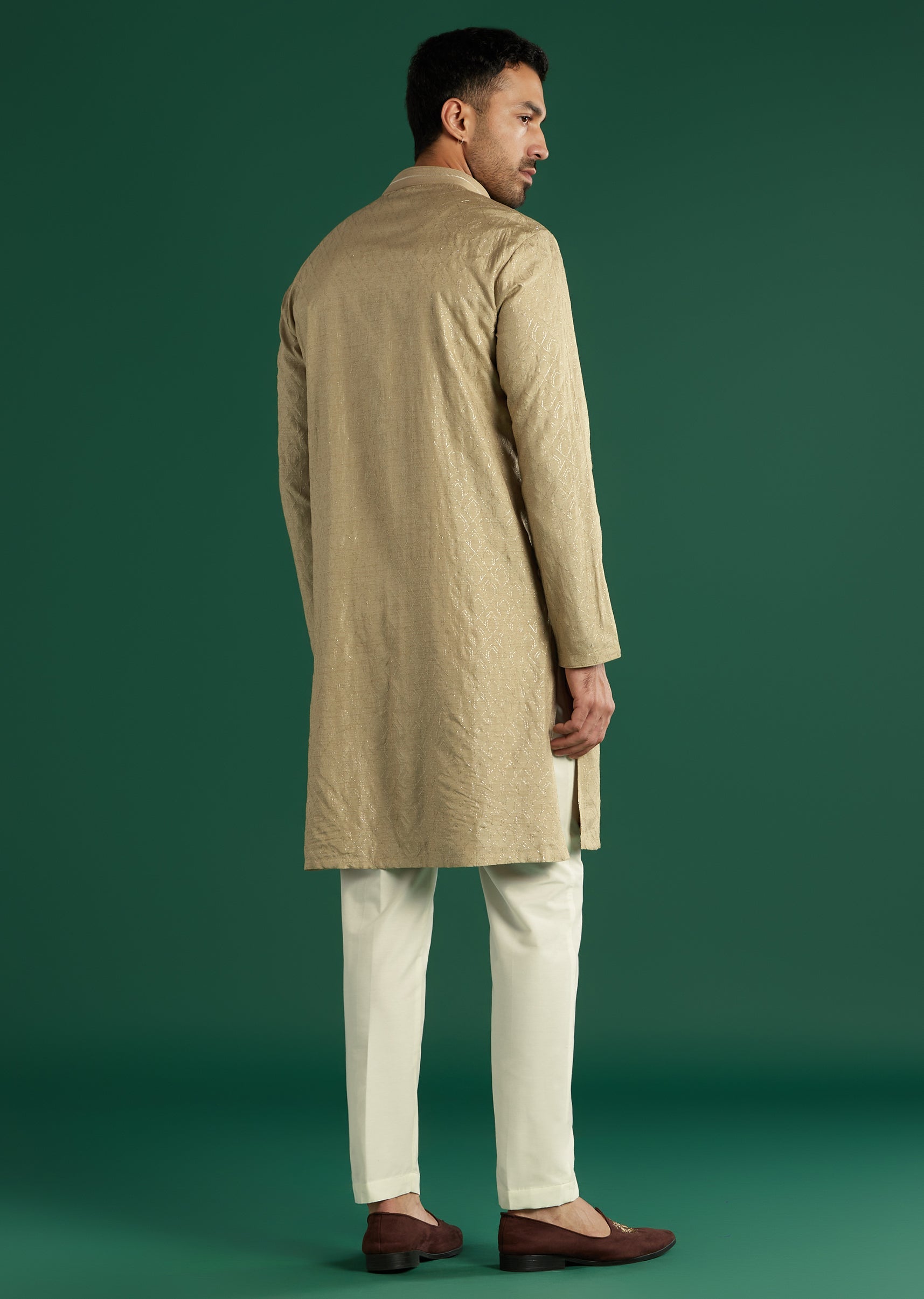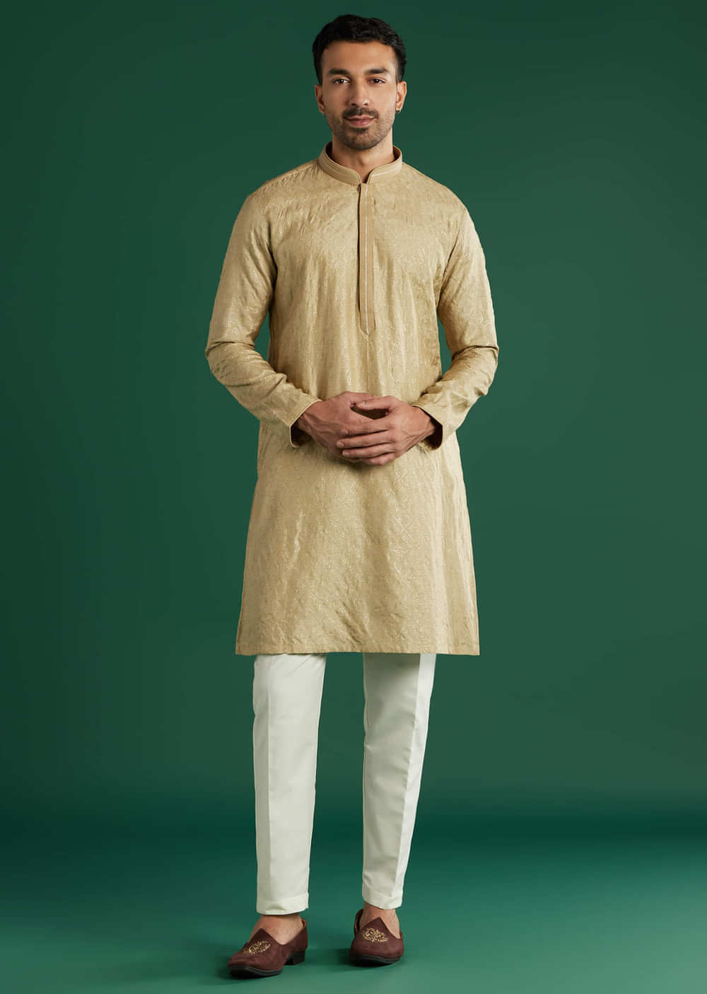 In a soft neutral palette, this beige art silk men’s kurta set brings a quiet woven texture that shows up gently under light. A band collar and clean placket keep the lines neat over a white churidar. Reach for it at Pooja Functions where simple, well-finished pieces feel most appropriate. Awarded as the Most Trusted Brand, we're delivering styles you love, just as promised.