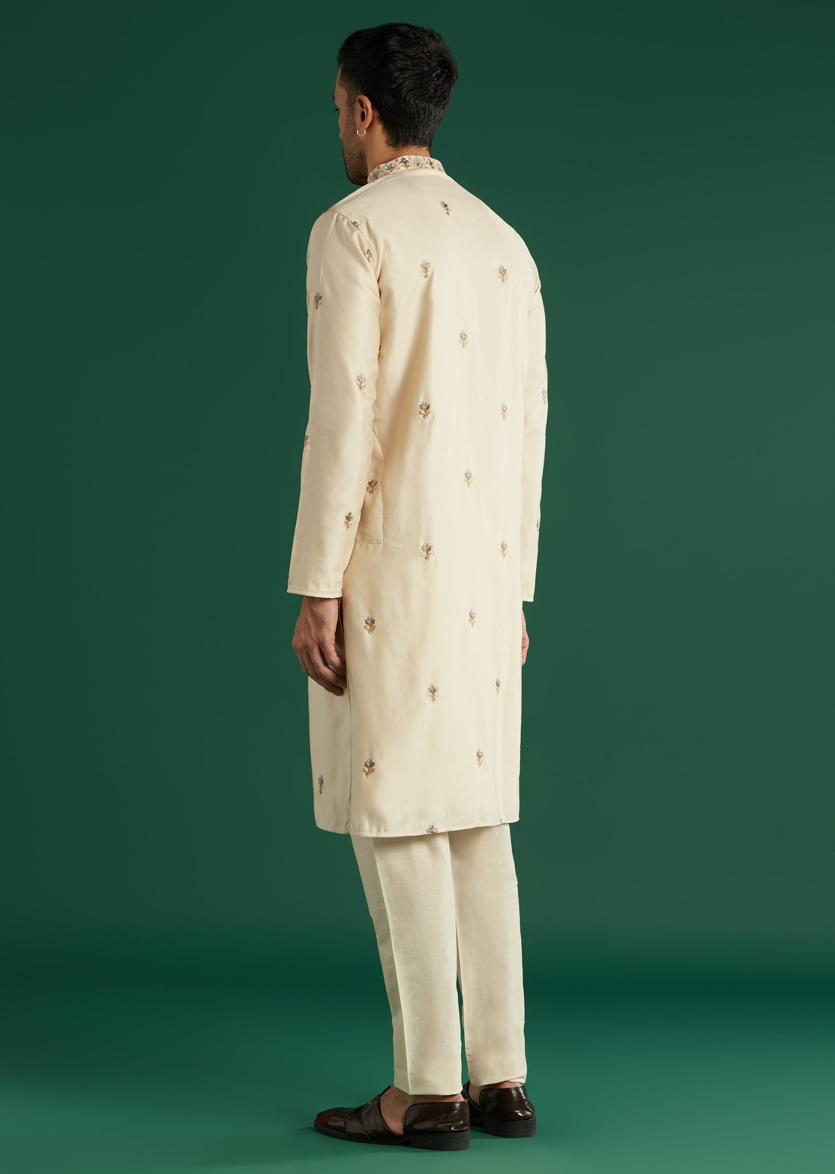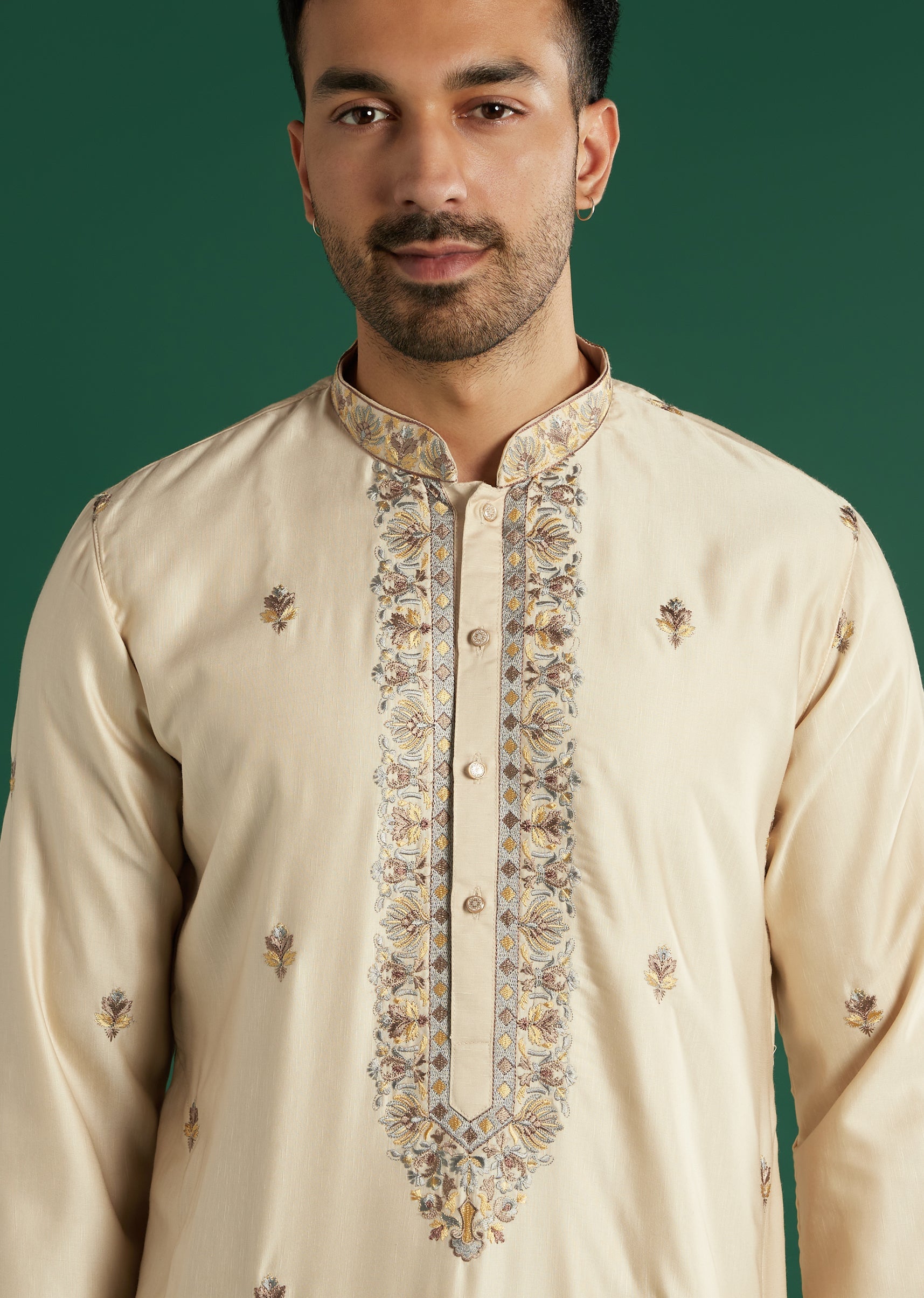 Calm in tone, this beige art silk men’s kurta set keeps the resham embroidery close to the neckline and chest for neat, precise definition. A multicolour floral dupatta draped over the shoulders brings colour and movement to the monochrome kurta and churidar. Pick it for Pooja and Festive Functions when a refined base with a statement dupatta is the brief. Awarded as the Most Trusted Brand, we're delivering styles you love, just as promised.