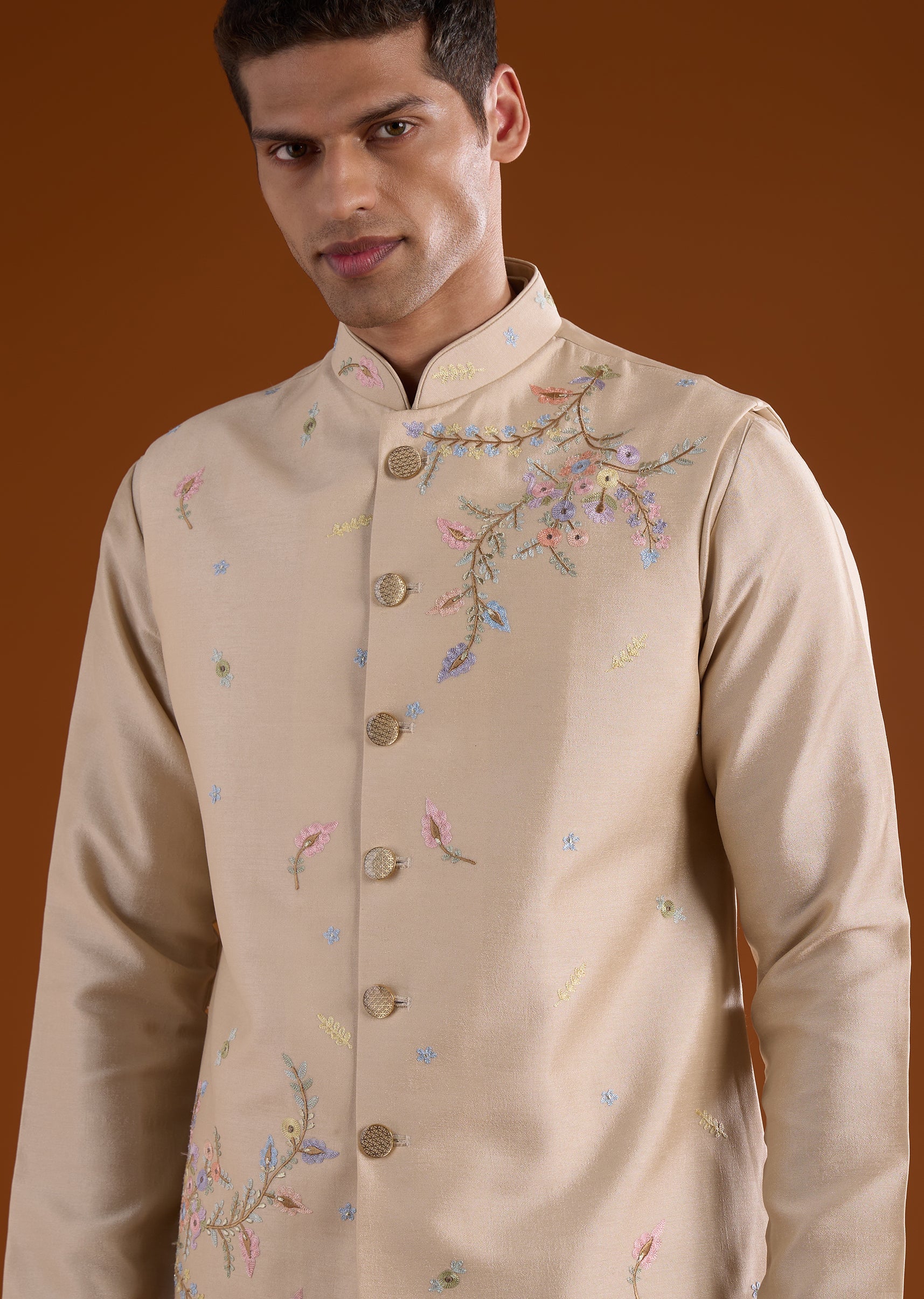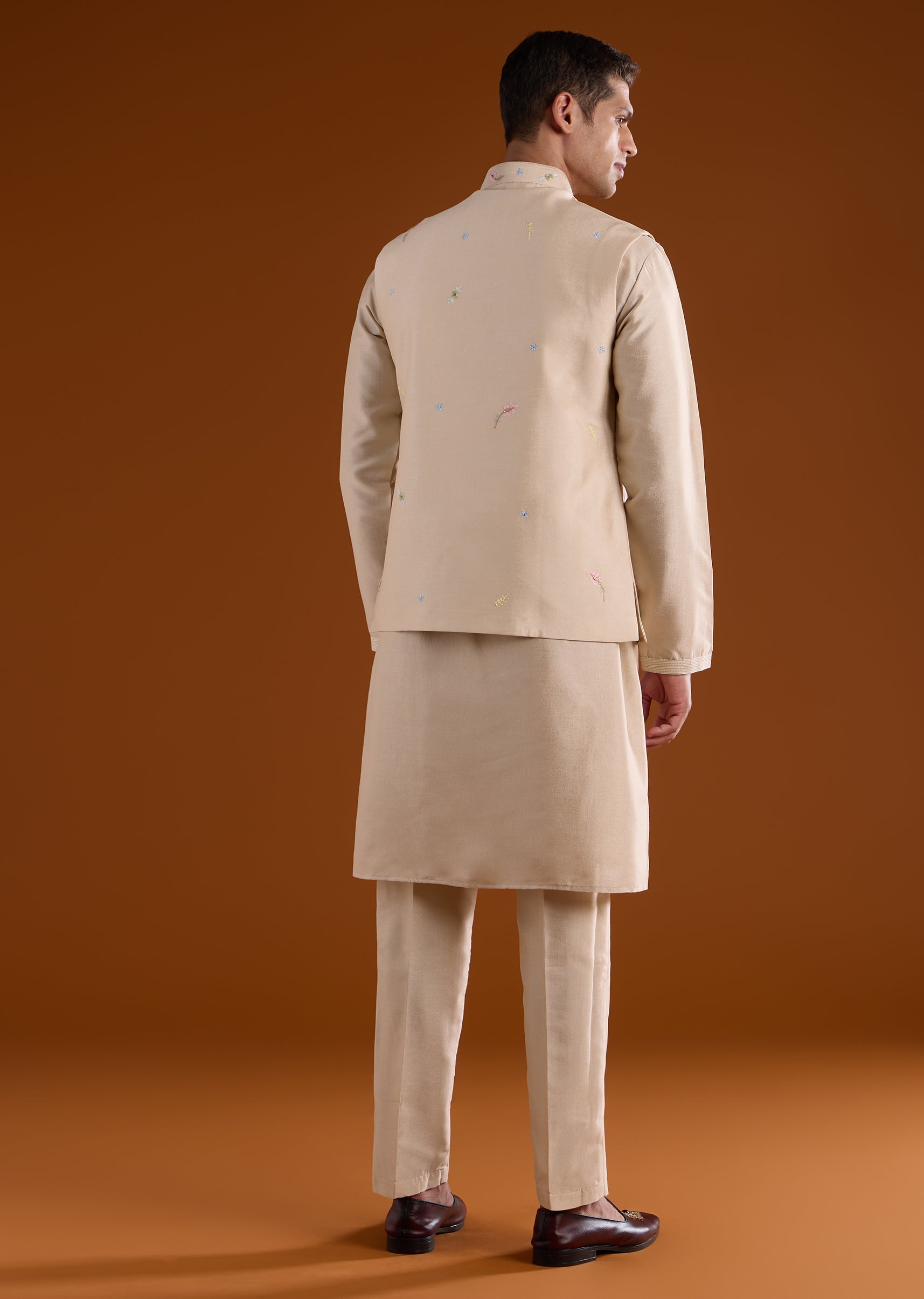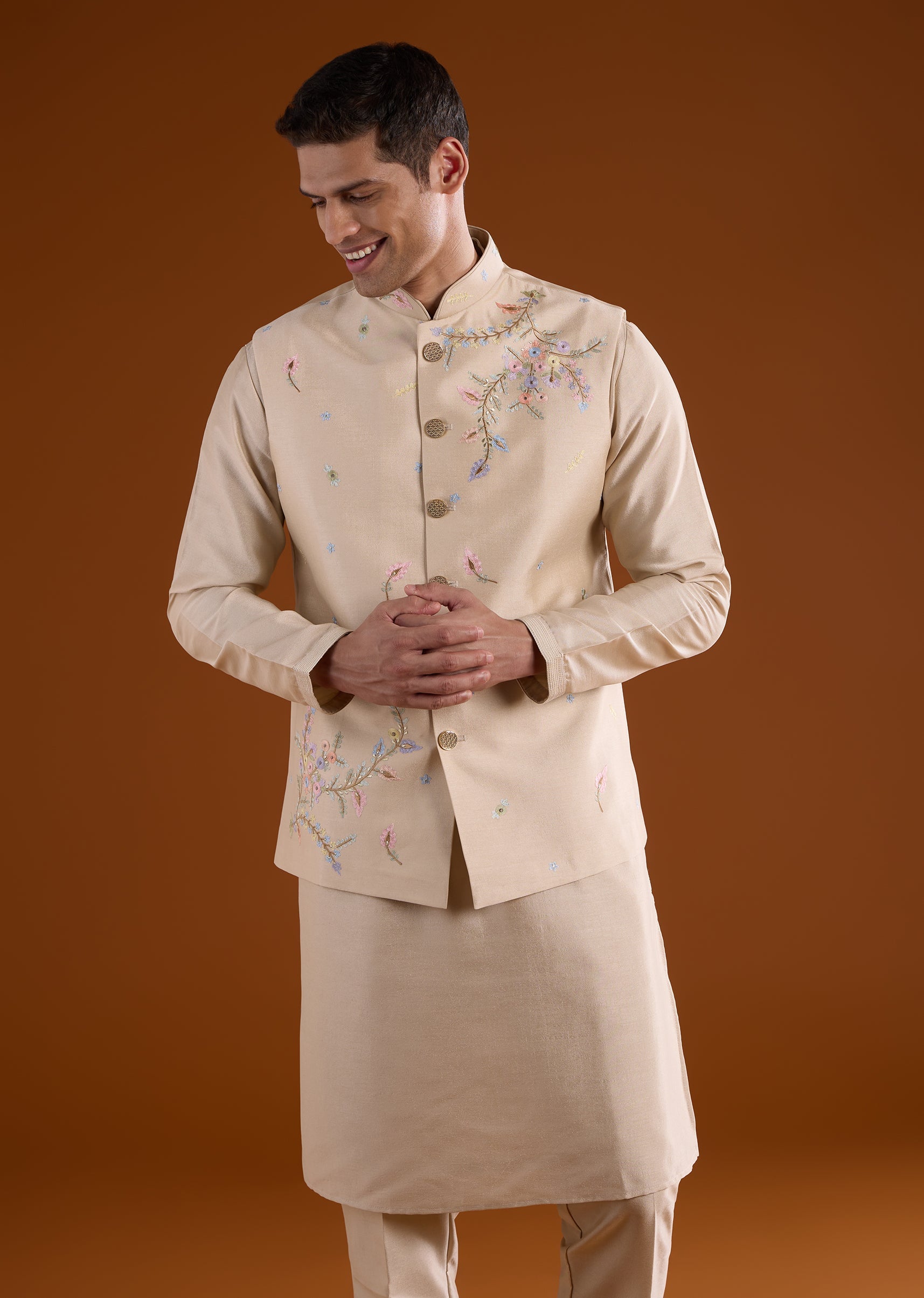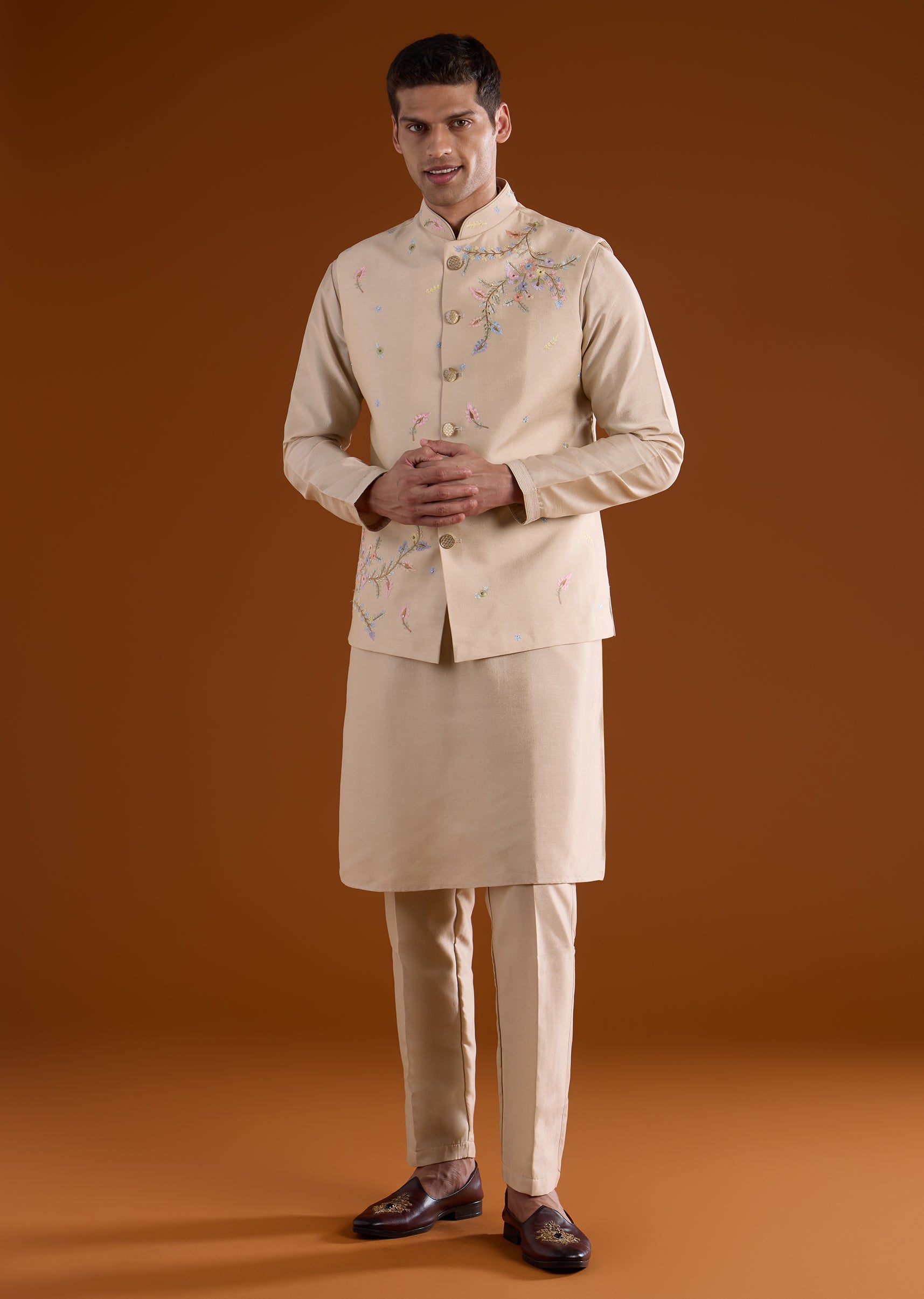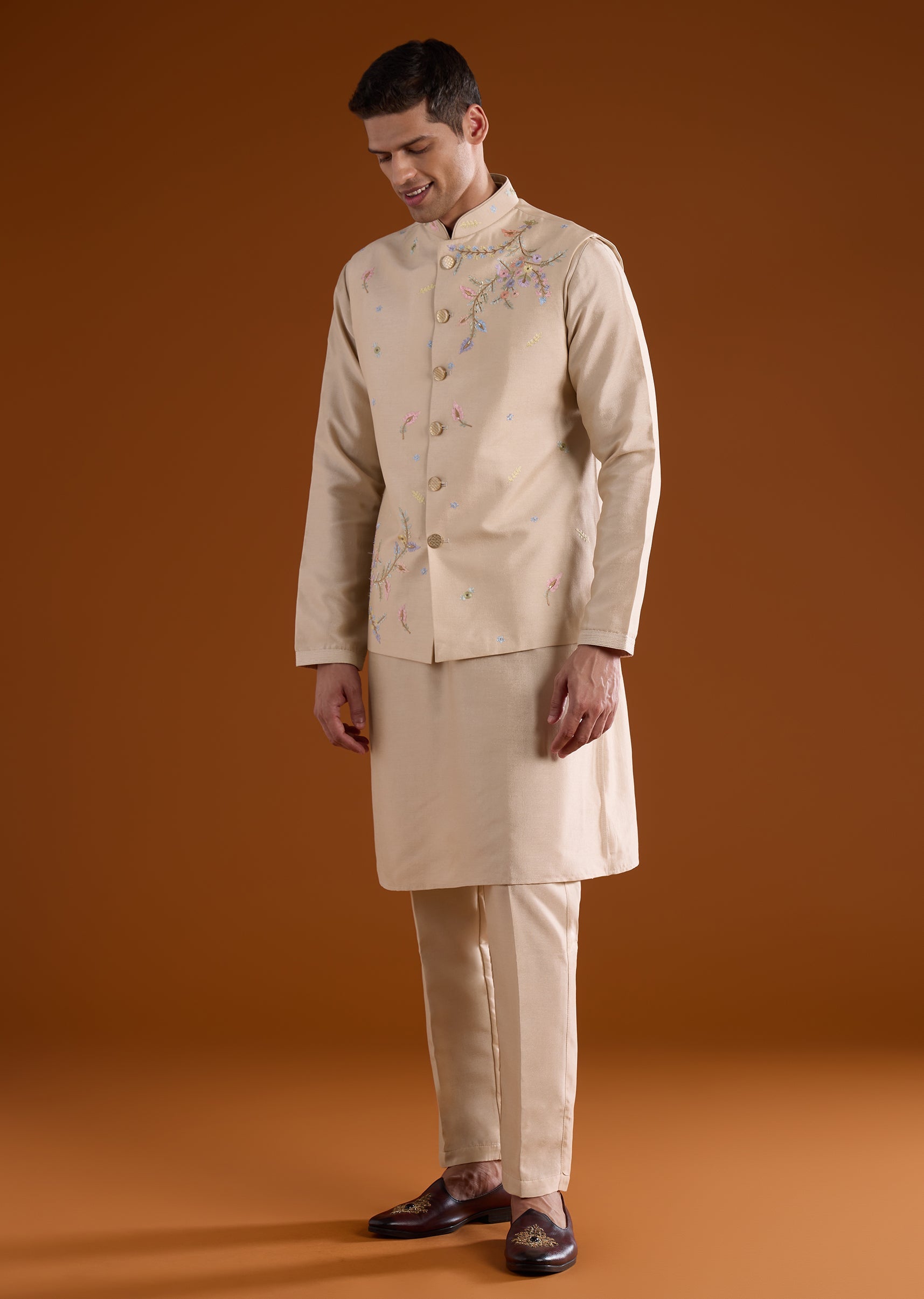 Beige Silk Mens Kurta Jacket Set With Thread And Motif Work