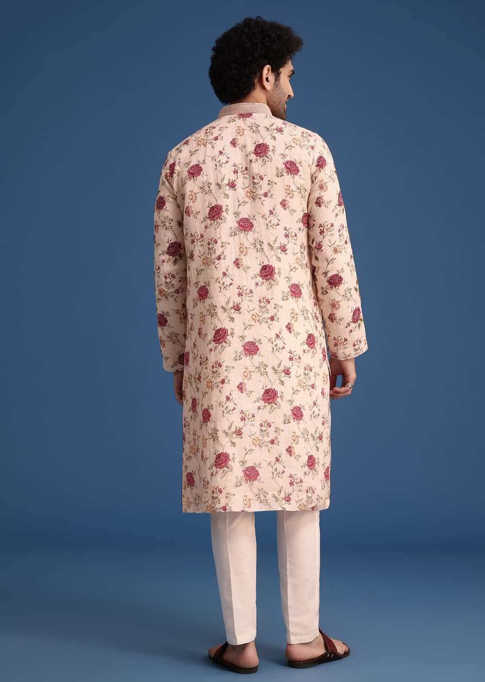 A Refined Beige Linen Kurta Set That Boasts Floral Motifs Woven Seamlessly Into Its Luxurious Fabric. The Understated Charm And Intricate Detailing Make It A Timeless Addition To Any Ethnic... More Product Details