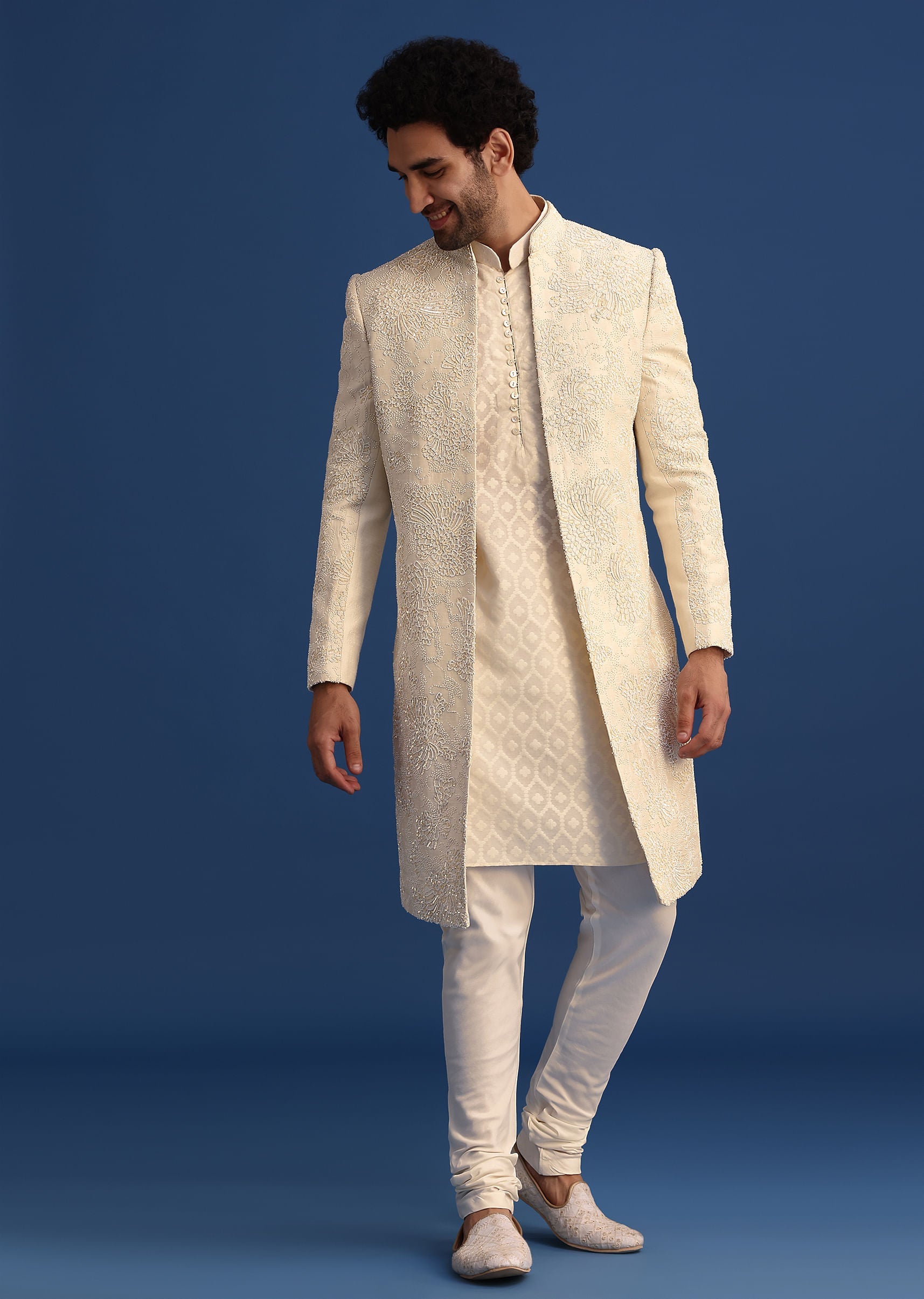 -  Comfortable and easy-to-wear, the beige sherwani is enriched with intricate zardozi work all over.