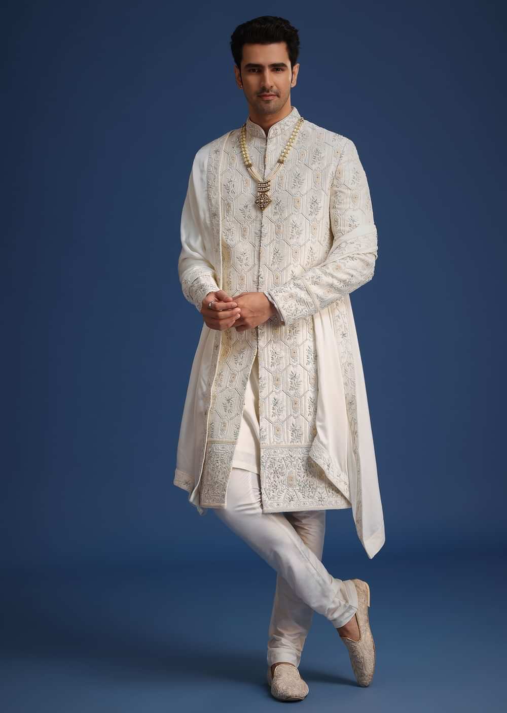 - Adorned with sequin, pearls and patchwork, this beige silk sherwani set redefines traditional glamour.