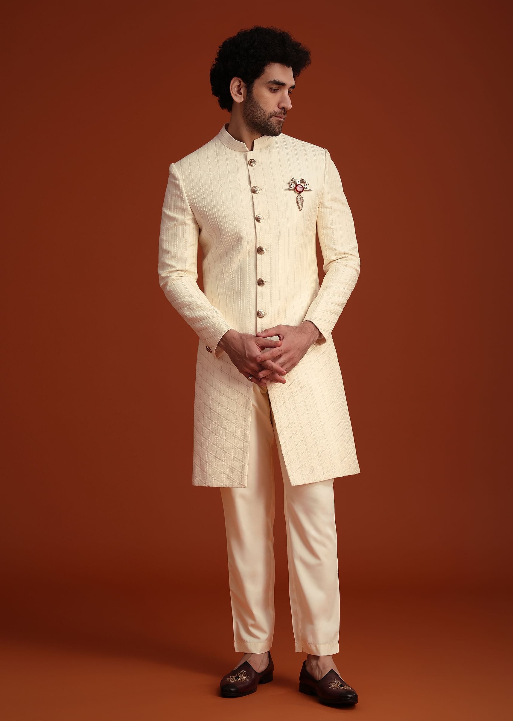 - A stunning display of rich embroidery and luxurious textures is this sherwani set.