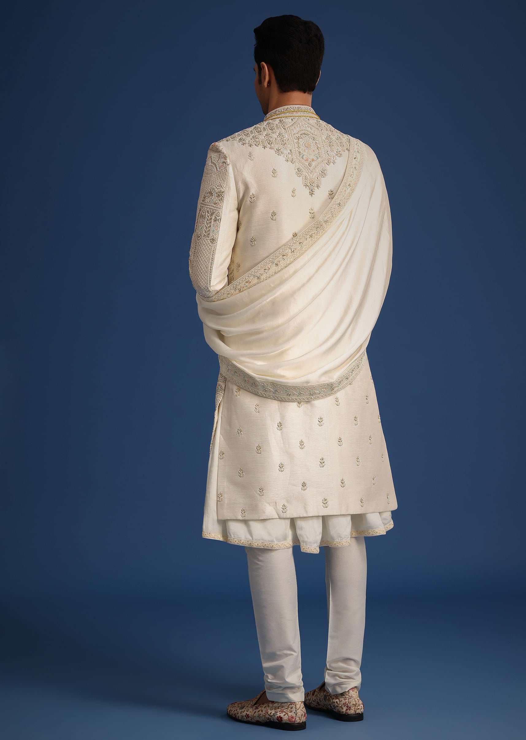 - Elevated with hand embroidery, the sherwani is decked with delicate cutdana, pearls, stone, sequin and French notes.
