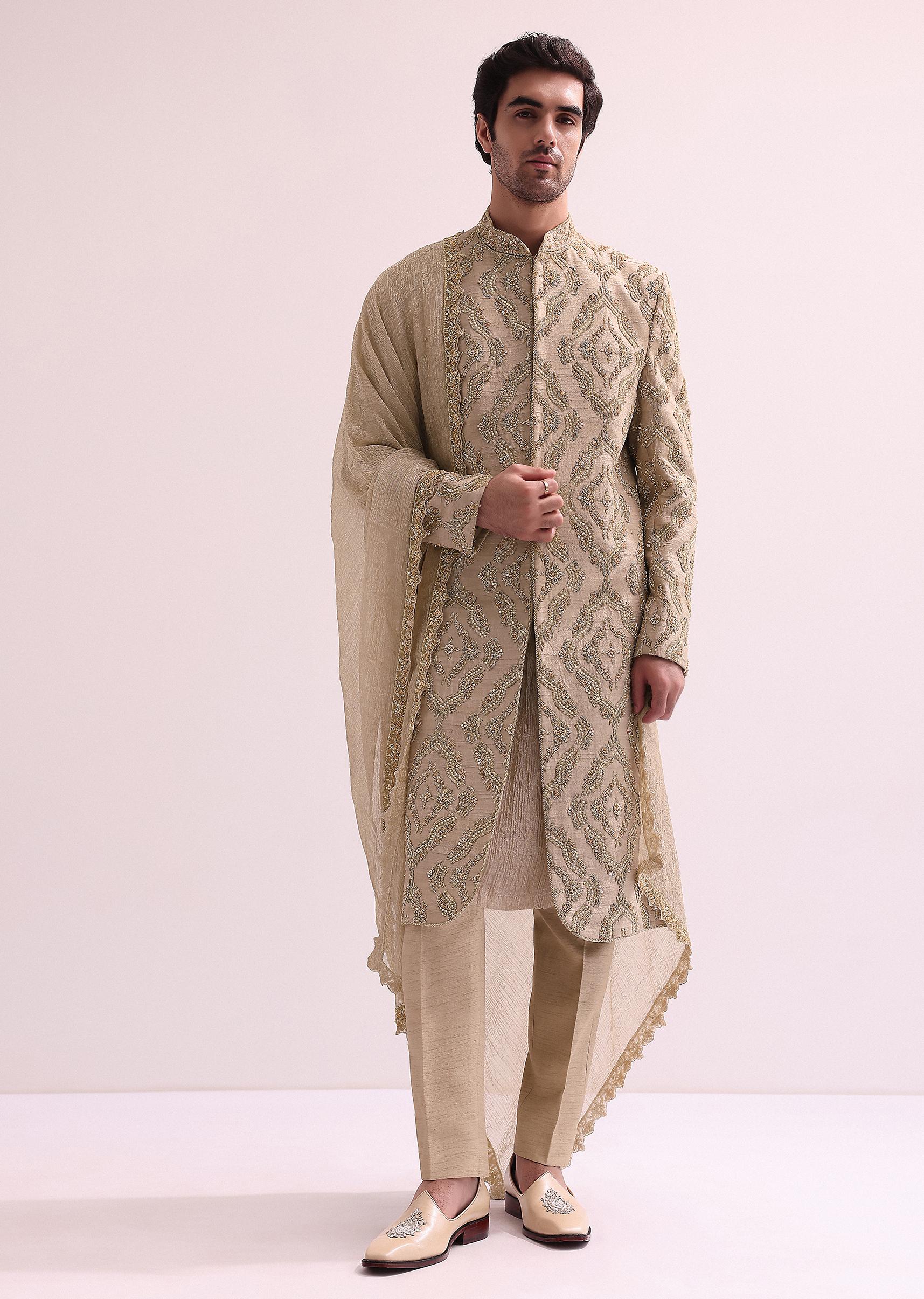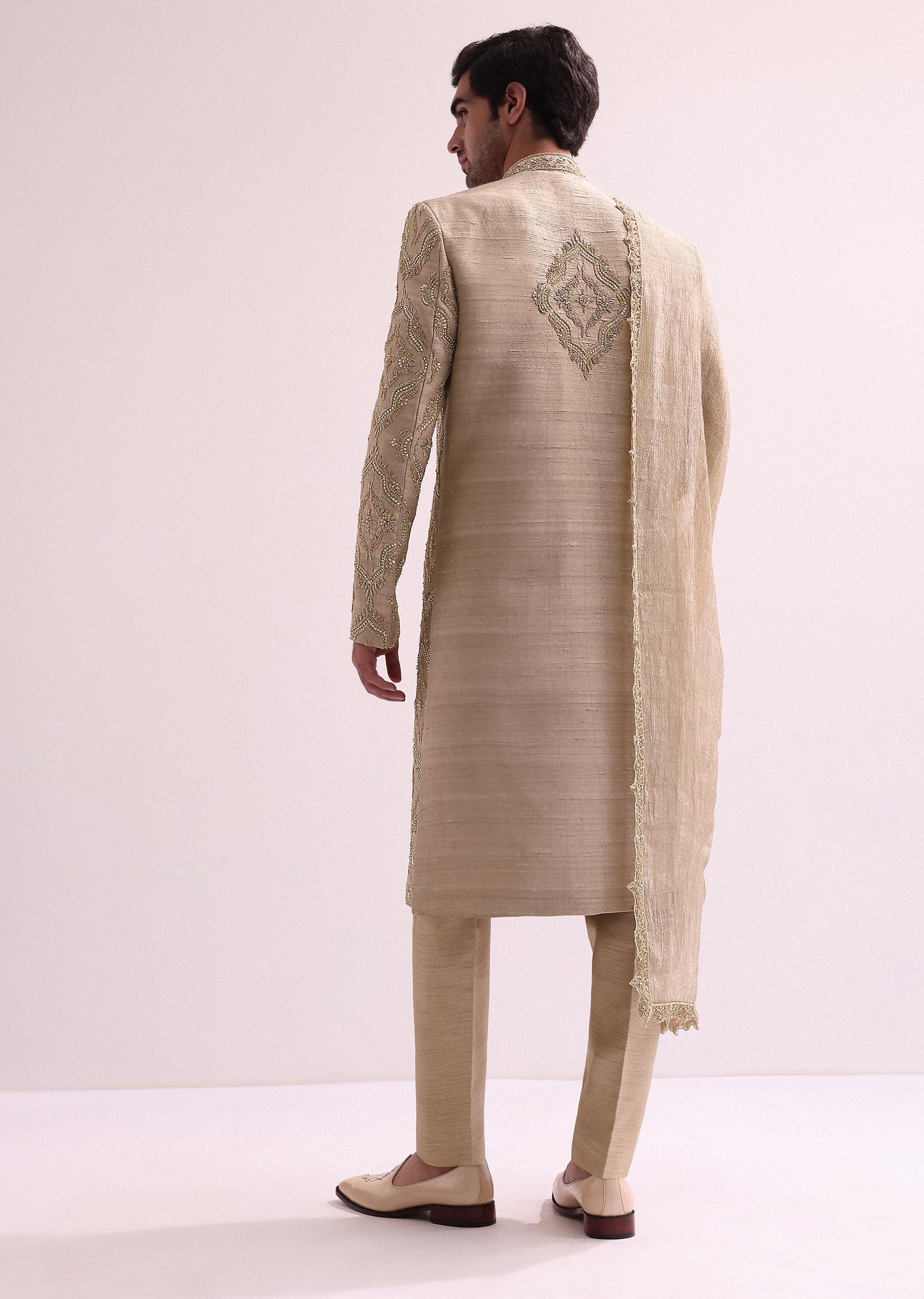 - Showcasing an exquisite design and stunning artistry this beige sherwani set ensures an alluring look.