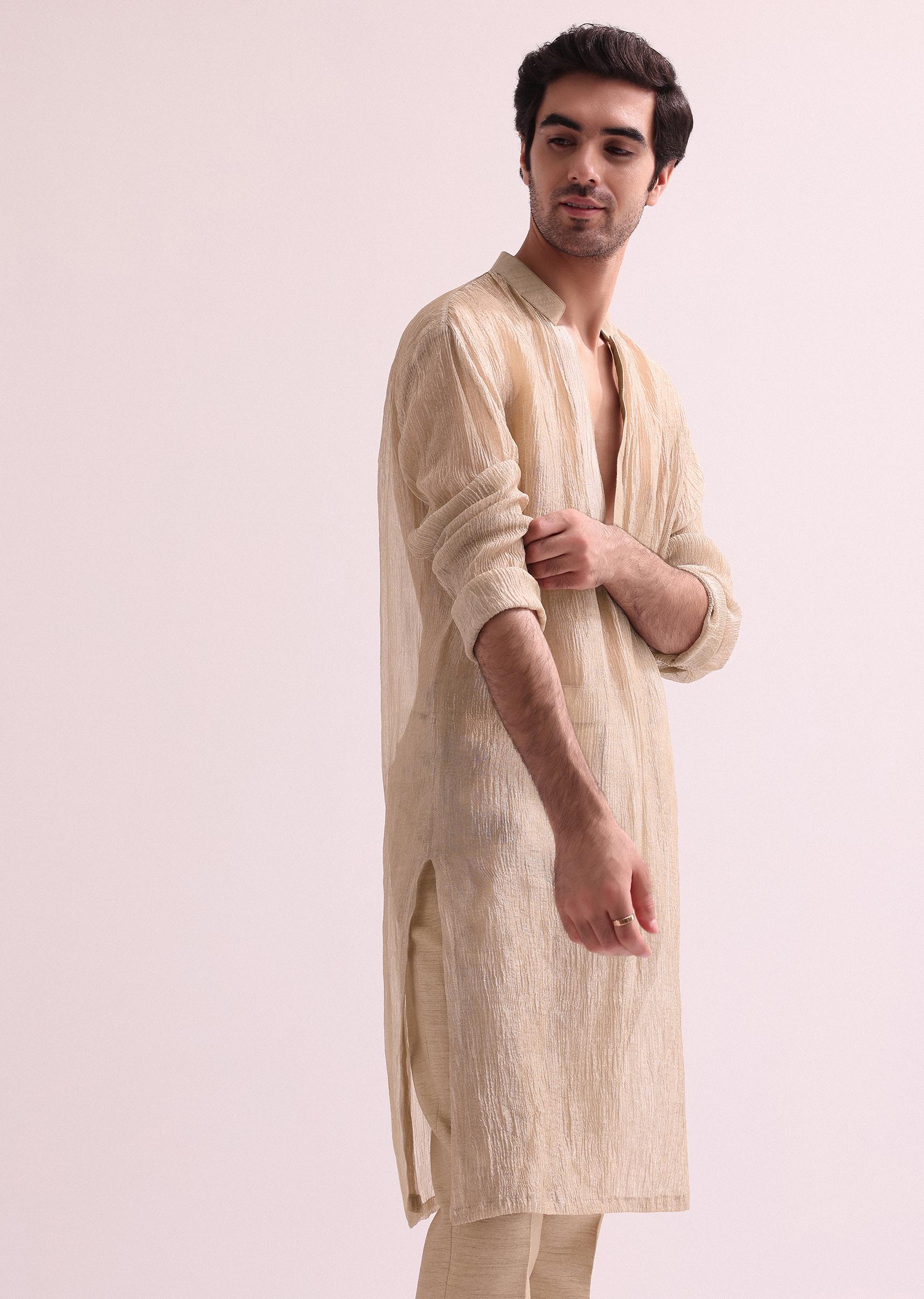 Beige Straight Cut Double Layered Sherwani And Kurta Set In Raw Silk