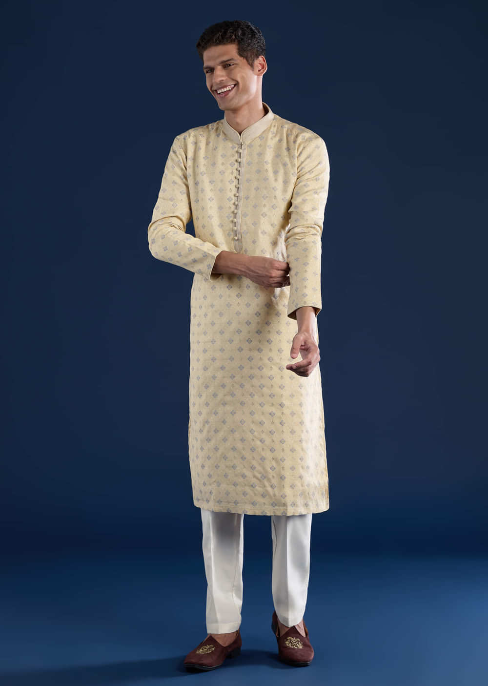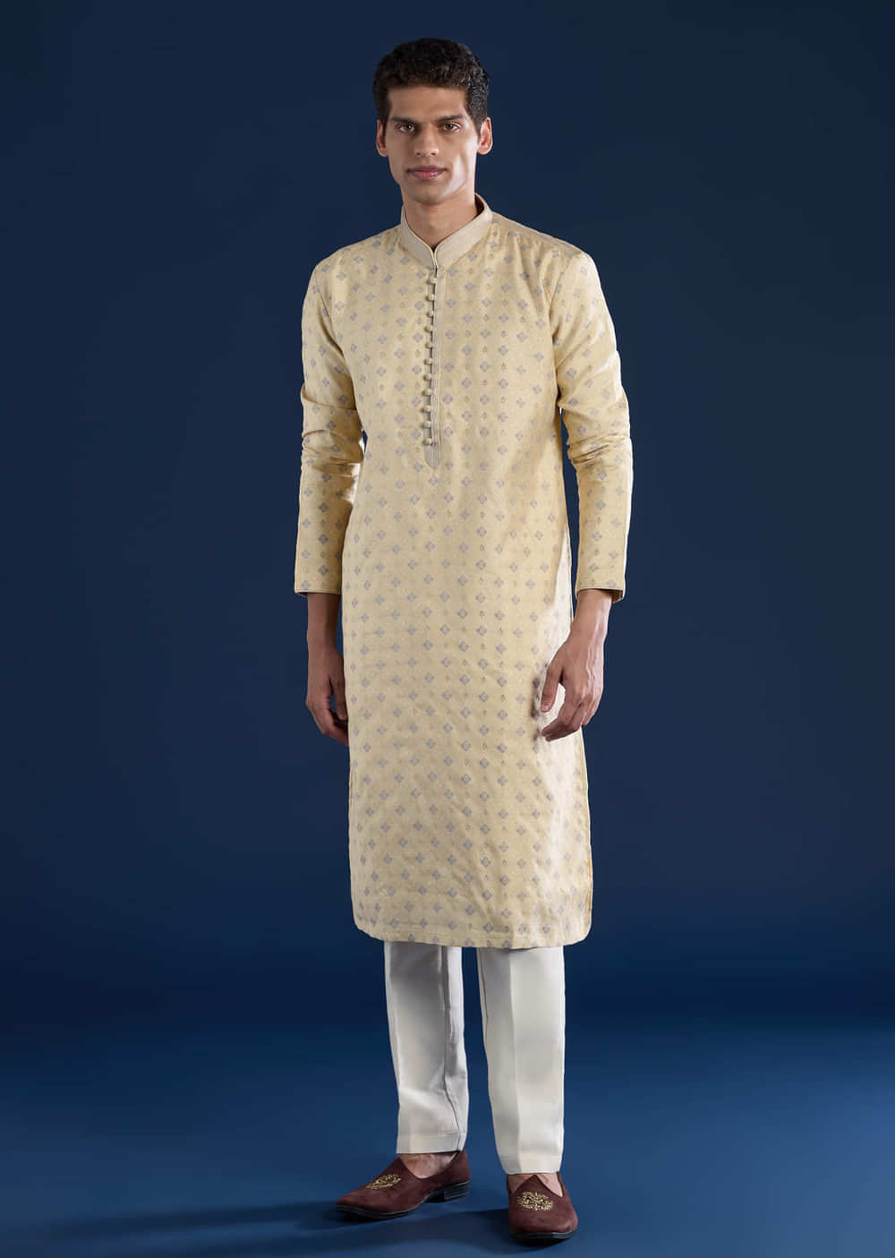 Exude festive elegance in this stunning men's beige kurta and pant set. The luxurious jacquard fabric, with its intricate woven texture, lends depth and richness, while the vibrant hue adds a touch of modern sophistication. Ideal for celebrations from day to night, this ensemble beautifully blends timeless grace with contemporary style. Awarded as the Most Trusted Brand, we're delivering styles you love, just as promised.