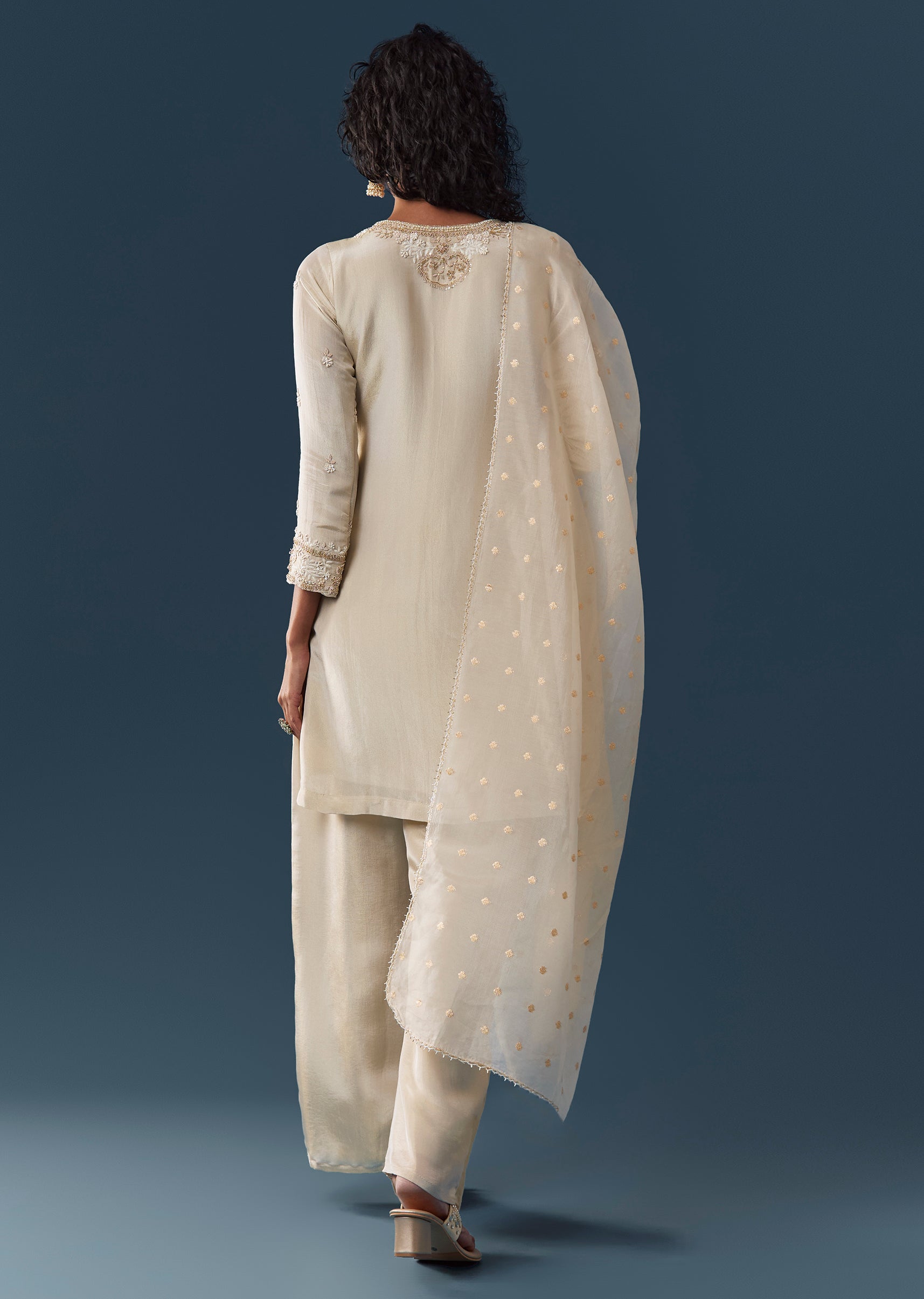 Crafted in luminous tissue fabric, this classic straight kurta set is elevated with zardosi, thread and moti embroidery for a festive-ready look. The kurta features a keyhole neckline and 3/4th... More Product Details