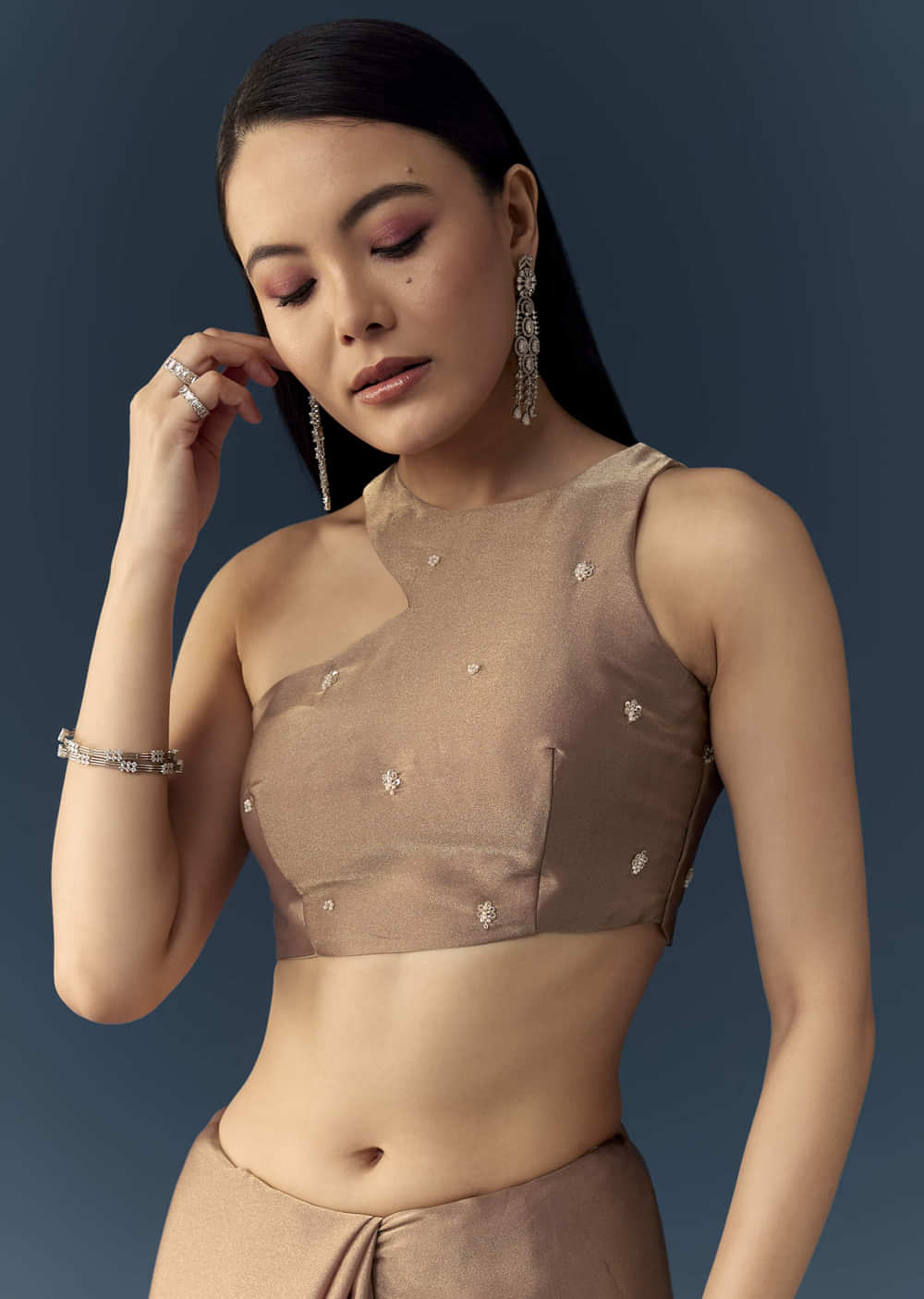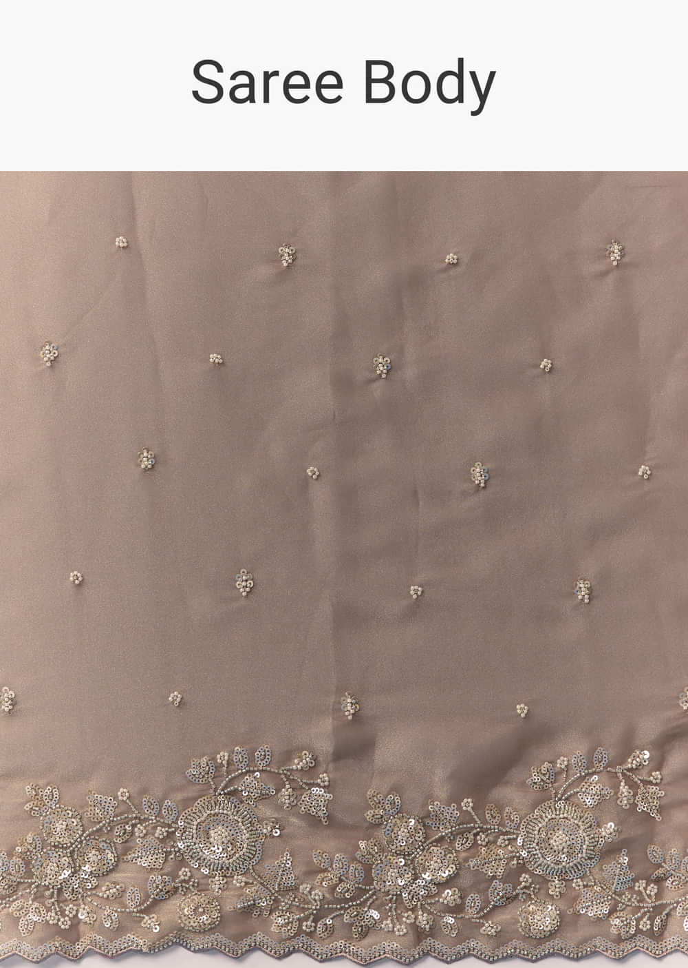 Exude timeless charm with this beige tissue organza saree in a rich dark beige tone, featuring an elegant cutwork border and intricate all-over embroidery with cutdana, sequins, and beads. The... More Product Details