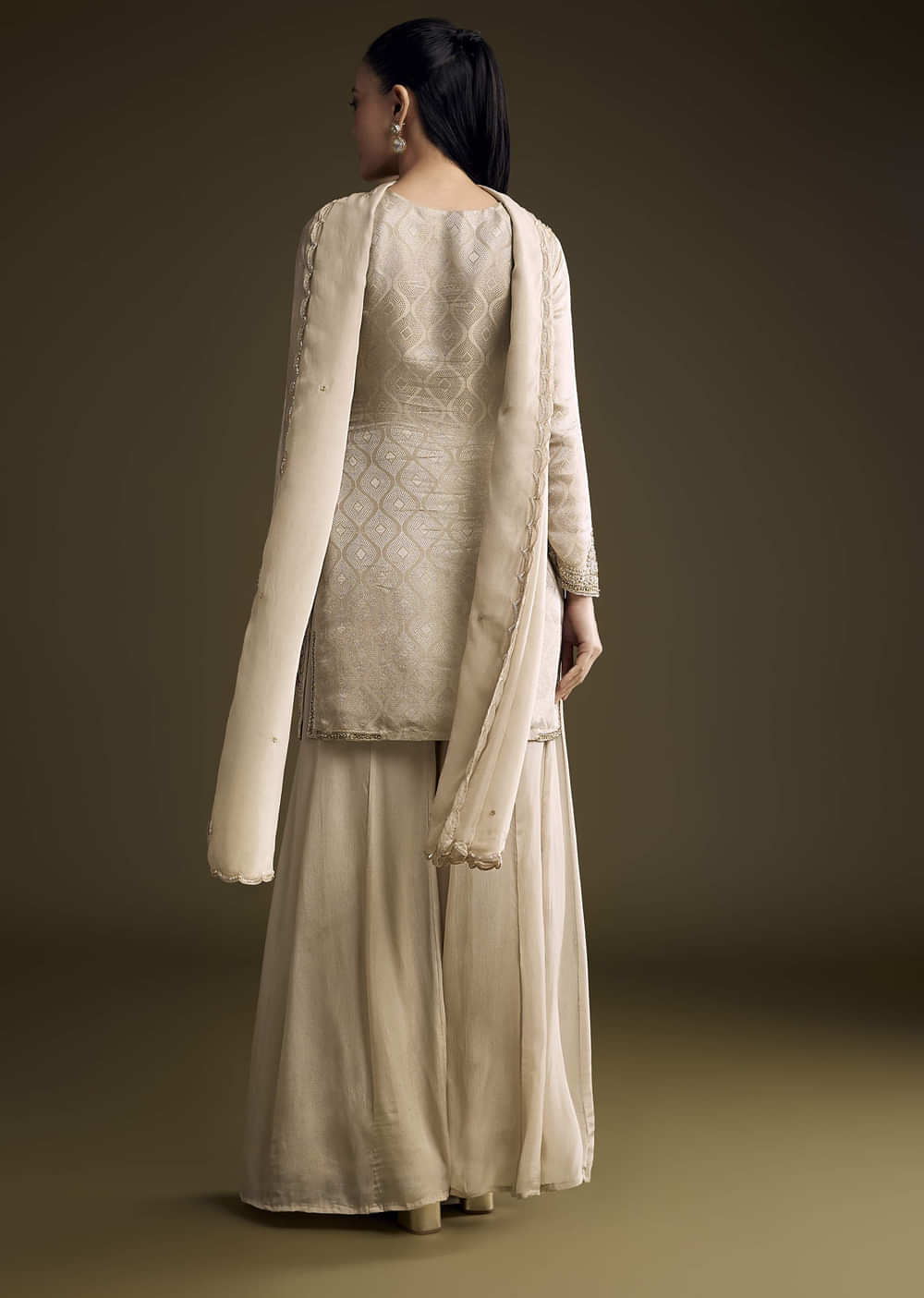 Beige Tissue Palazzo Suit With Banarasi Weave And Sequins Embroidery