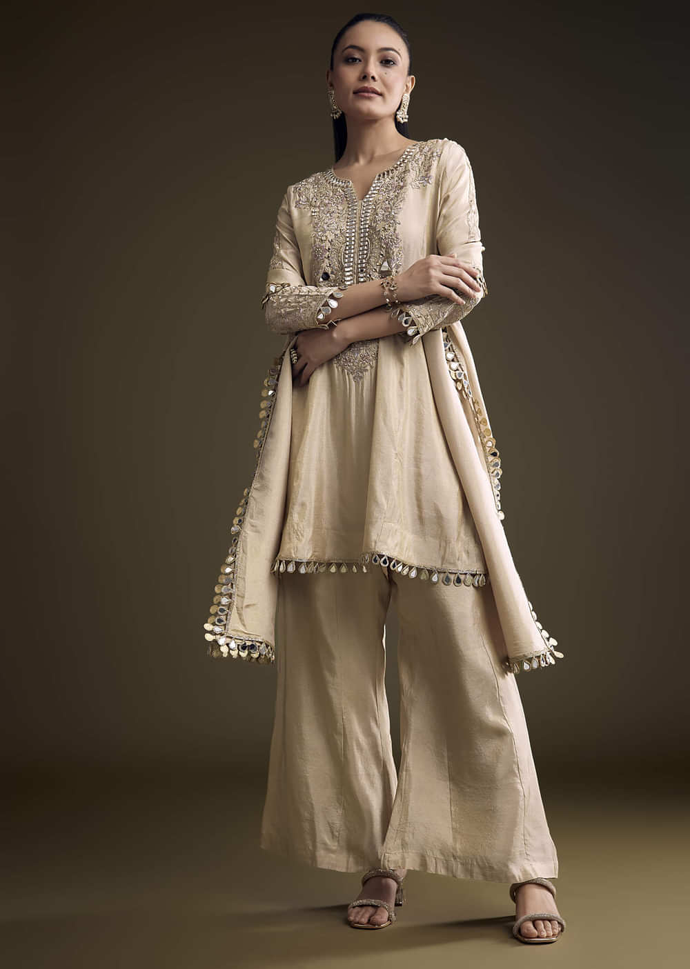 Beige Tissue Palazzo Suit With Mirror And Zari Embroidery