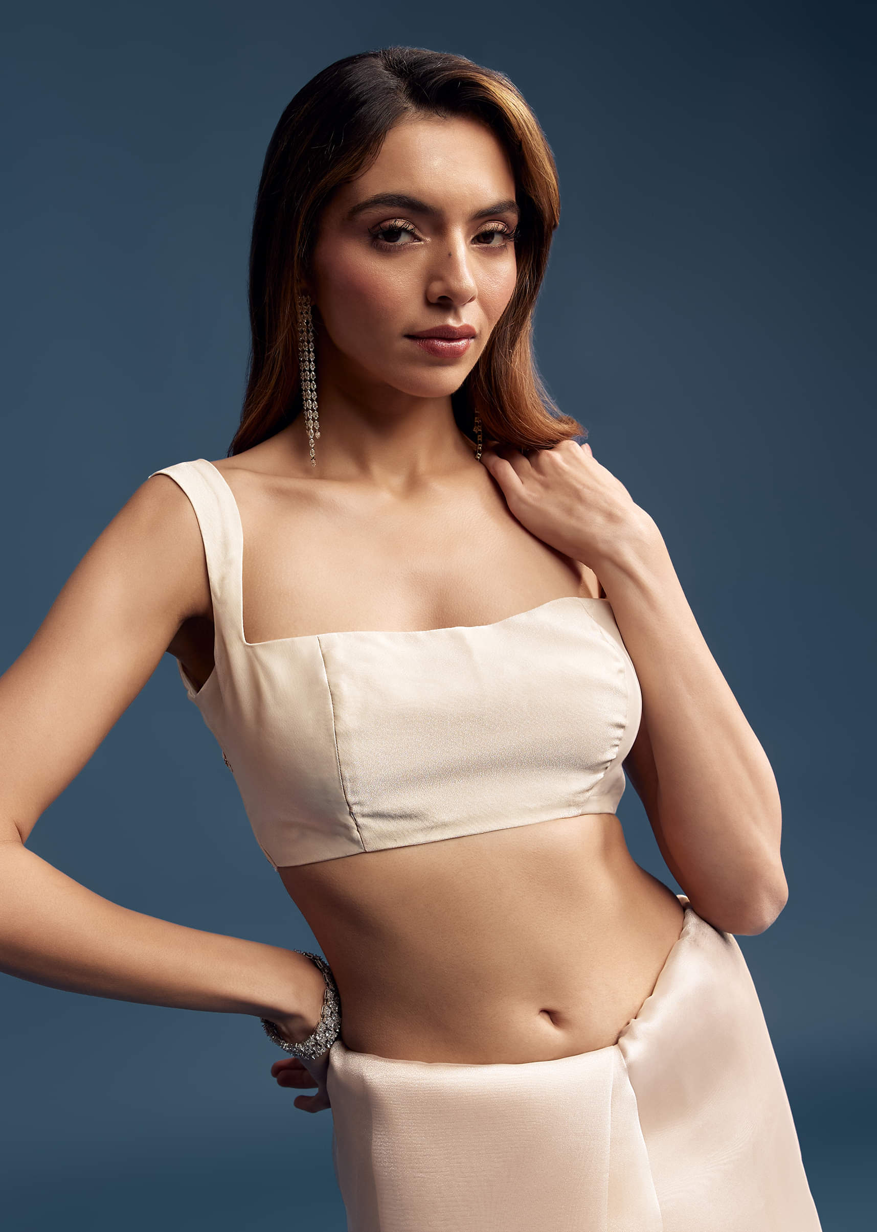 Fit Tips:Opt for a sqaure neck sleeveless blouseto add a hint of drama. Drape it in a seedha pallu style to highlight the embroidered border, especially effective if you’ll be moving around a lot.