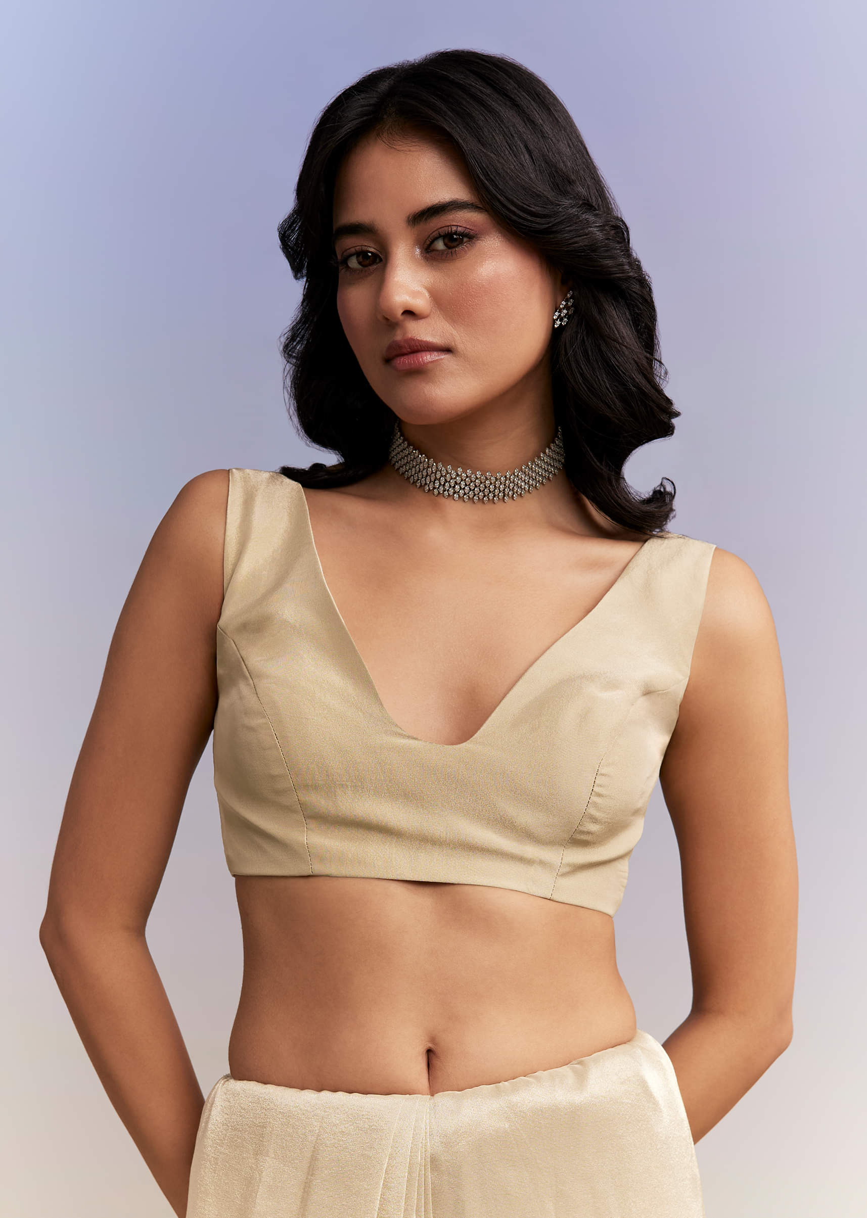 Pair with pearl chandbalis, a sleek bun and metallic sandals; carry a champagne potli.