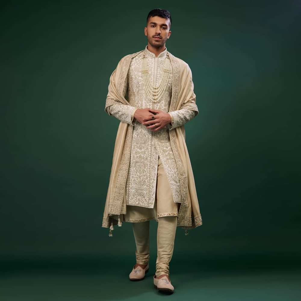 - The sherwani is crafted in beads, cut dana, and thread embroidery, has full sleeves and a mandarin collar with a front closure.