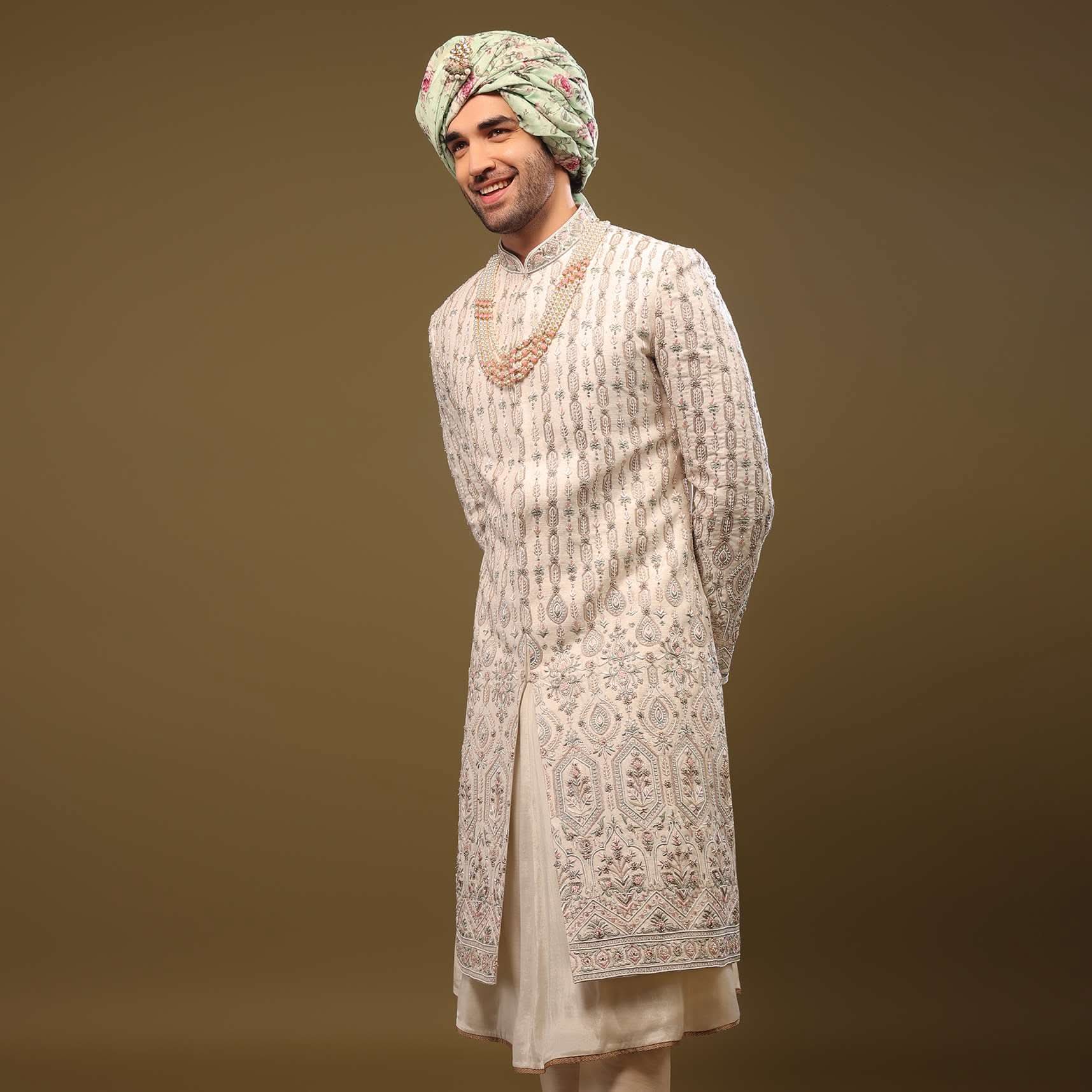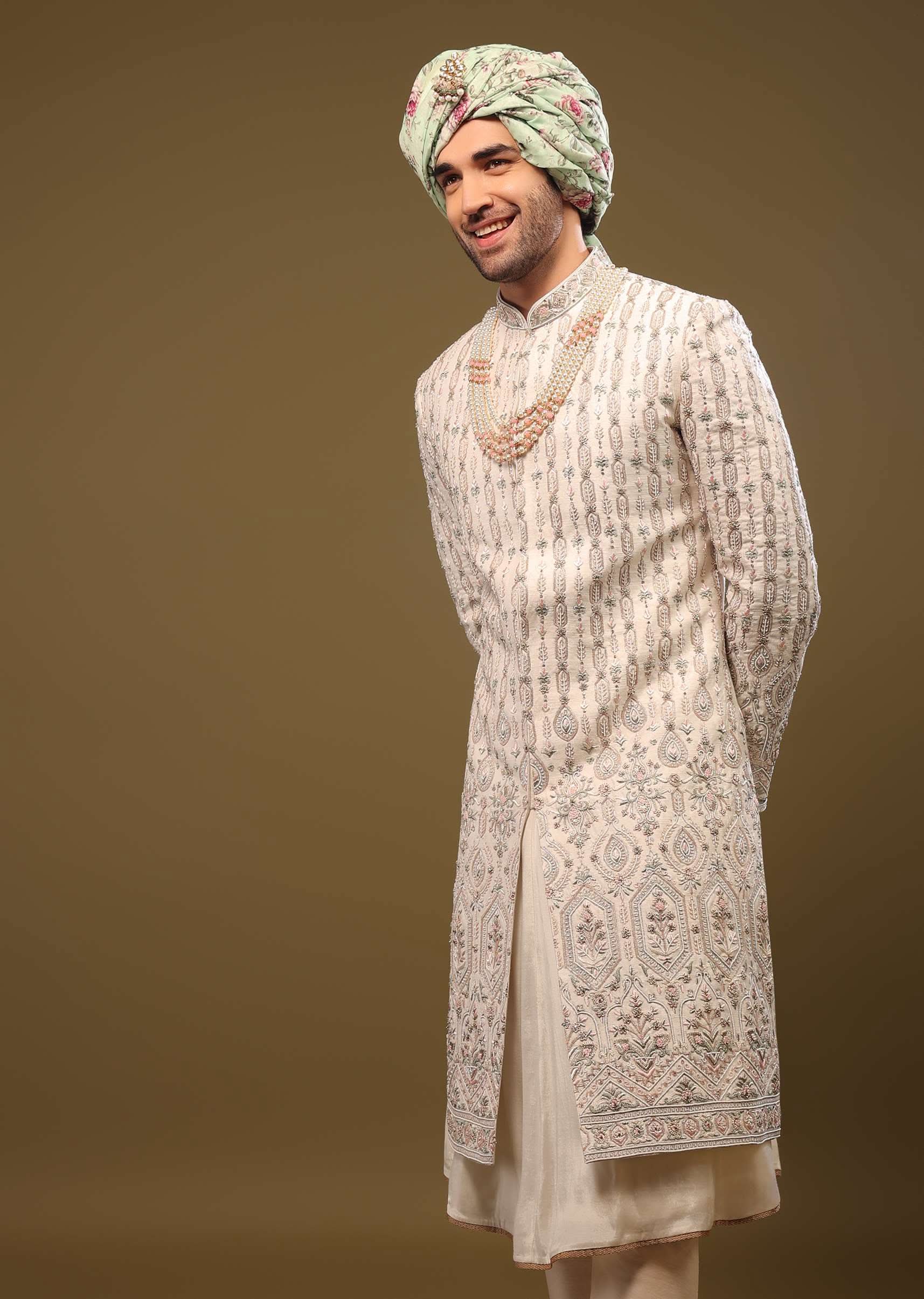 Beige White Thread Embroidered Silk Sherwani Set With Zari And Beads