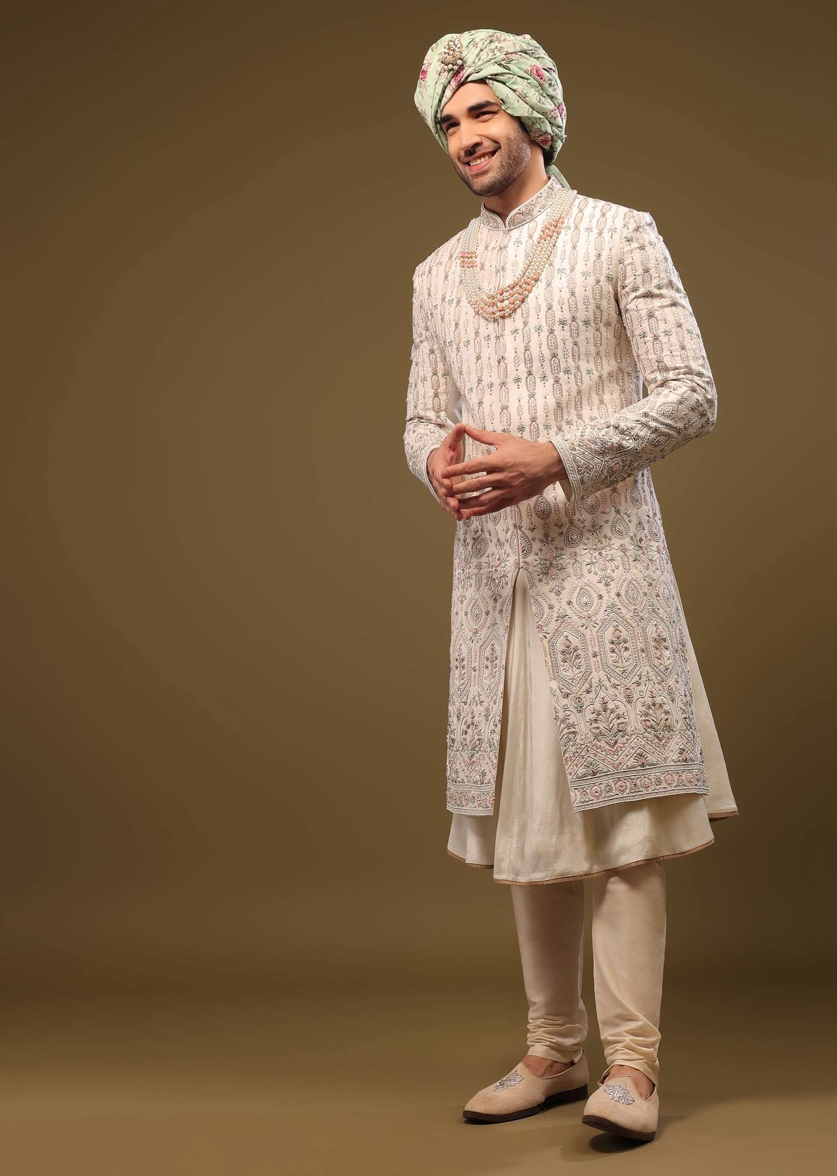 - An elegant star white sherwani set fabricated in silk, crafted in zari, beads and thread embroidery.