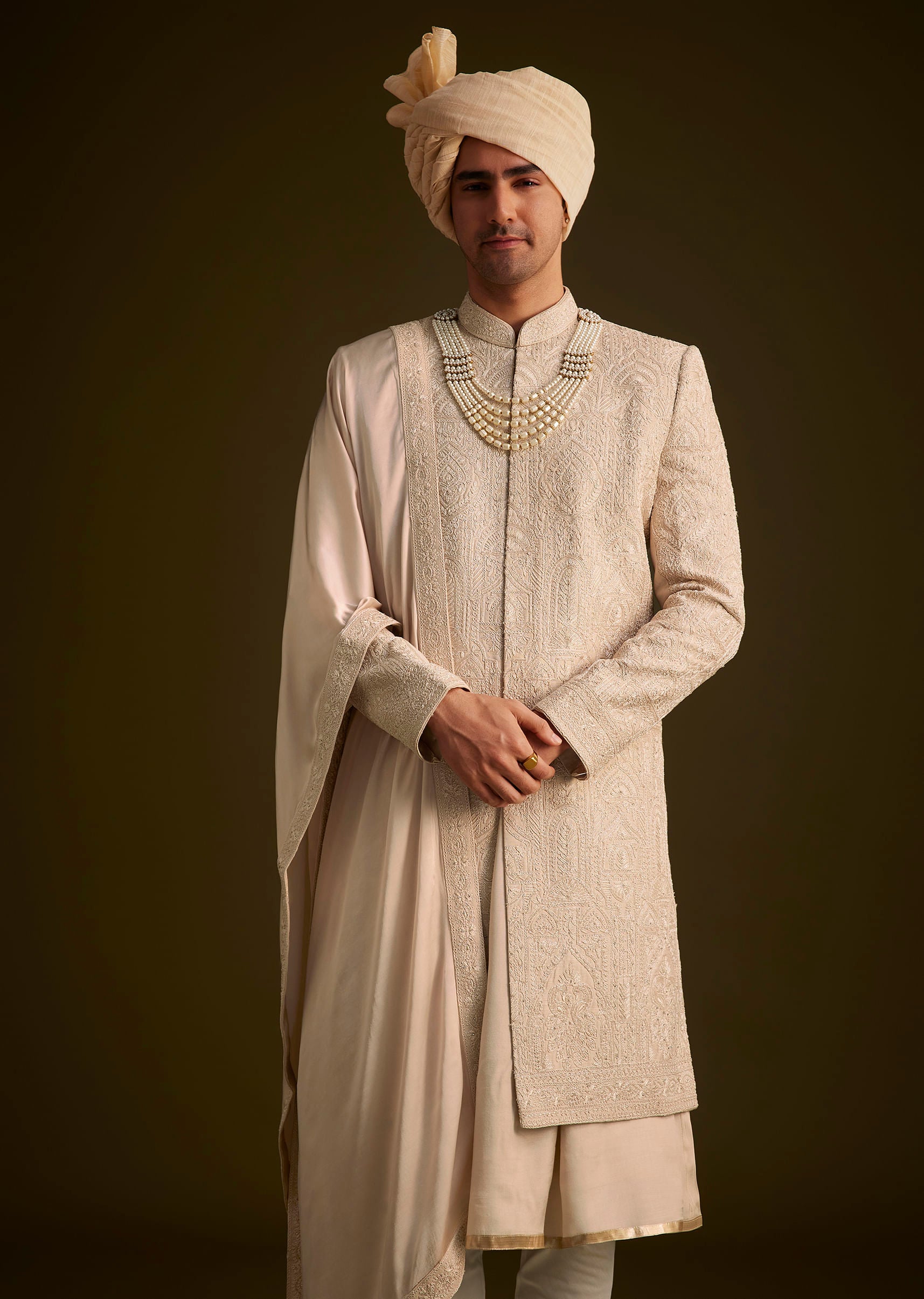 Beige Zardosi Embroidered Sherwani With Dupatta