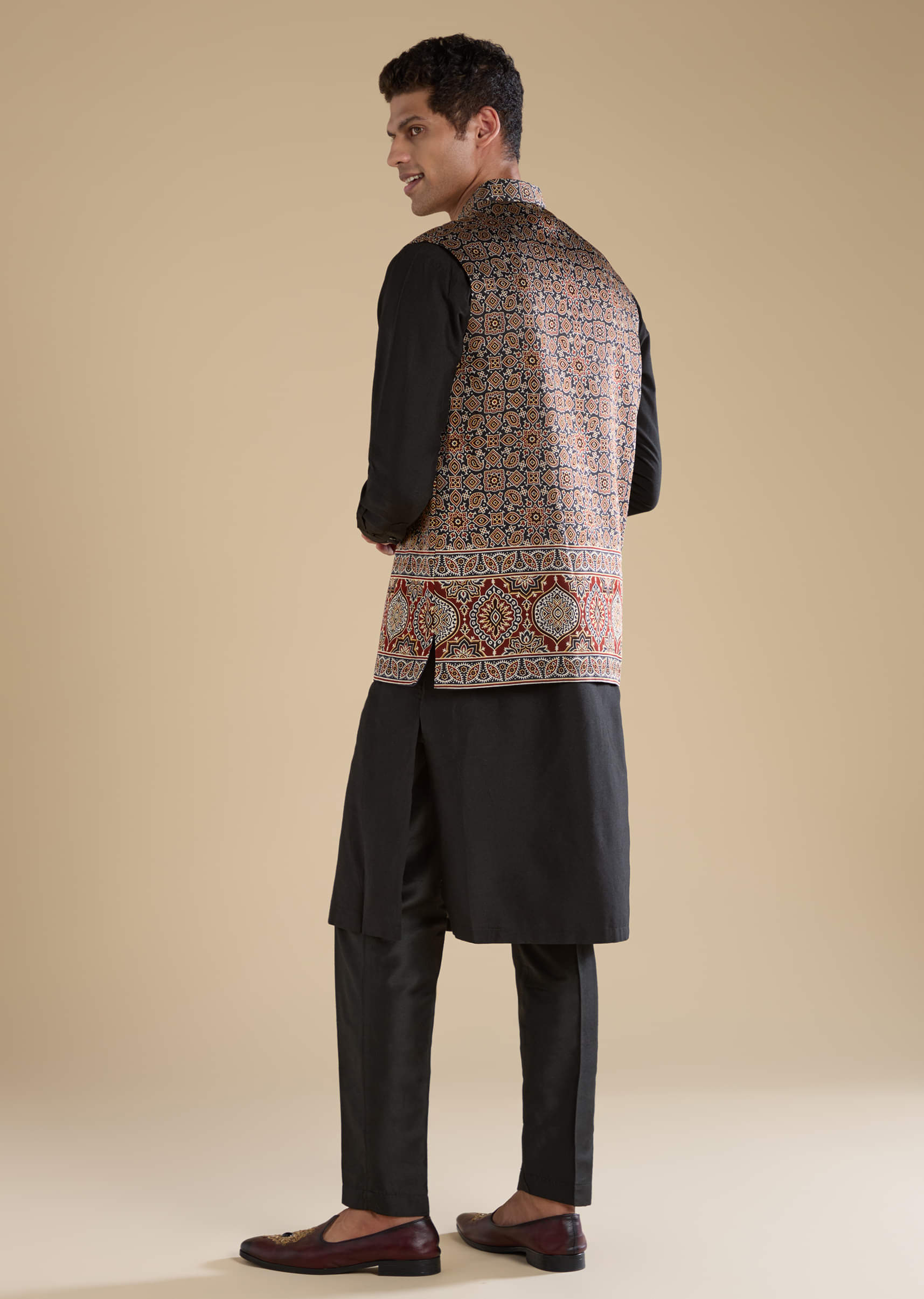 Black Ajrakh Print Mens Jacket Kurta and Pant Set