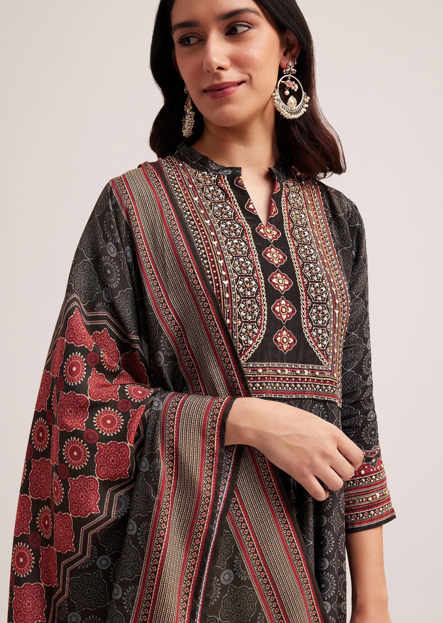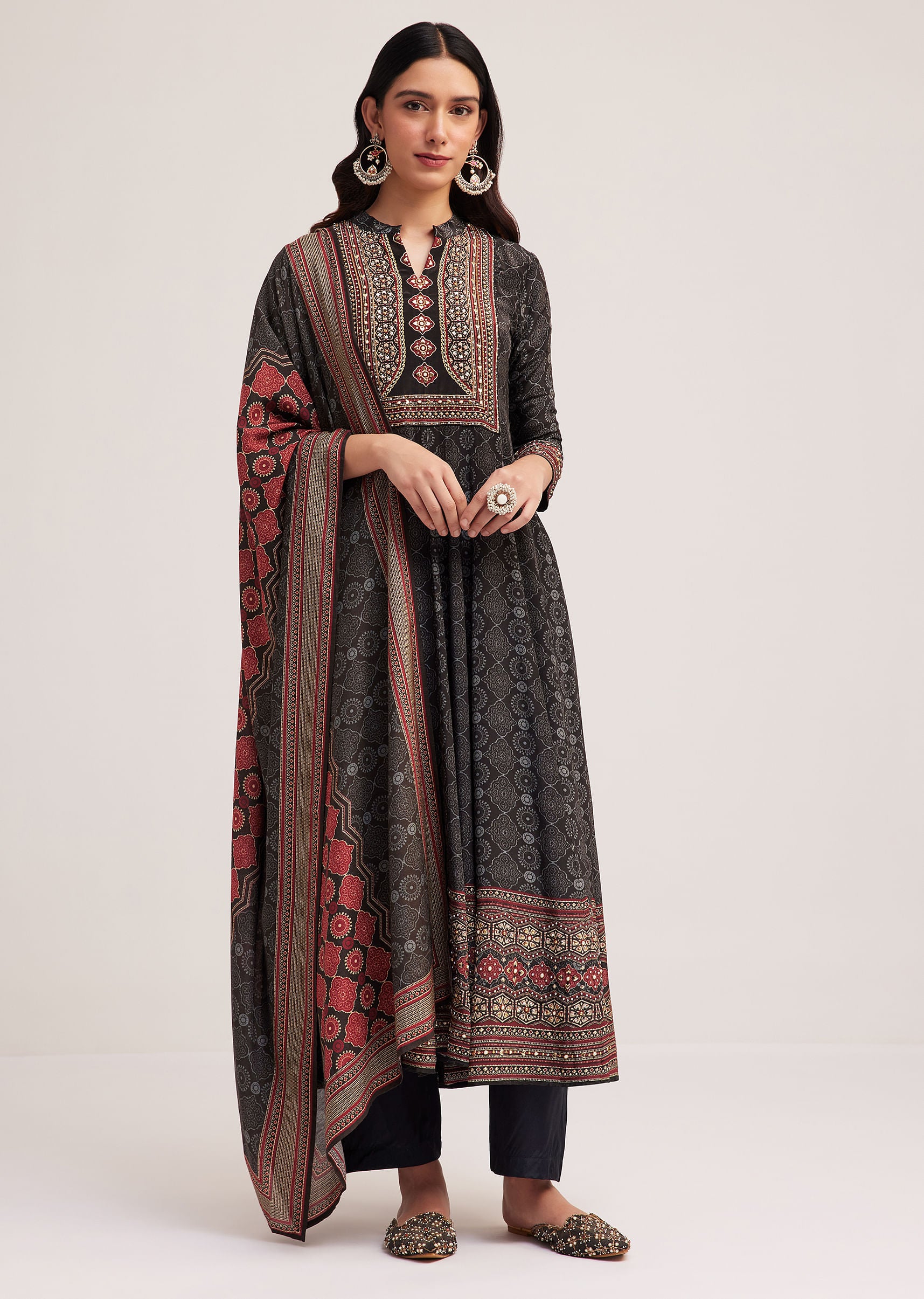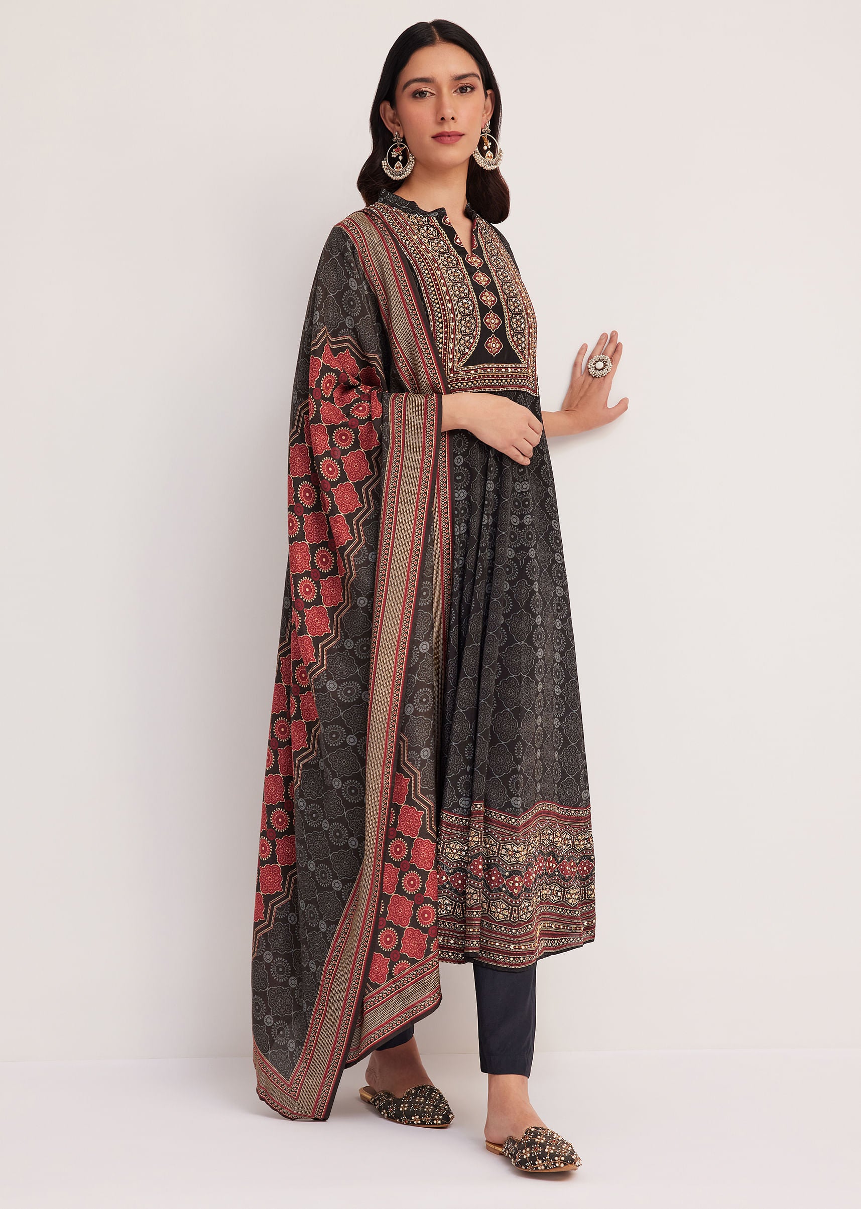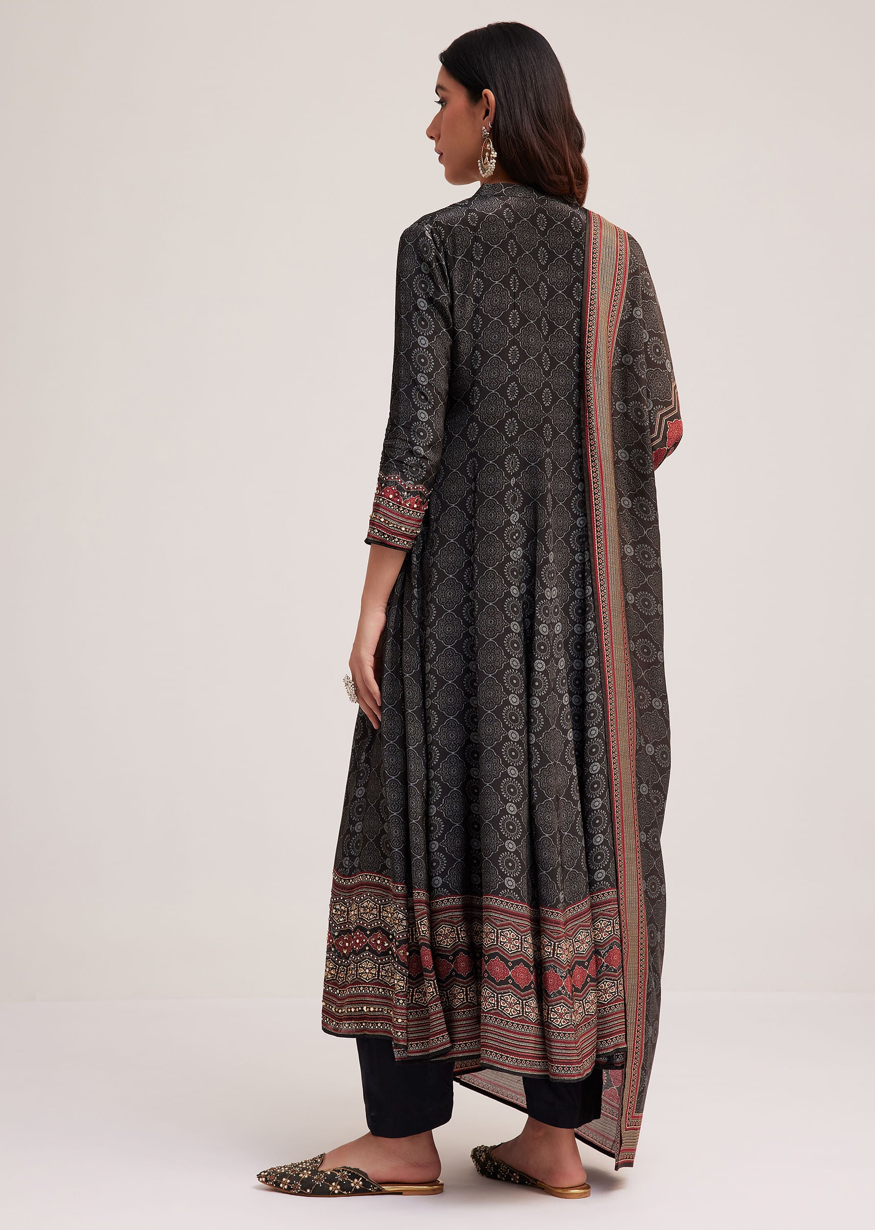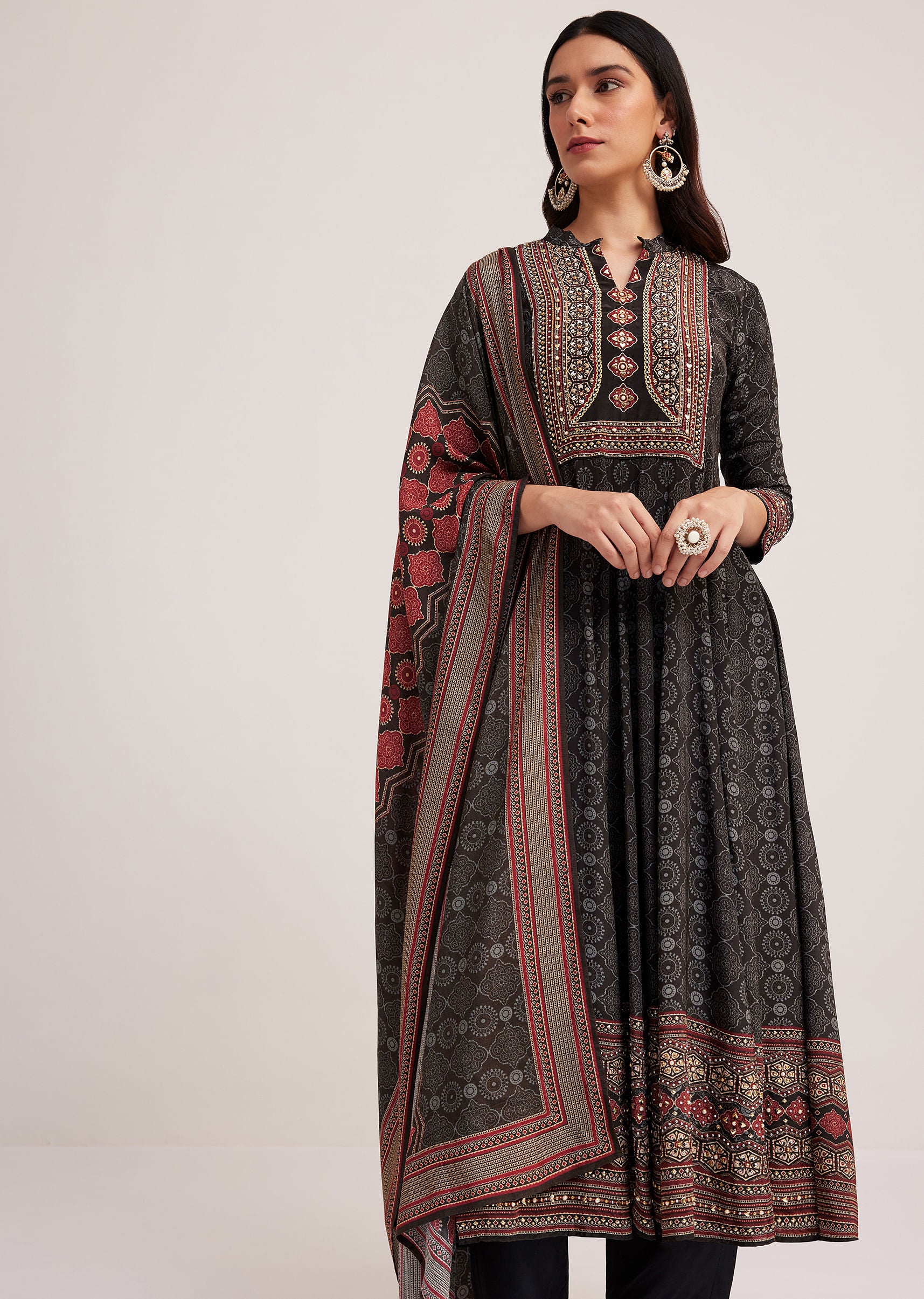 Black Ajrakh Printed Anarkali Set With Dupatta
