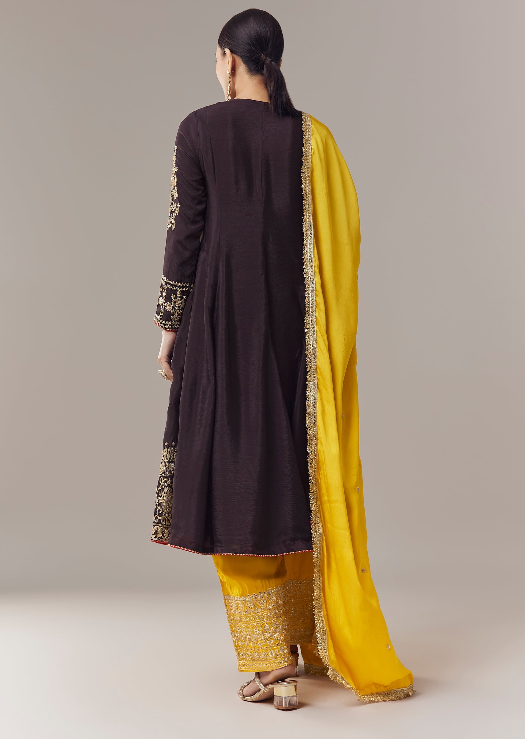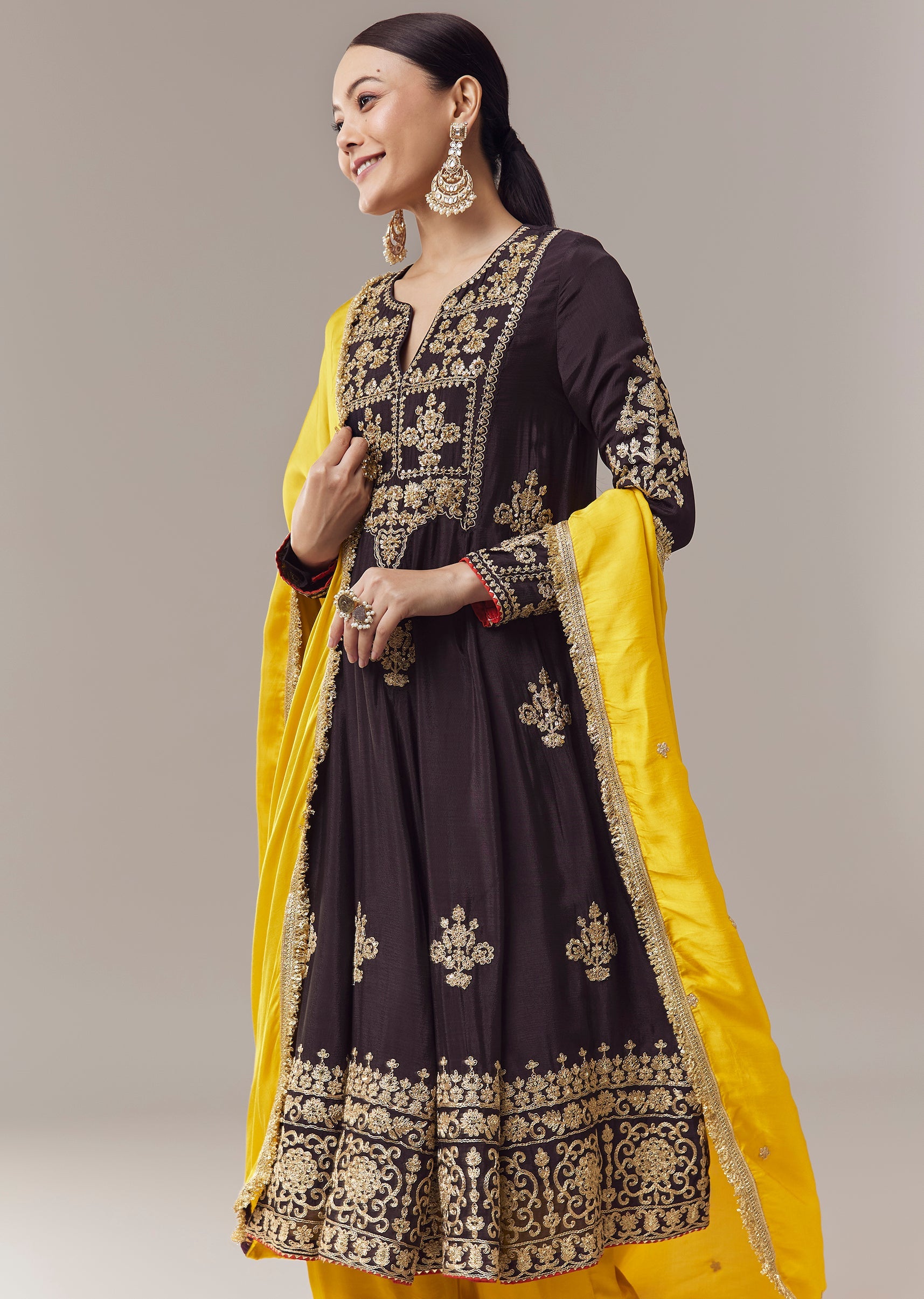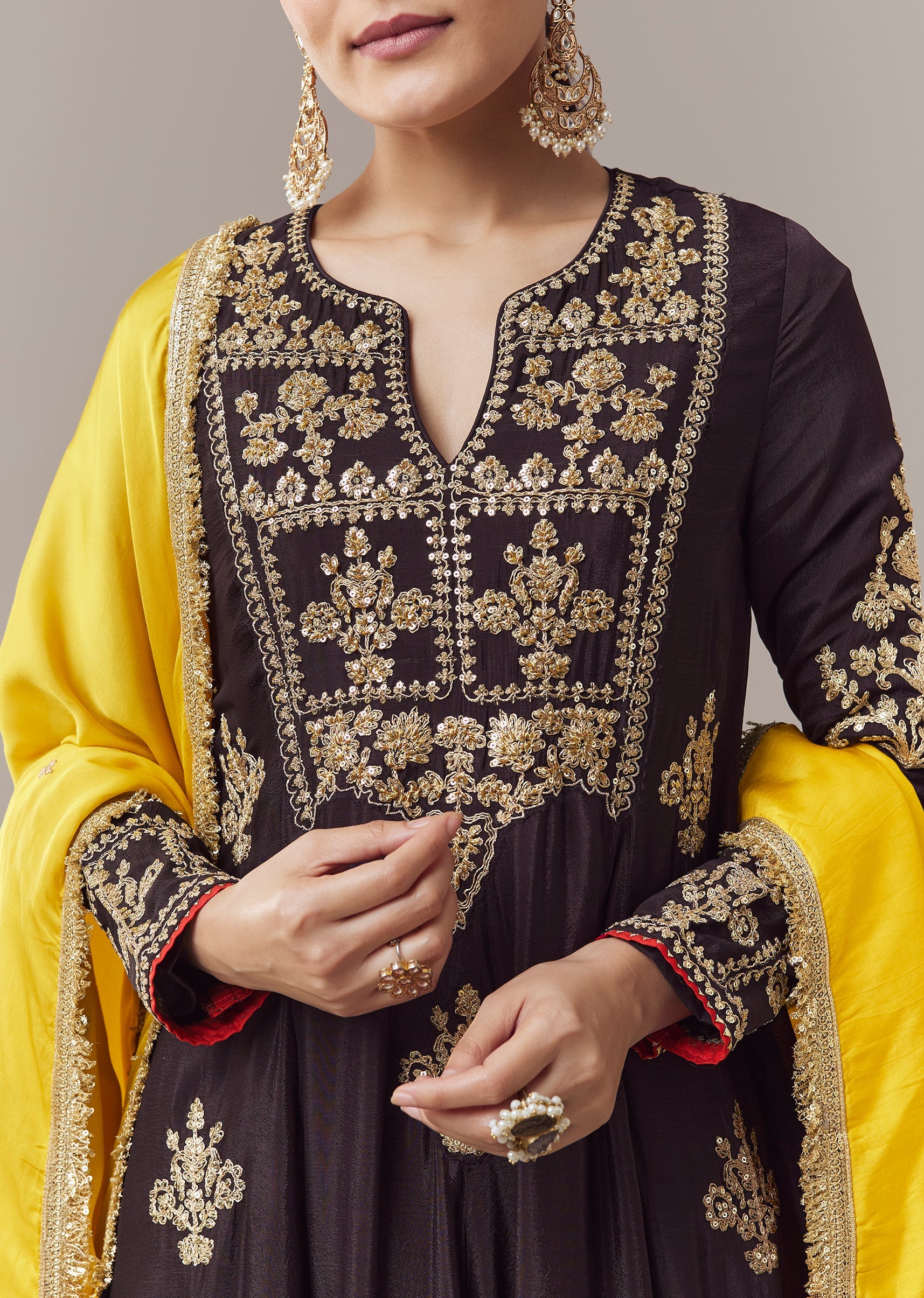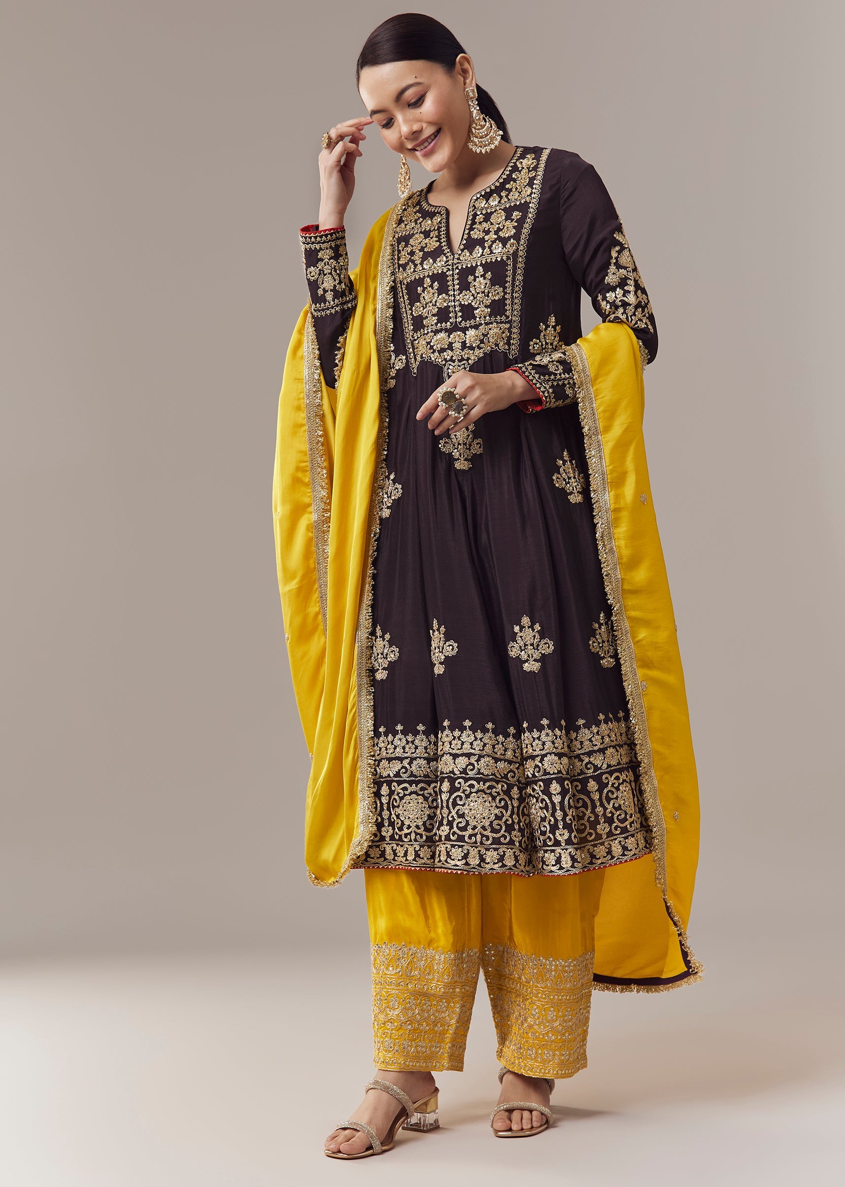 Vibrant and festive, this black anarkali suit is crafted in soft chinon fabric for a lightweight and elegant feel. The kurta is adorned with intricate zari, cut dana, and sequins... More Product Details