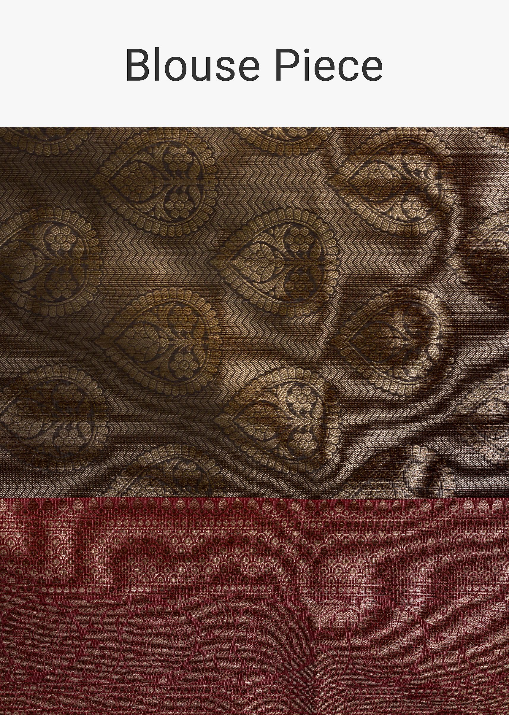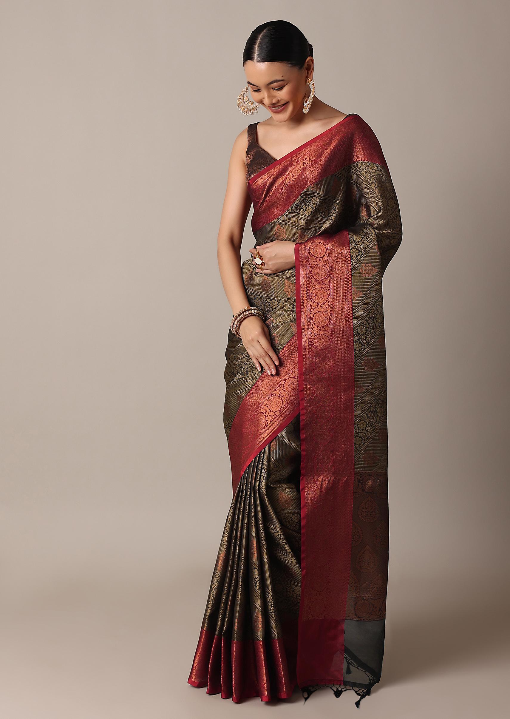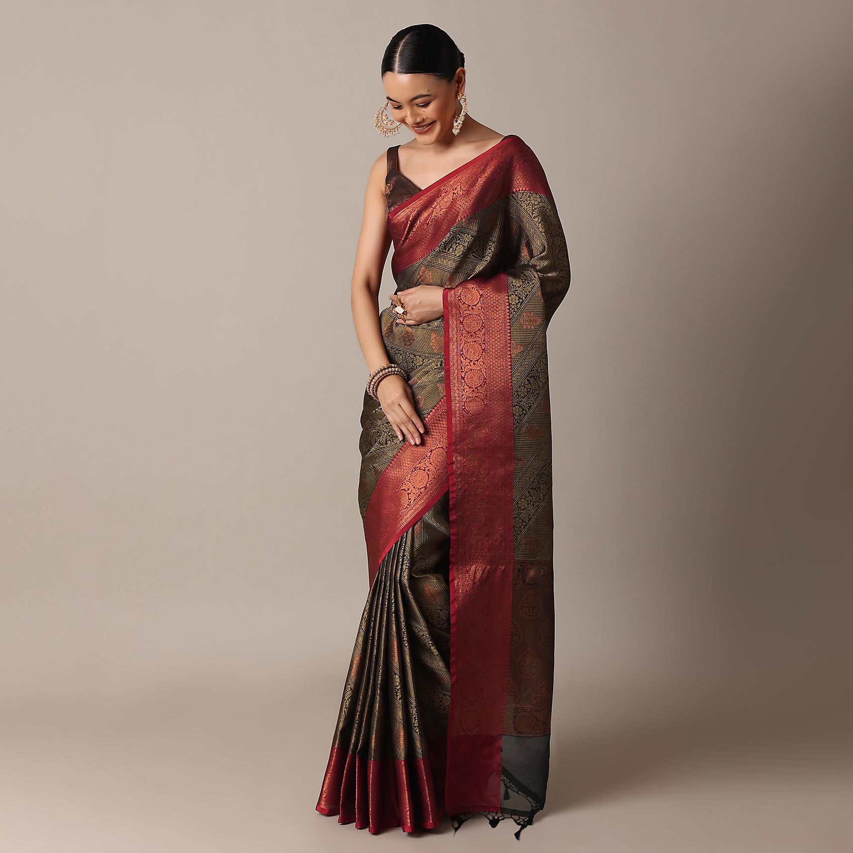- Made from rich Banarasi silk fabric it is adorned with a contrast border this drape is paired with an unstitched blouse piece.