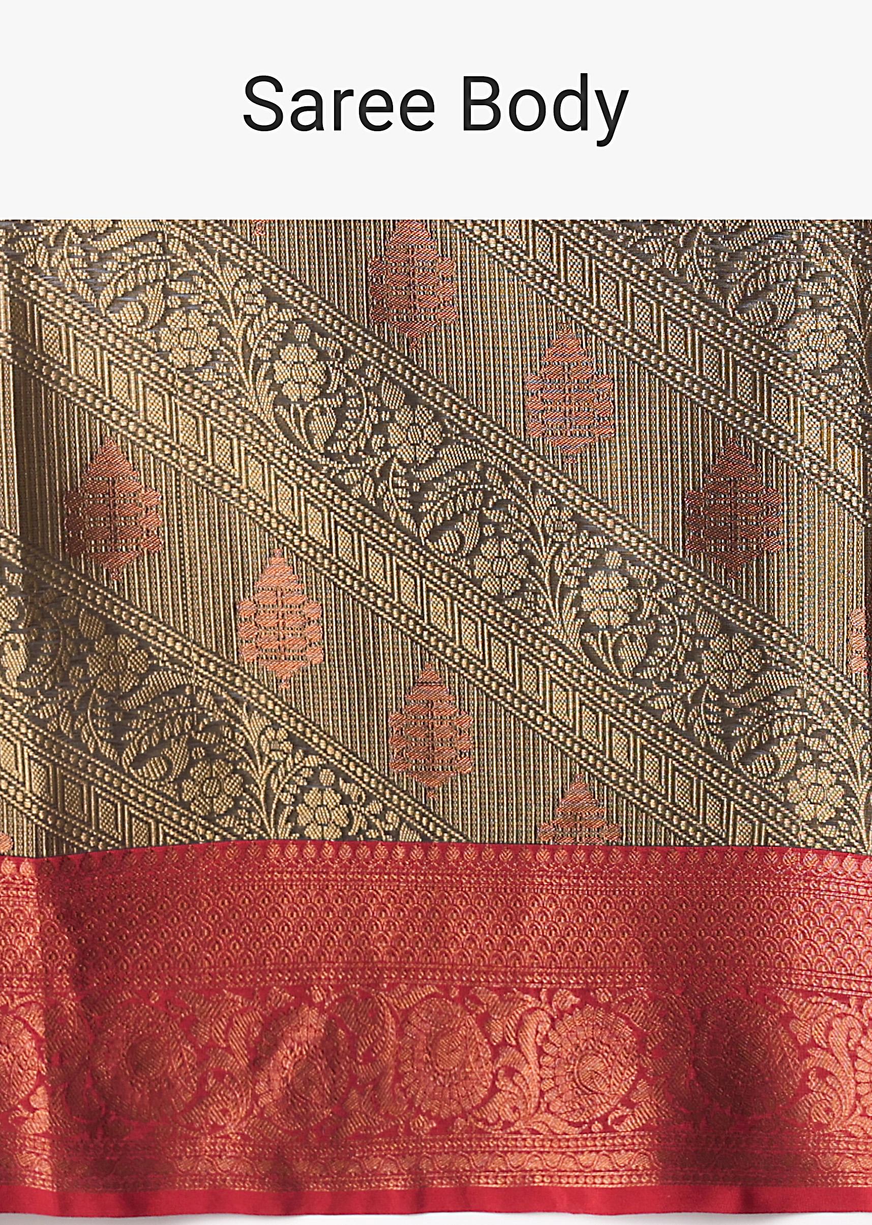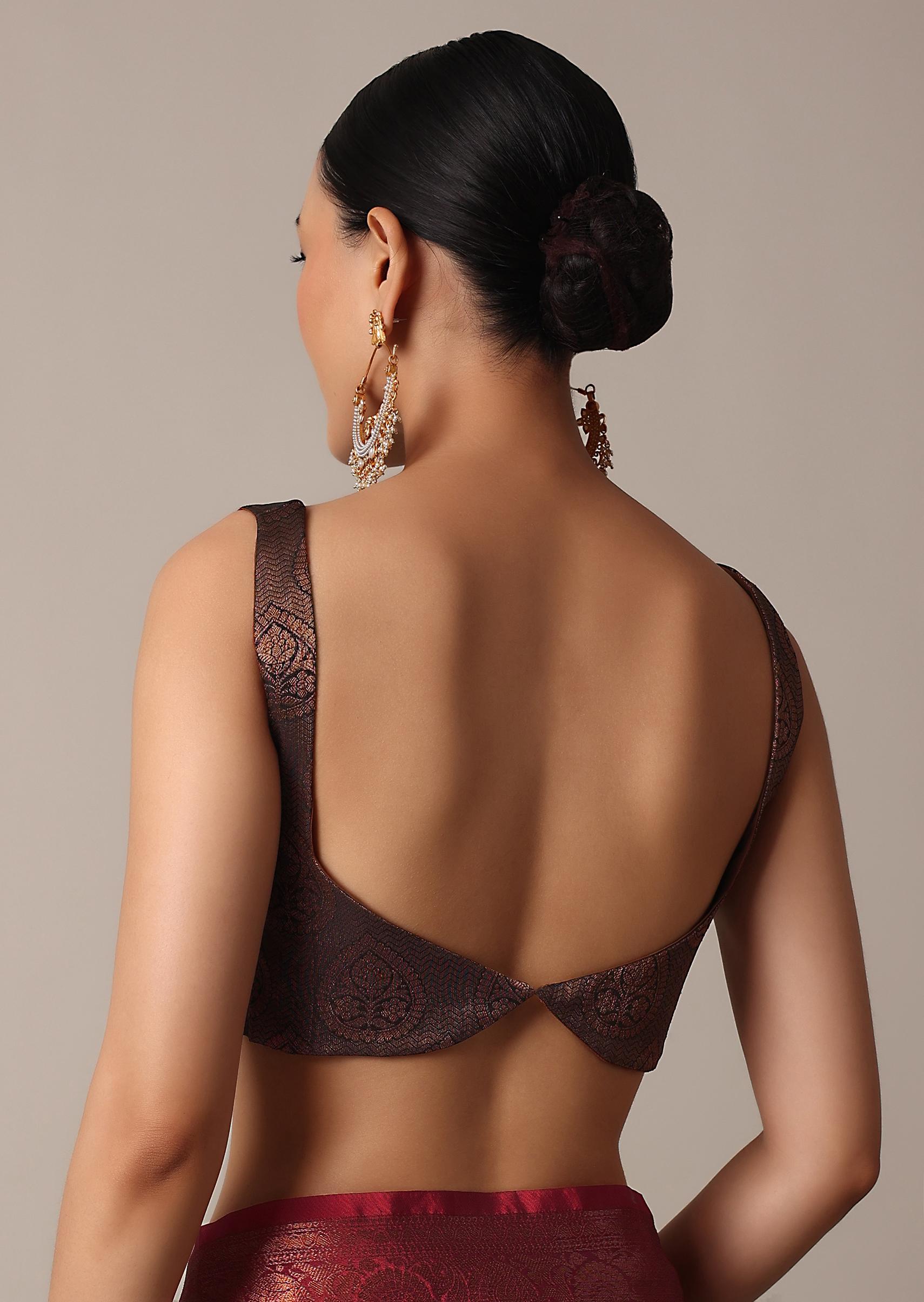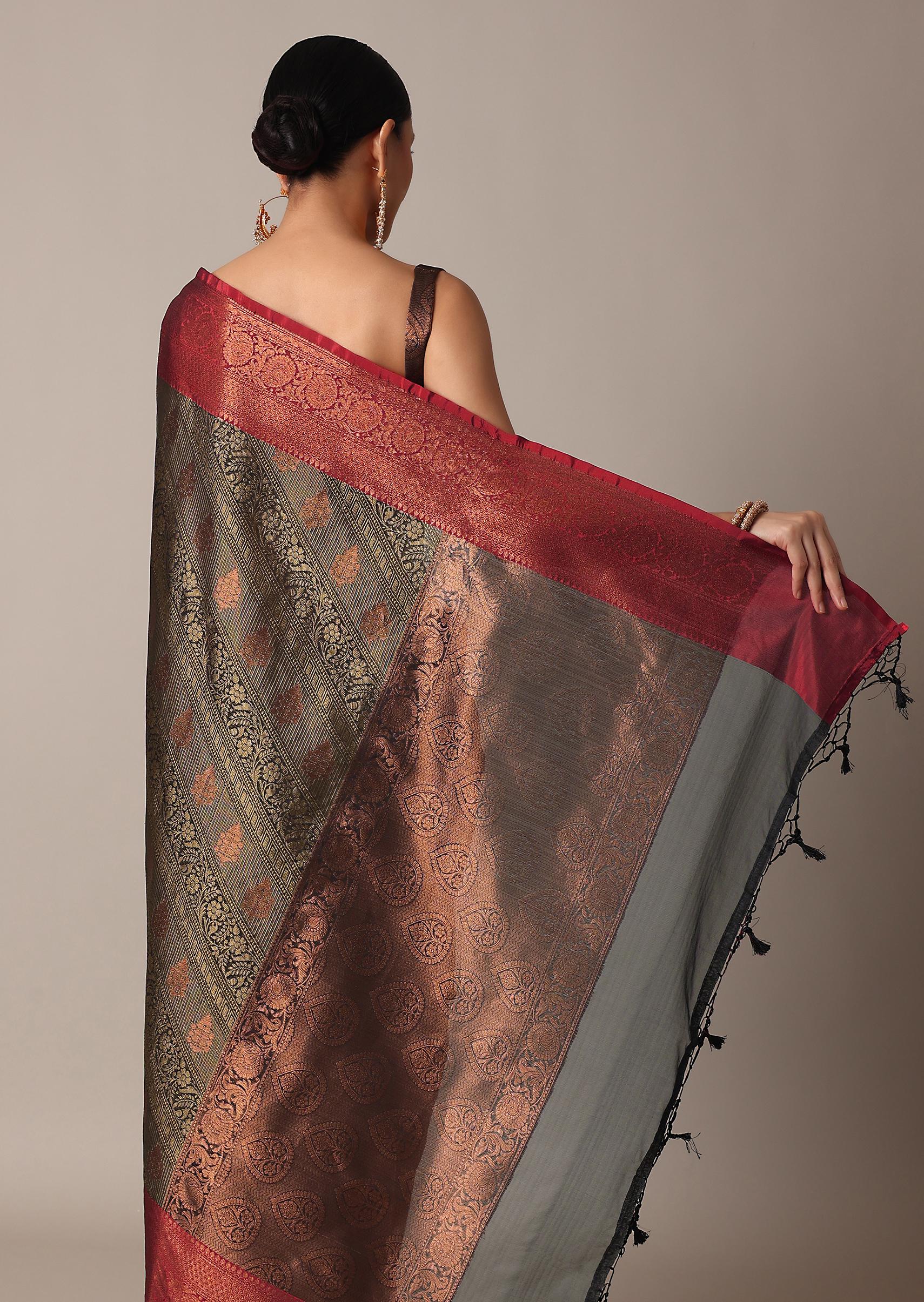- Made from rich Banarasi silk fabric it is adorned with a contrast border this drape is paired with an unstitched blouse piece.