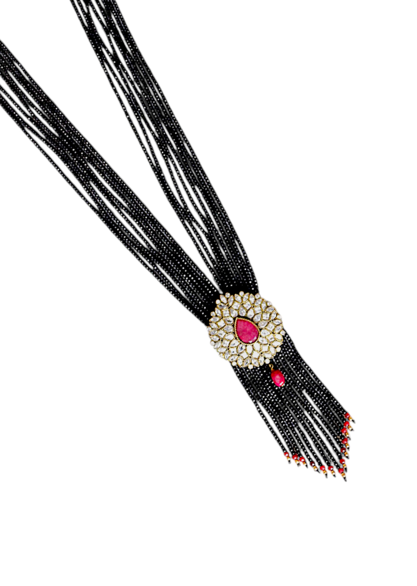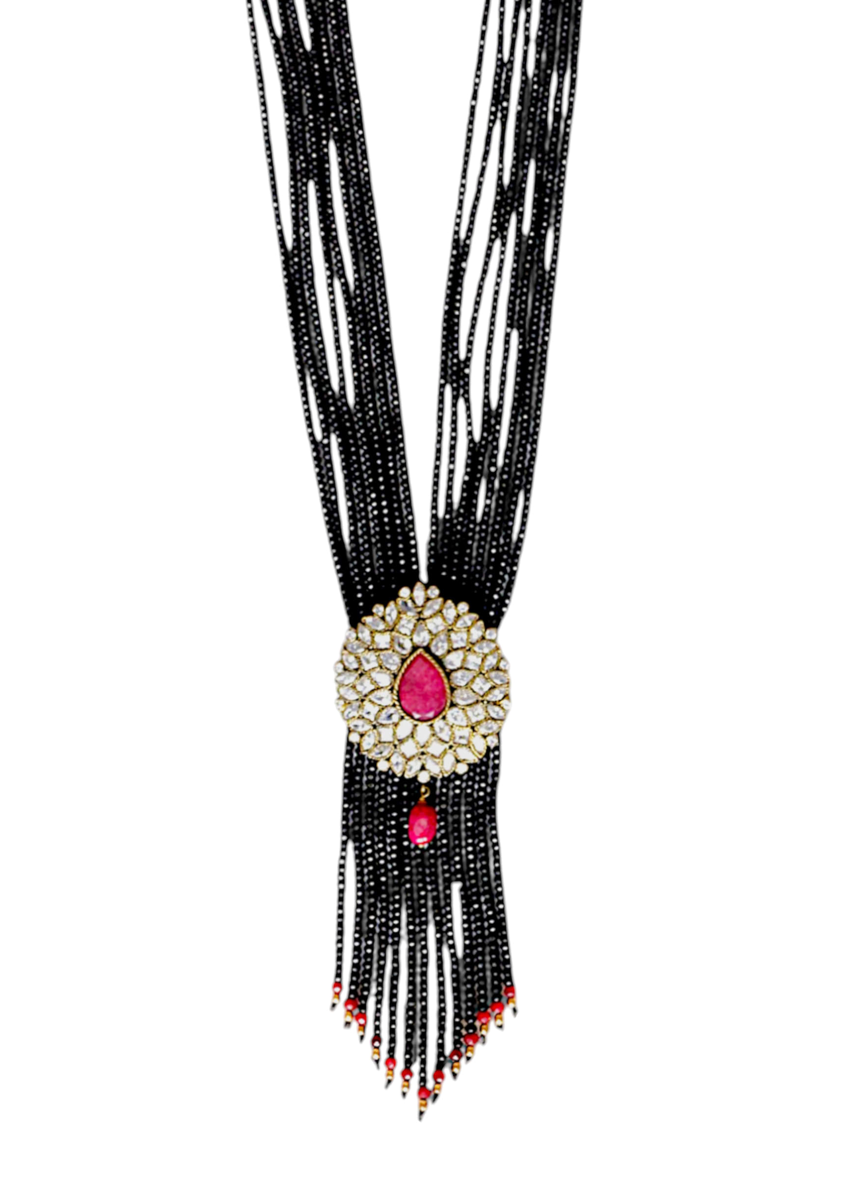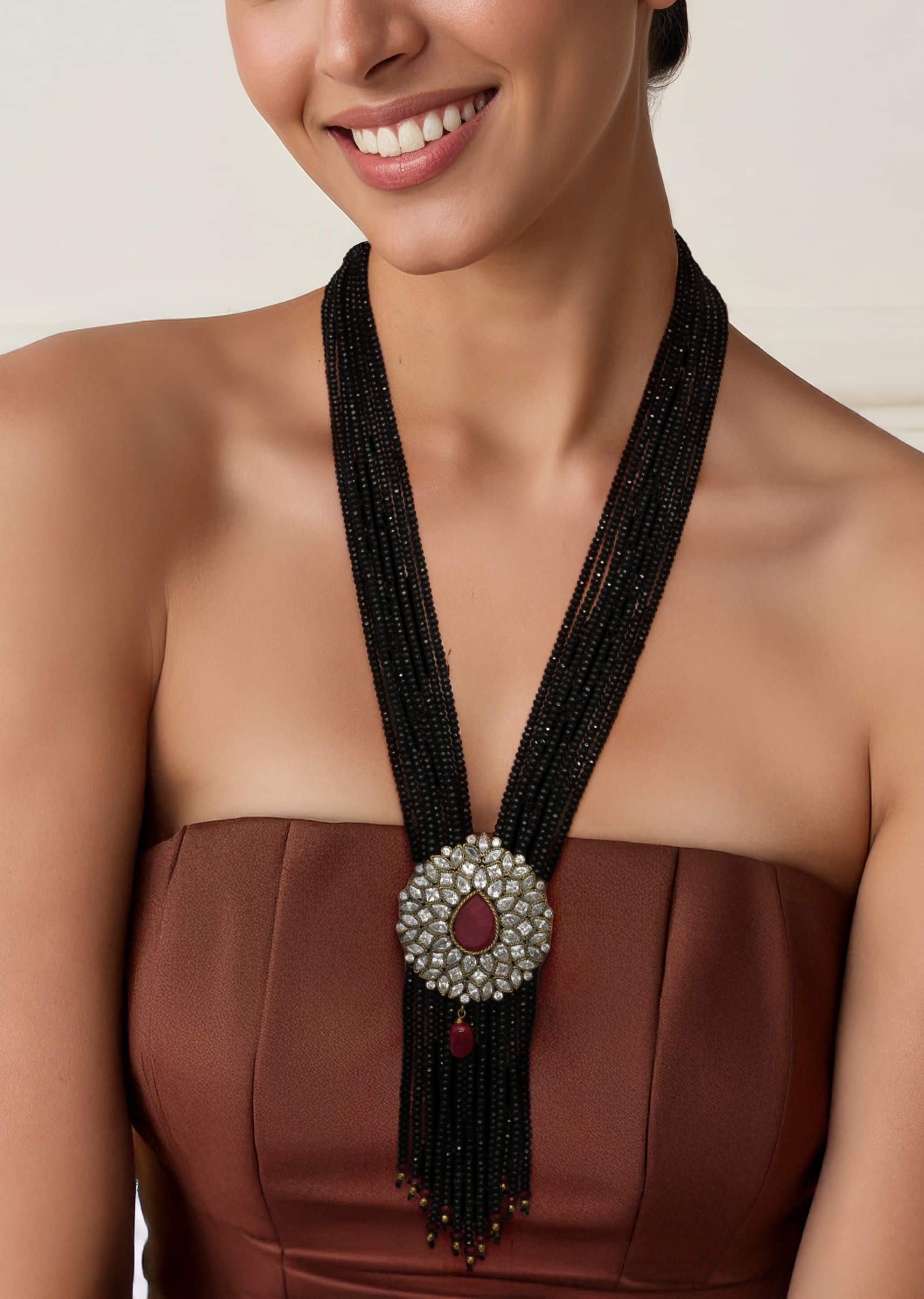 A black beaded fusion pendant long necklace featuring sleek black beads and an intricately crafted pendant, blending modern aesthetics with traditional artistry. Perfect for adding a bold and elegant touch to festive, formal, or ethnic ensembles. Awarded as the Most Trusted Brand, we're delivering styles you love, just as promised.