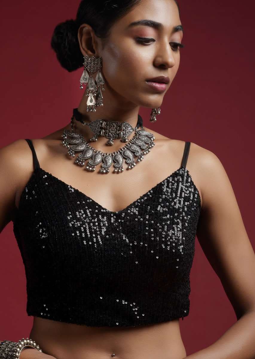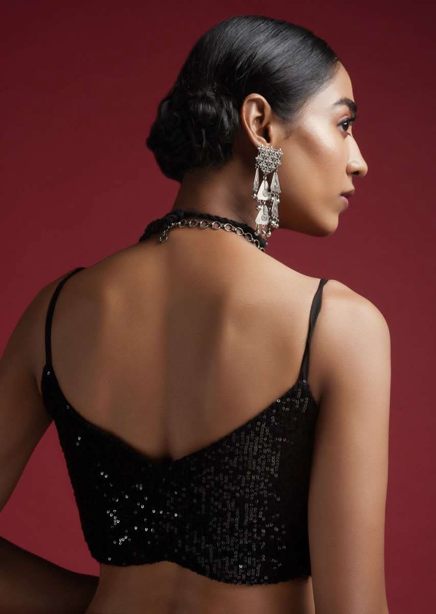 Black Blouse Embellished In Sequins With Strap Sleeves And V Neckline