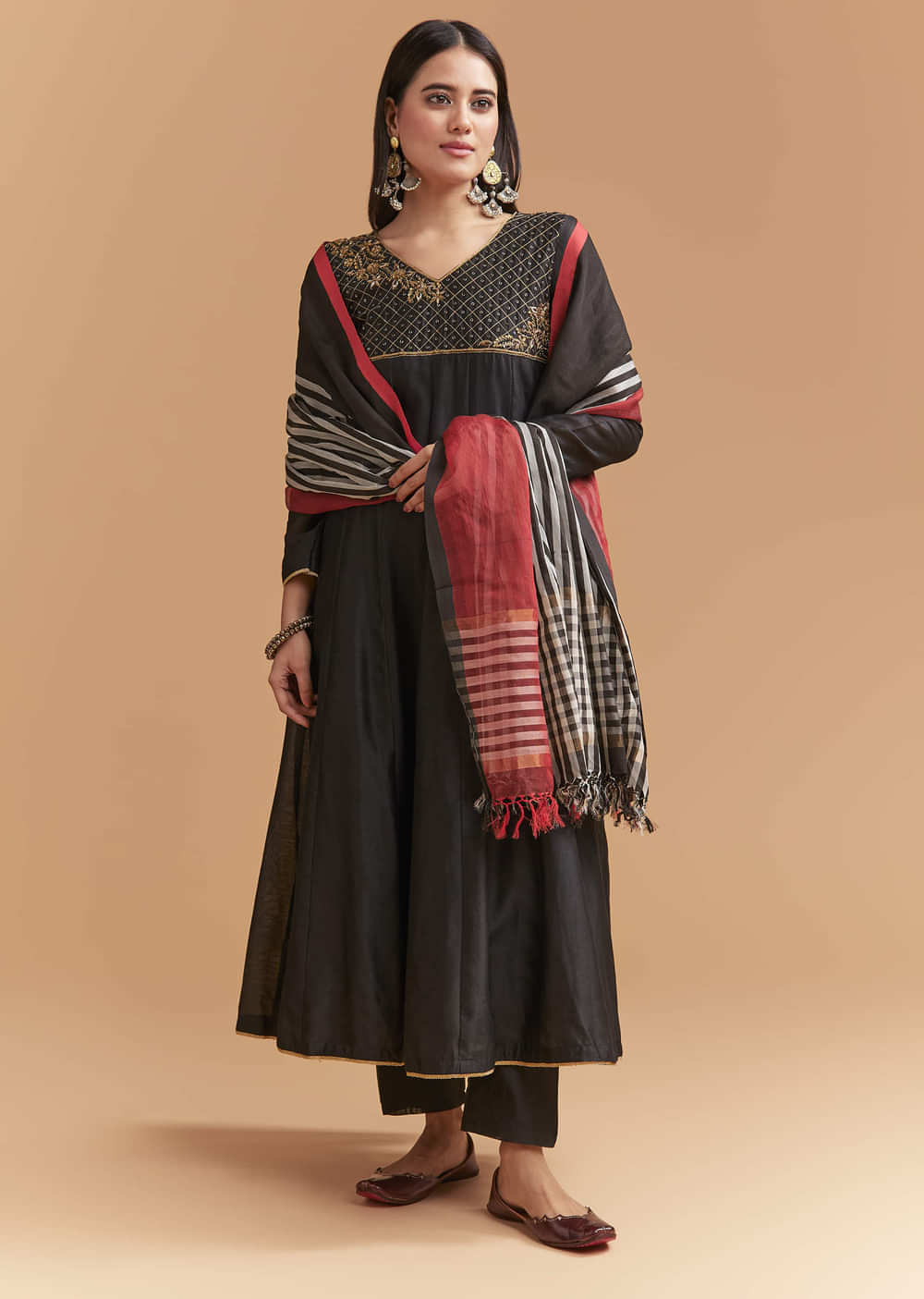 Go for kundan studs and a berry lip. Add classic pumps and carry a slim potli.