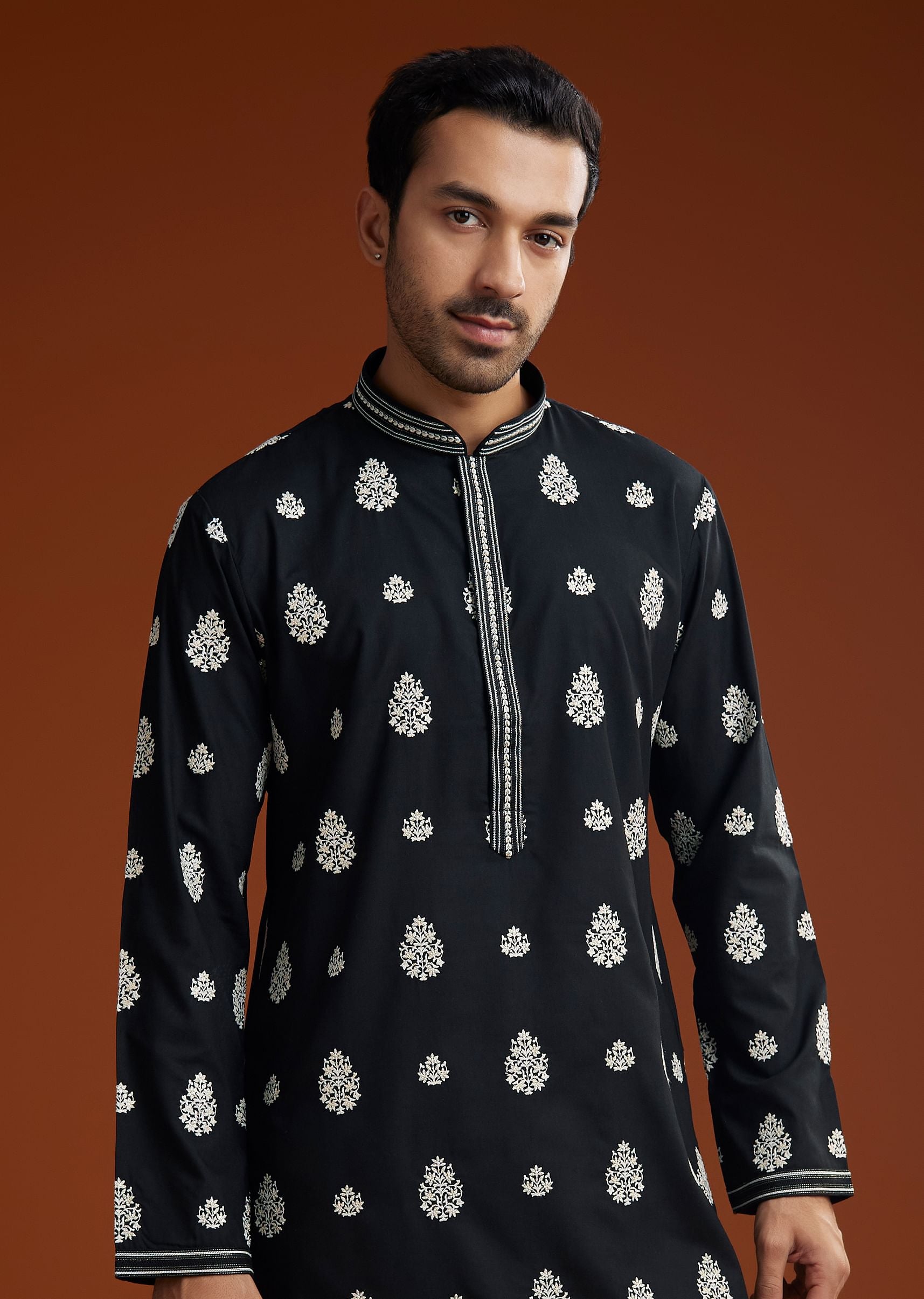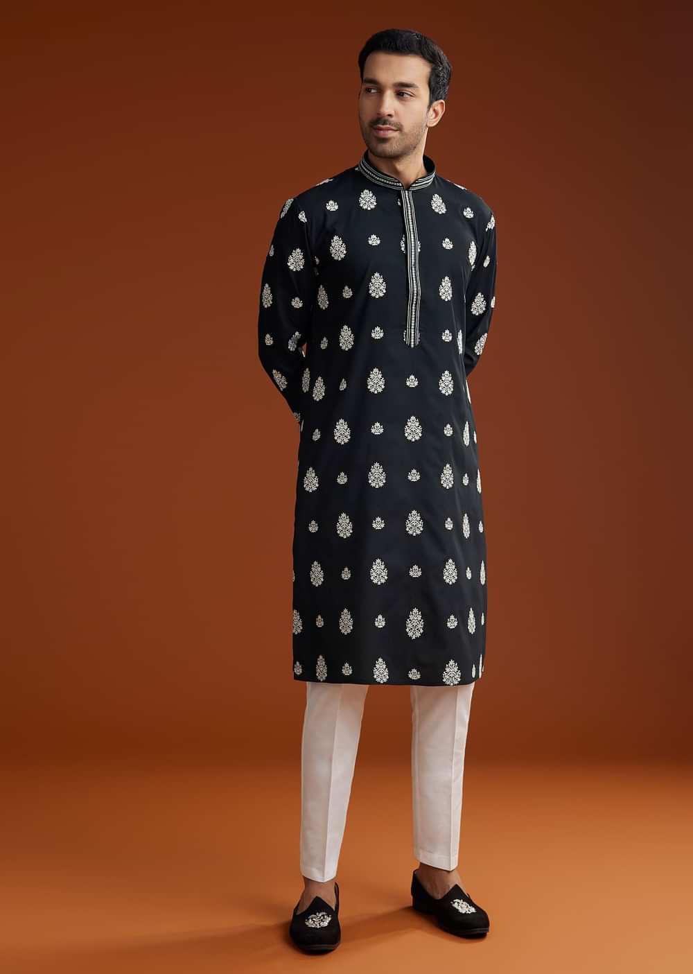 Designed for graceful sophistication this black Chanderi kurta pant set is adorned with intricate embroidery full sleeves and a front hookeye closure making it a versatile festive ensemble.Awarded as the Most Trusted Brand we're delivering styles you love just as promised.