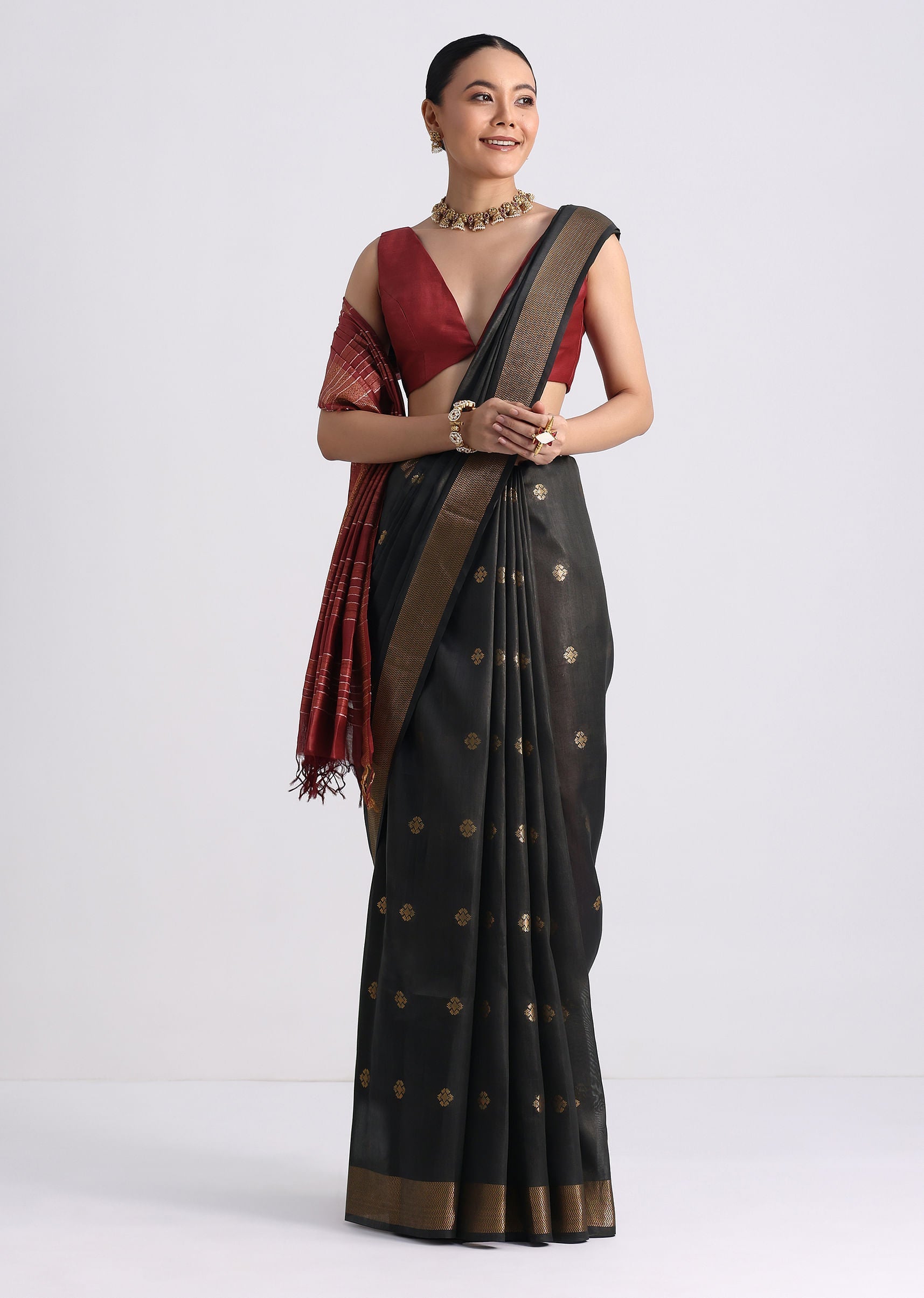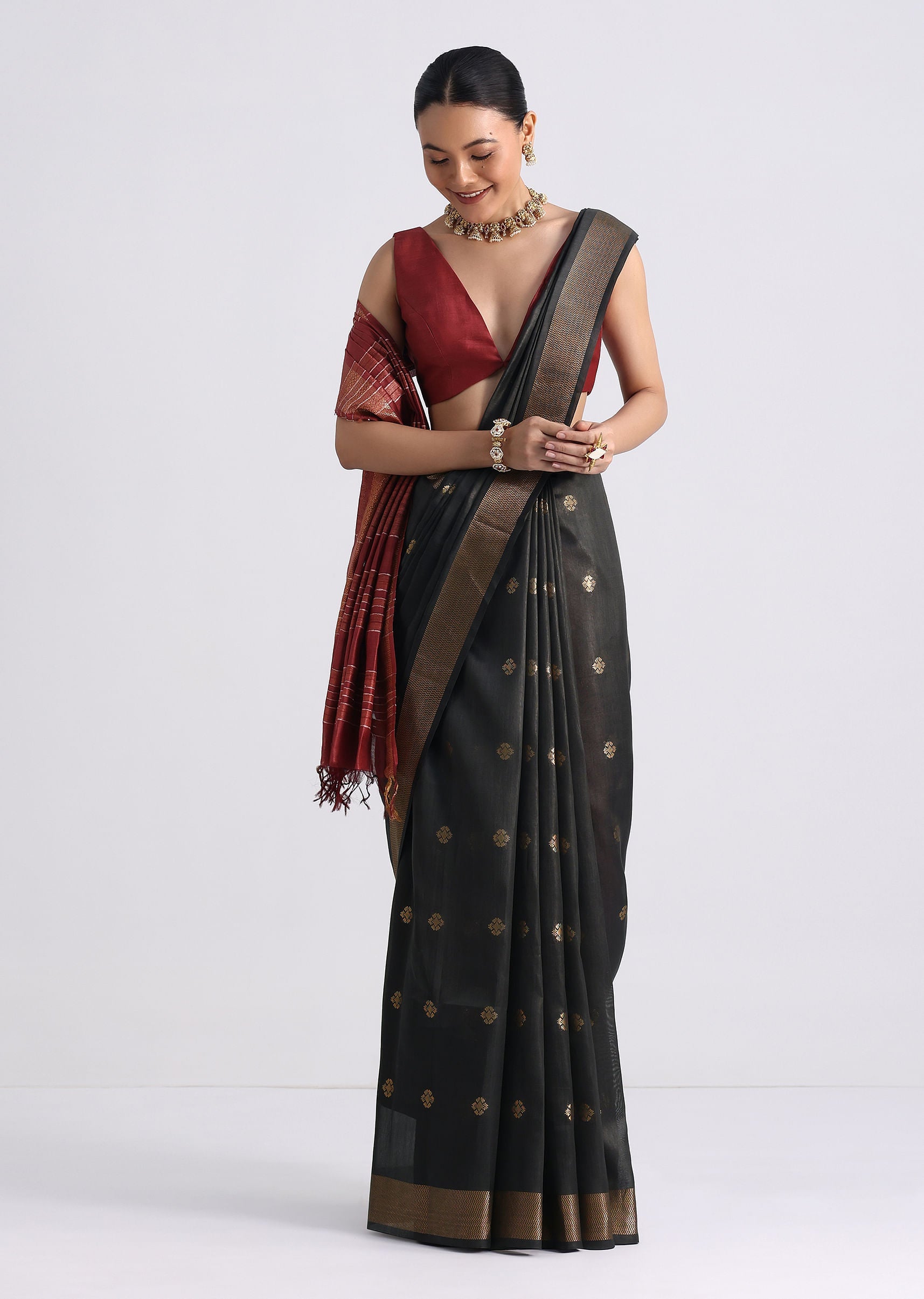 - A perfect blend of traditions and craftsmanship is our colorblock black and brown saree.