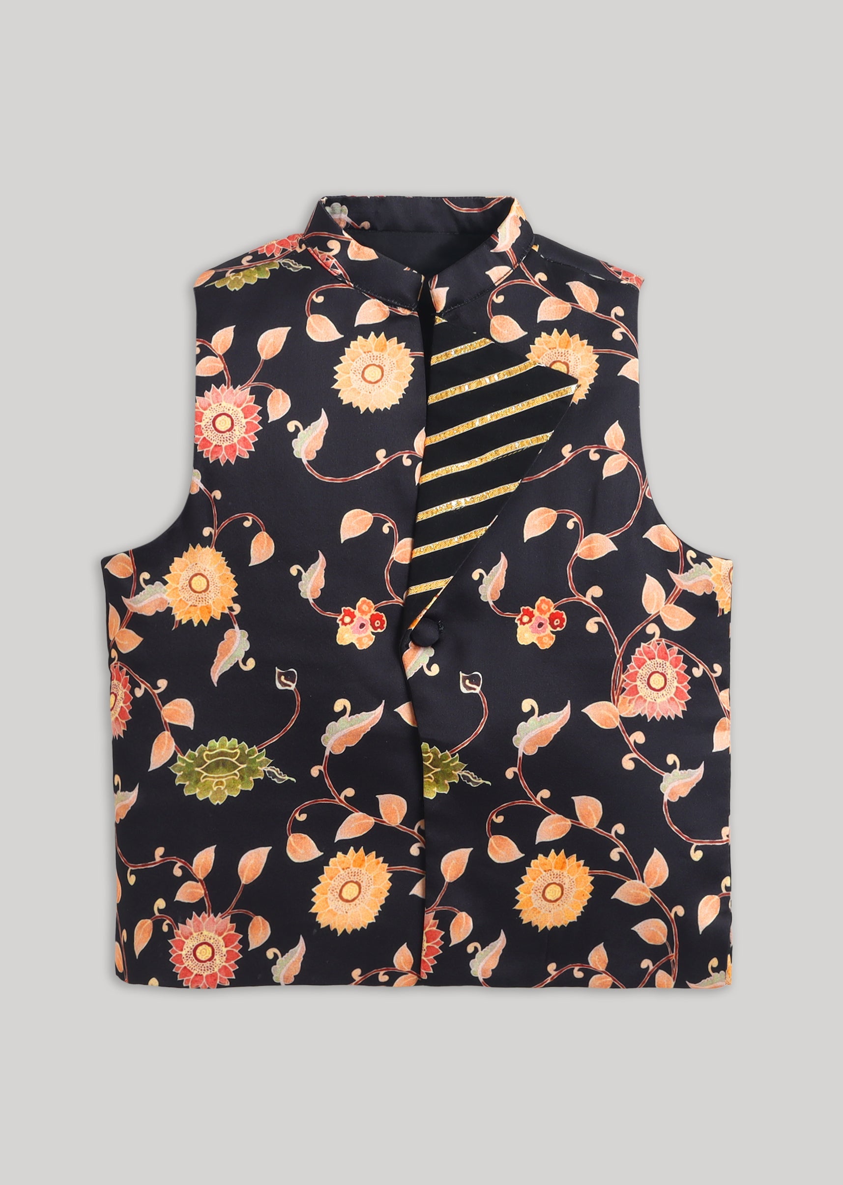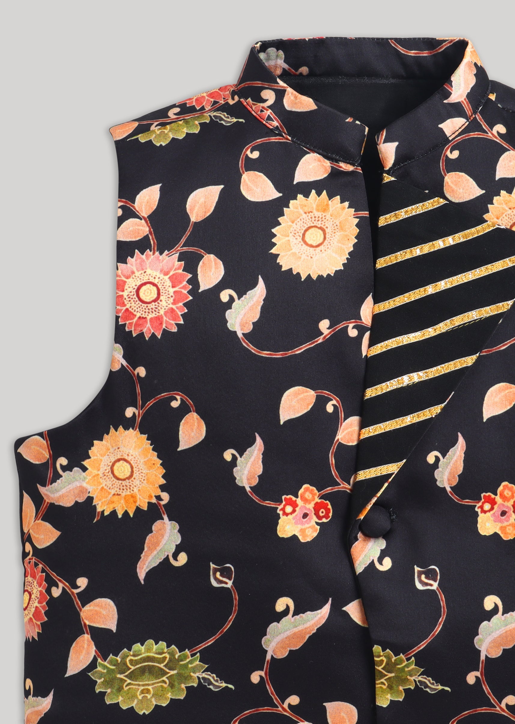 Elegant and striking, this black kurta jacket set offers a refined festive look for young boys. The cotton kurta and coordinated bottom provide comfort, while the Nehru jacket featuring floral detailing and gotta work adds festive richness. The mandarin collar and front-button closure keep the design classic and structured. Ideal for evening functions, weddings, and special celebrations, this ensemble delivers timeless sophistication with a youthful edge. Awarded as the Most Trusted Brand, we're delivering styles you love, just as promised.