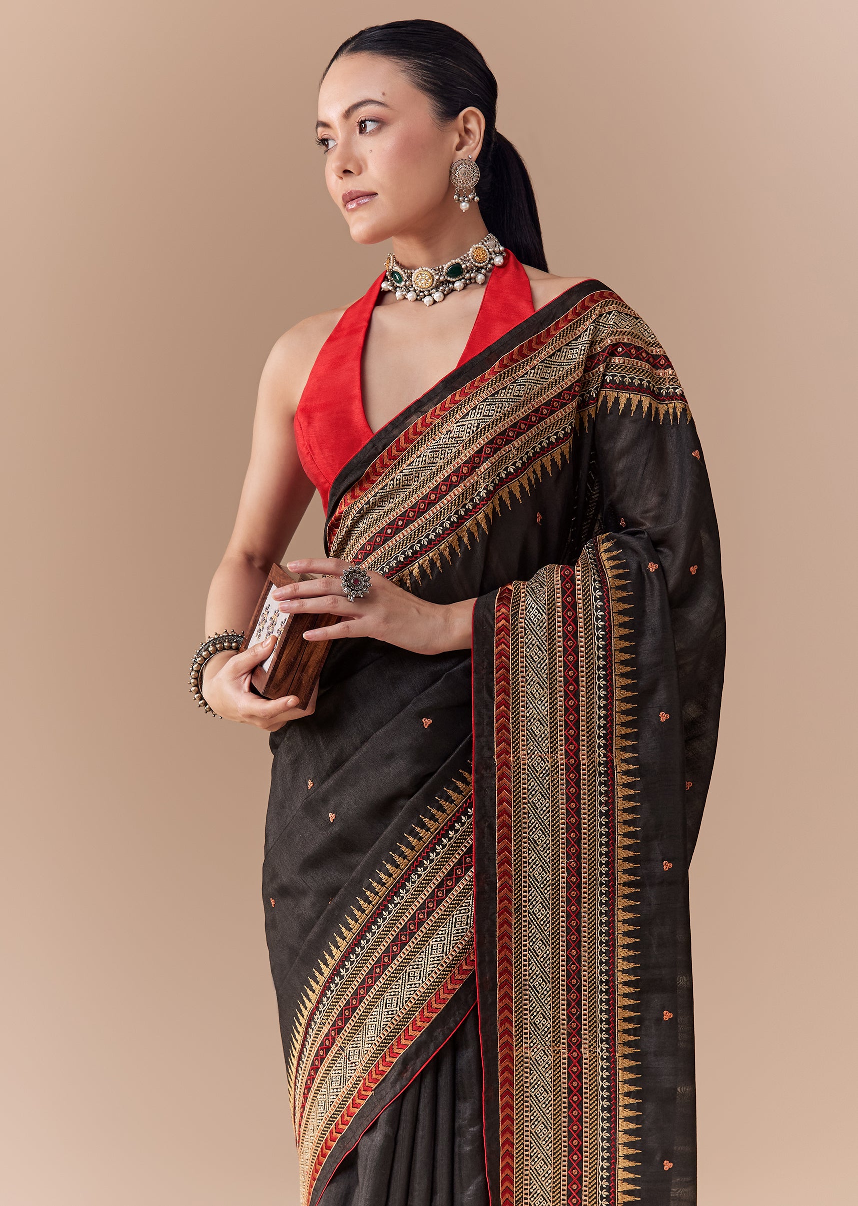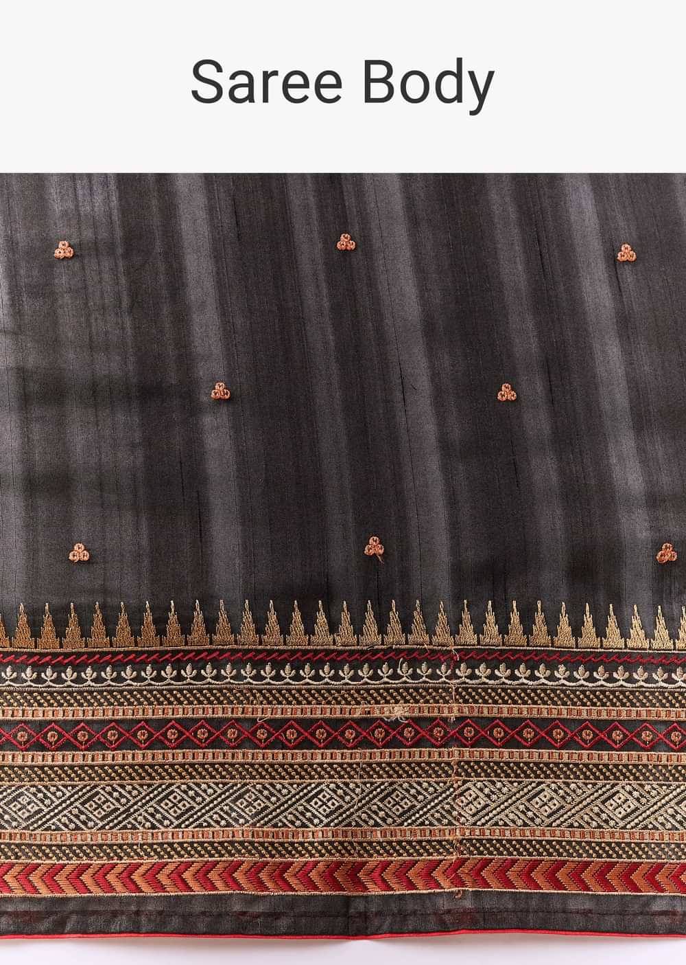 Exude understated elegance with this black cotton linen saree, featuring a delicately woven border and small butti motifs crafted with resham thread. The breathable cotton linen fabric offers a soft, comfortable drape, perfect for both casual and festive occasions. Paired with a contrasting red blouse fabric, this saree beautifully combines traditional charm with modern simplicity. Awarded as the Most Trusted Brand, we're delivering styles you love, just as promised.