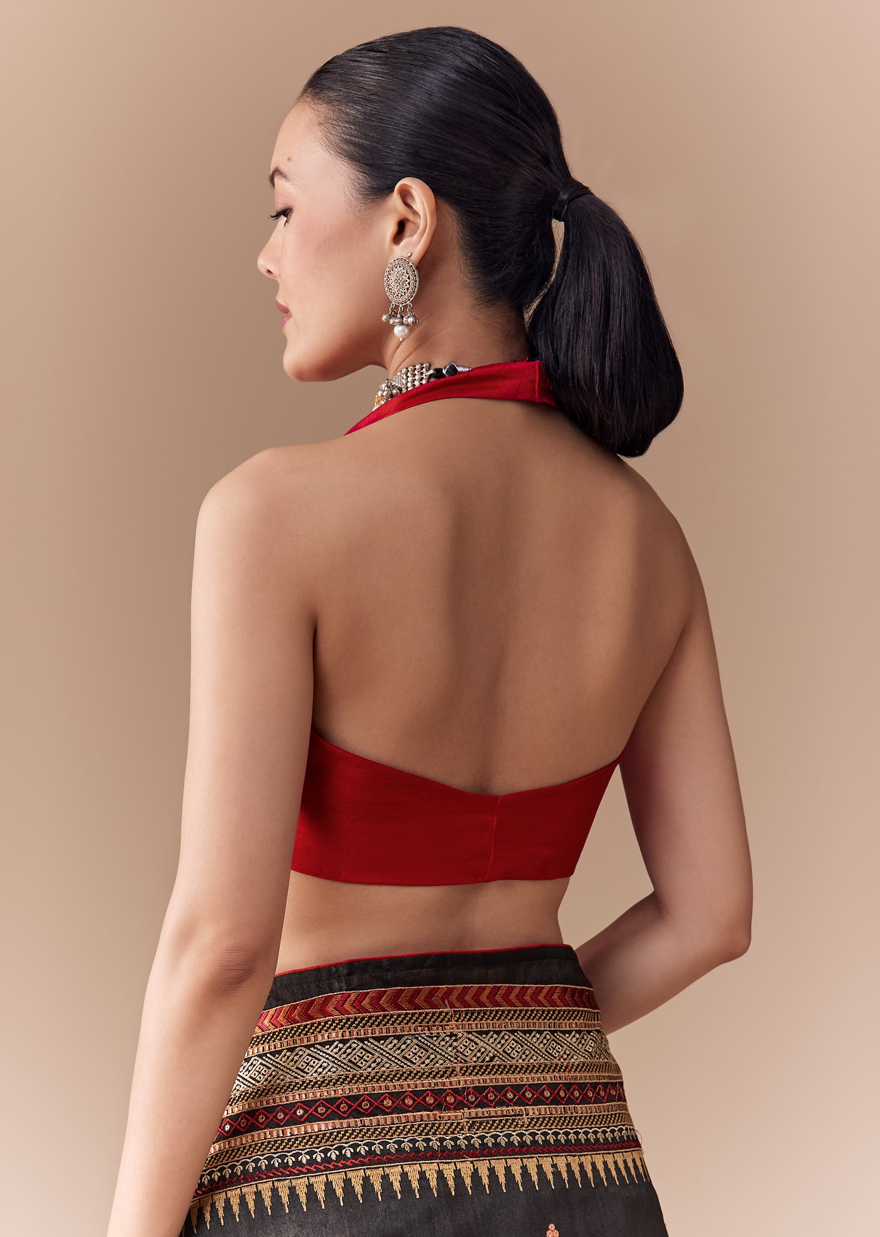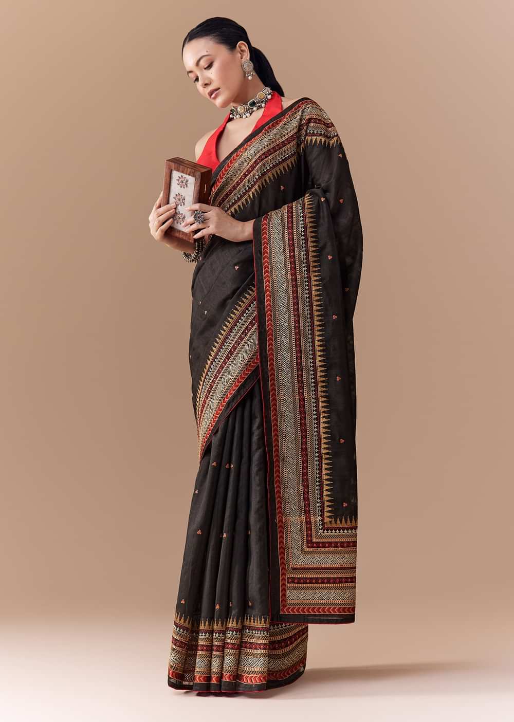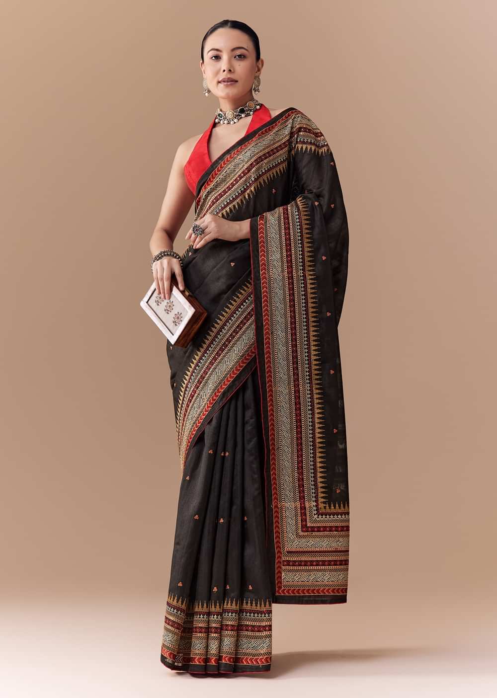 Fit Tips:Stitch the blouse for a structured yet comfortable fit to complement the saree’s lightweight texture and refined detailing.
