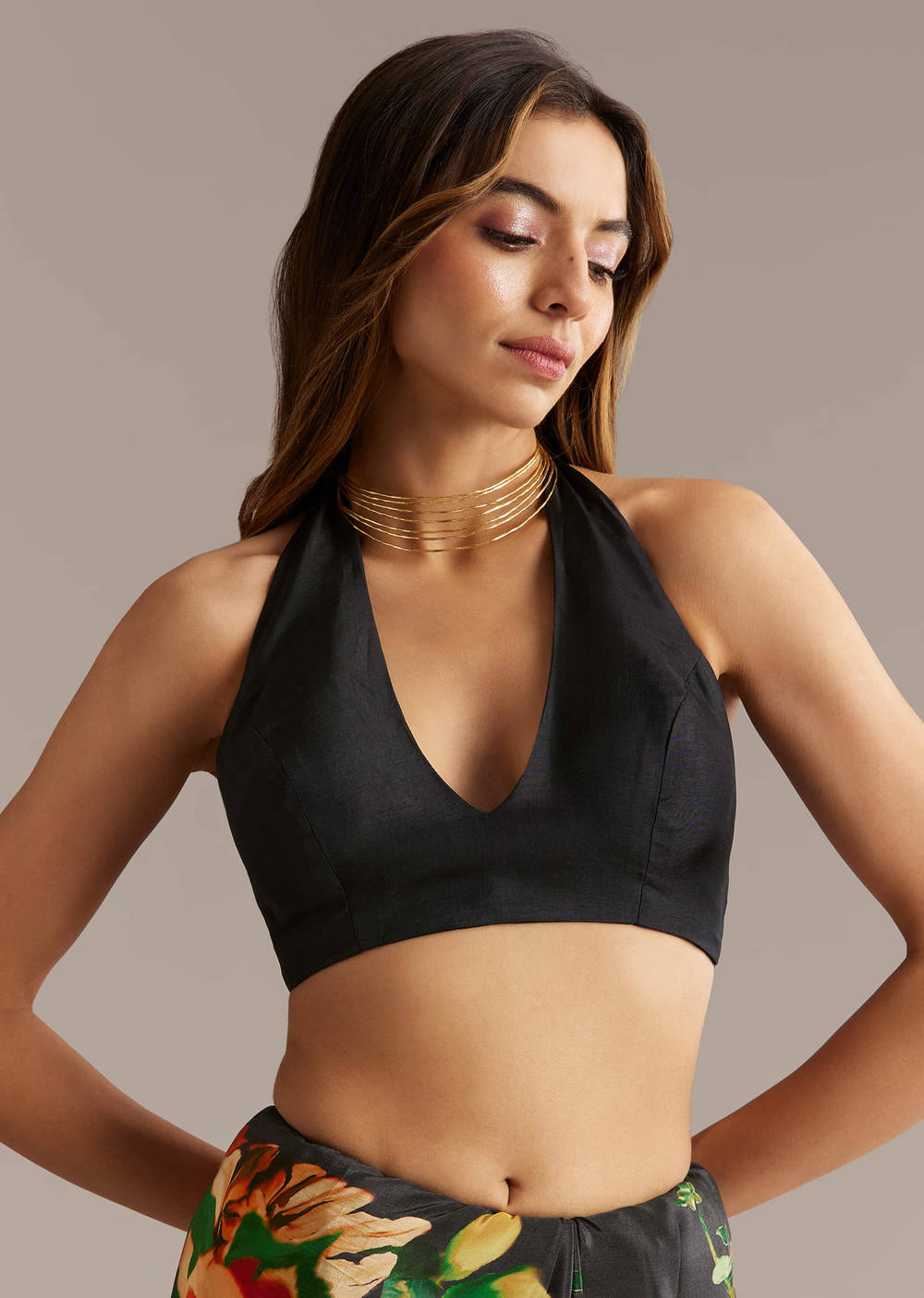 Dramatic black gives this crepe saree a bold and modern edge. The floral print is framed with scallop borders, sequins, cutdana, and stone embroidery on the blouse. It is a... More Product Details