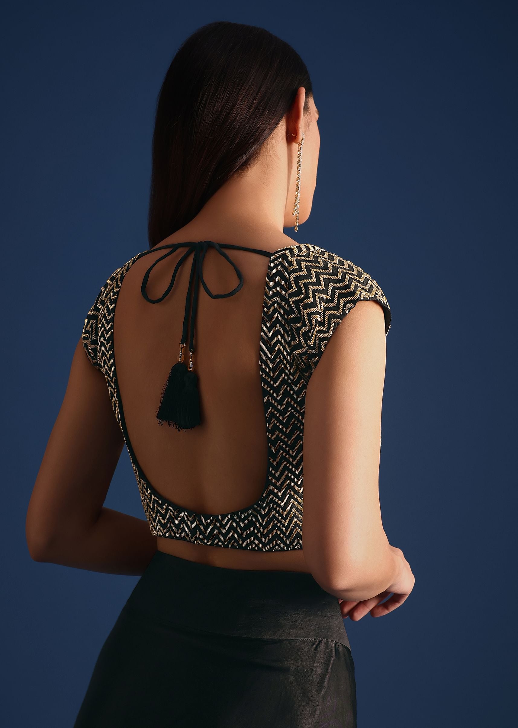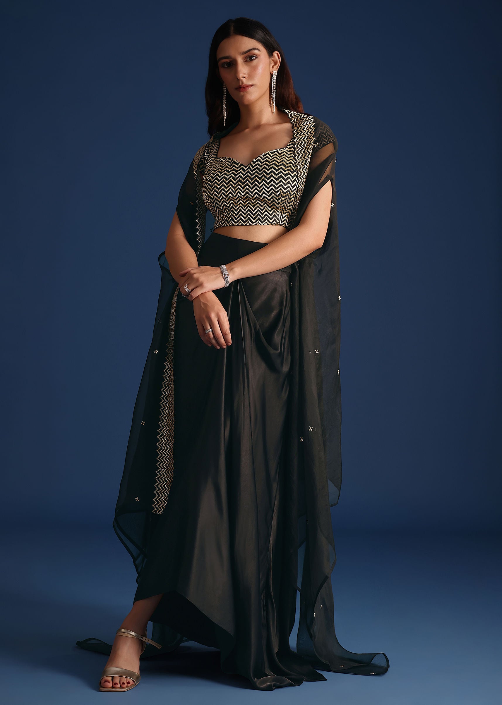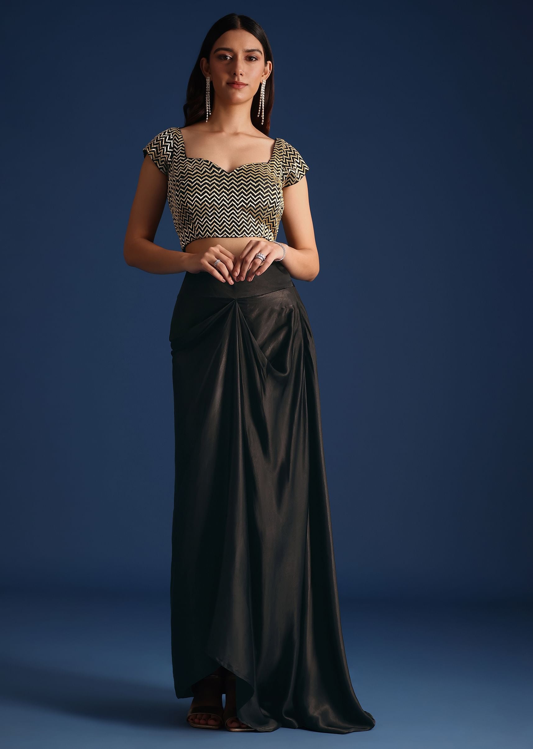 Black Cutdana Work Crop Top With Asymmetric Jacket And Skirt