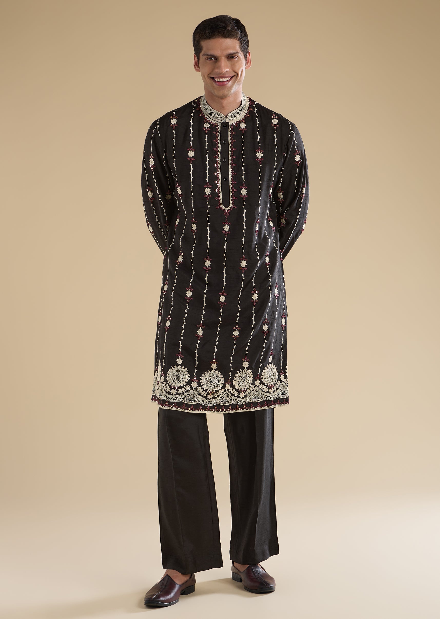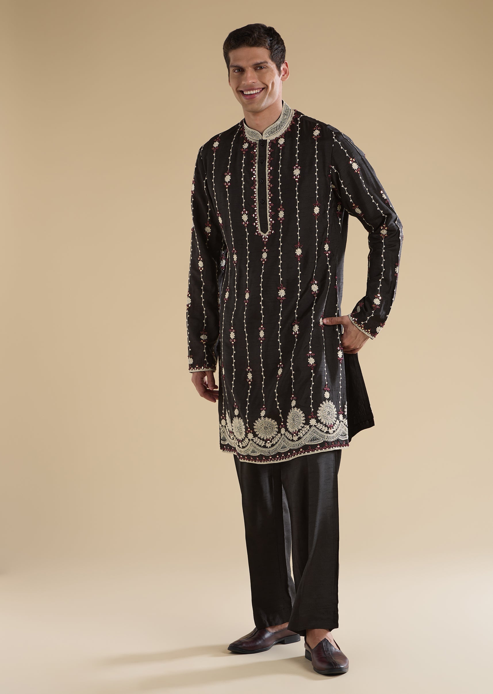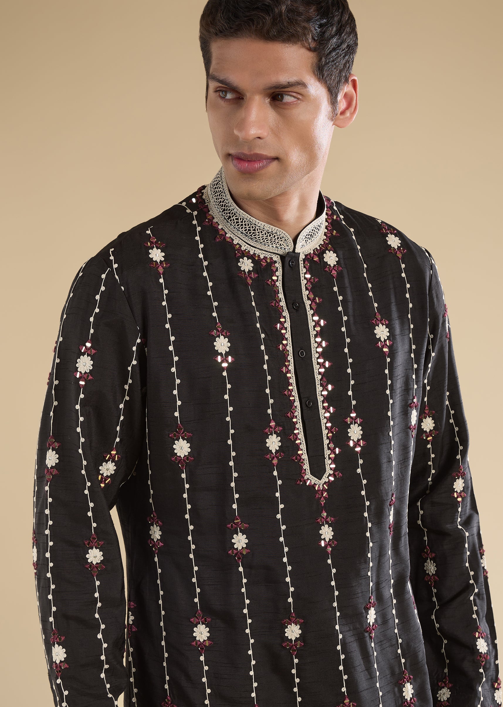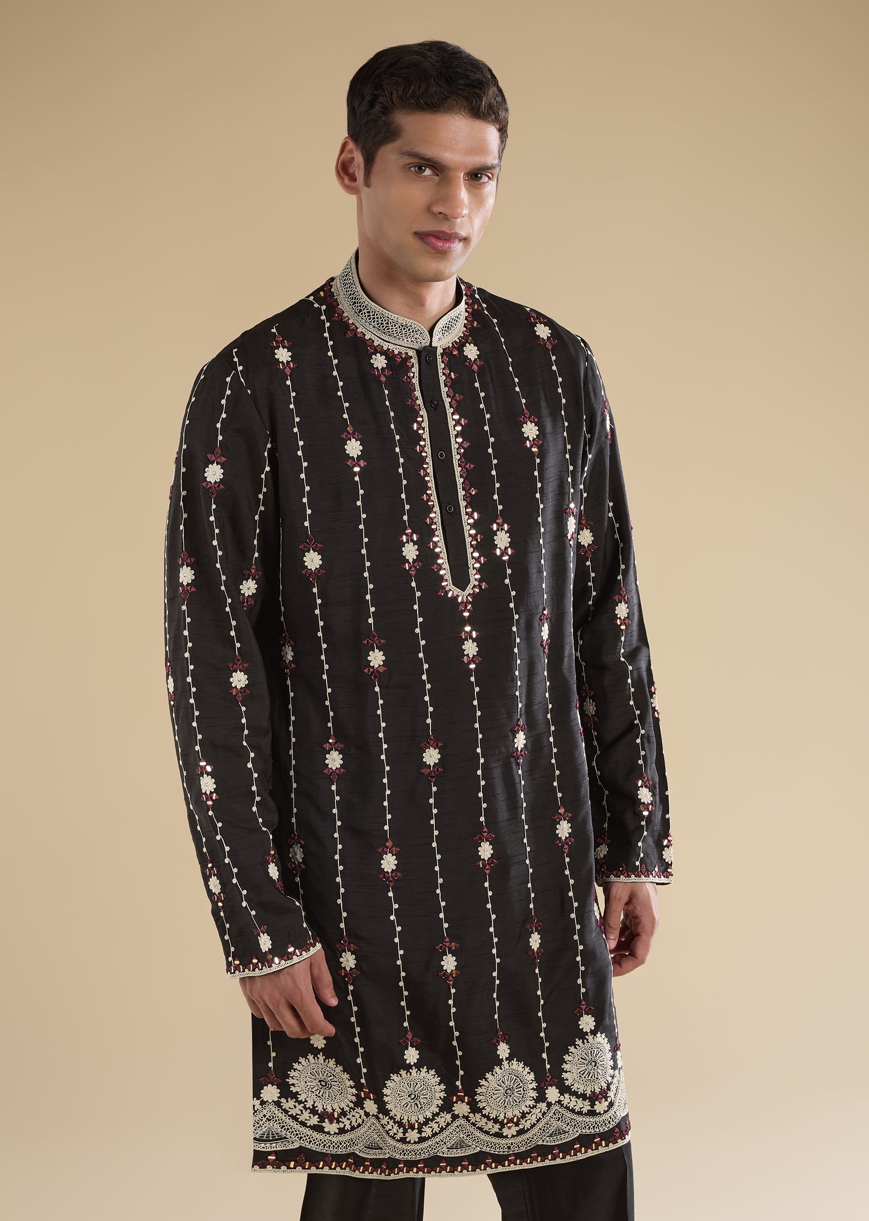 A premium black kurta set in silk blend, detailed with dori work, mirror accents, and zari for a rich festive finish. Styled with mandarin collar, full sleeves, and front hook-eye... More Product Details