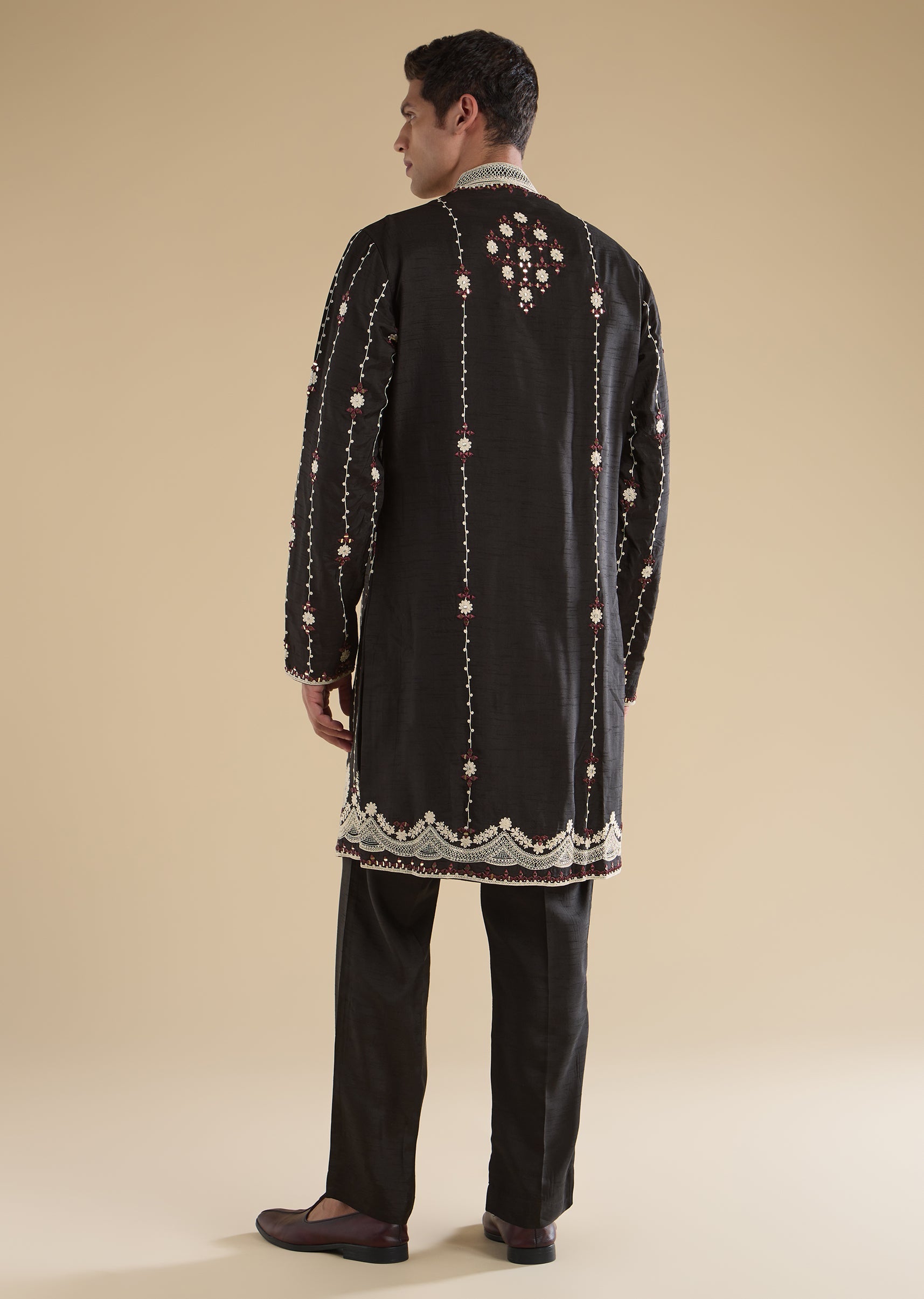 A premium black kurta set in silk blend, detailed with dori work, mirror accents, and zari for a rich festive finish. Styled with mandarin collar, full sleeves, and front hook-eye closure, paired with straight mid-waist pants—ideal for sangeet and reception looks.