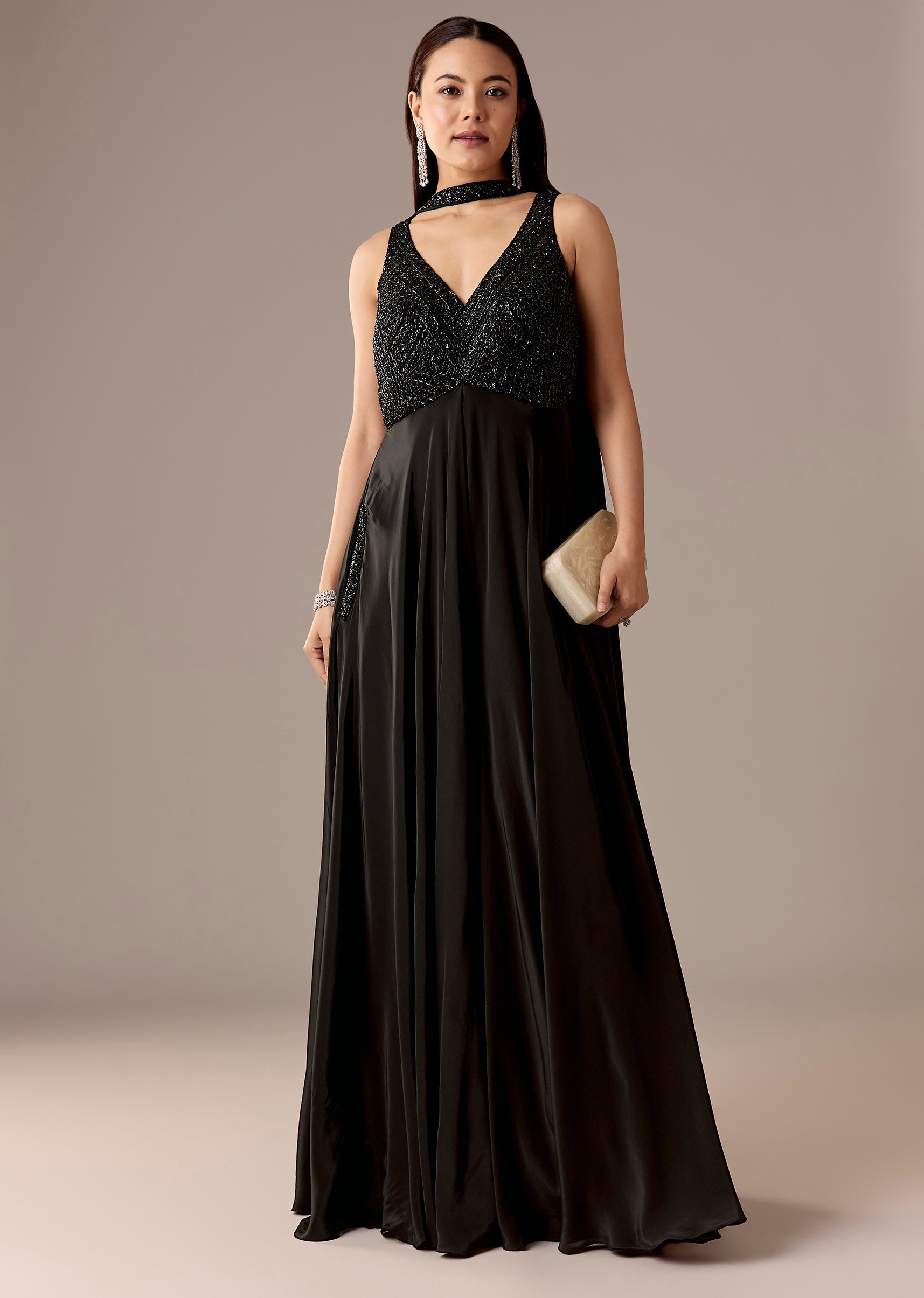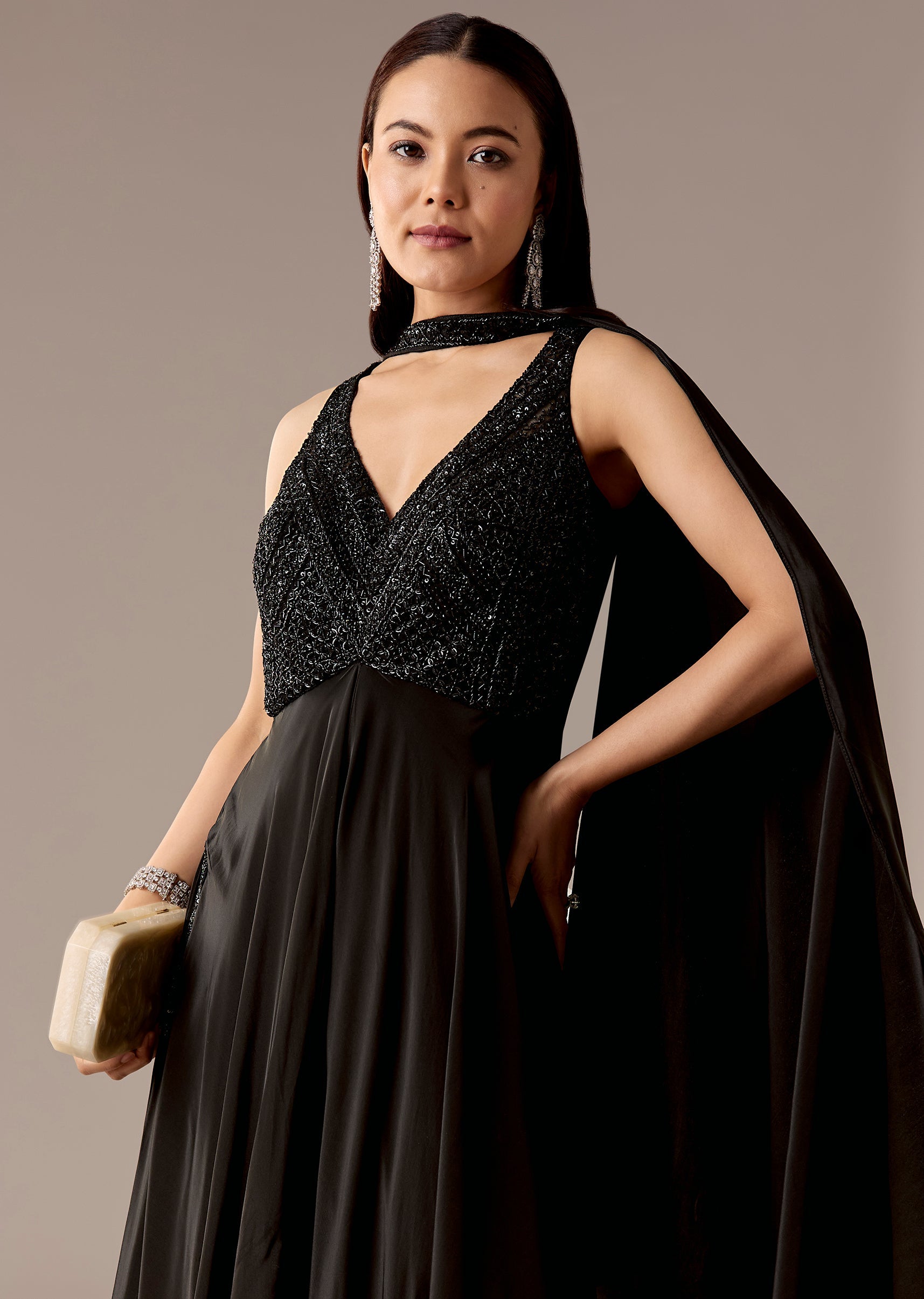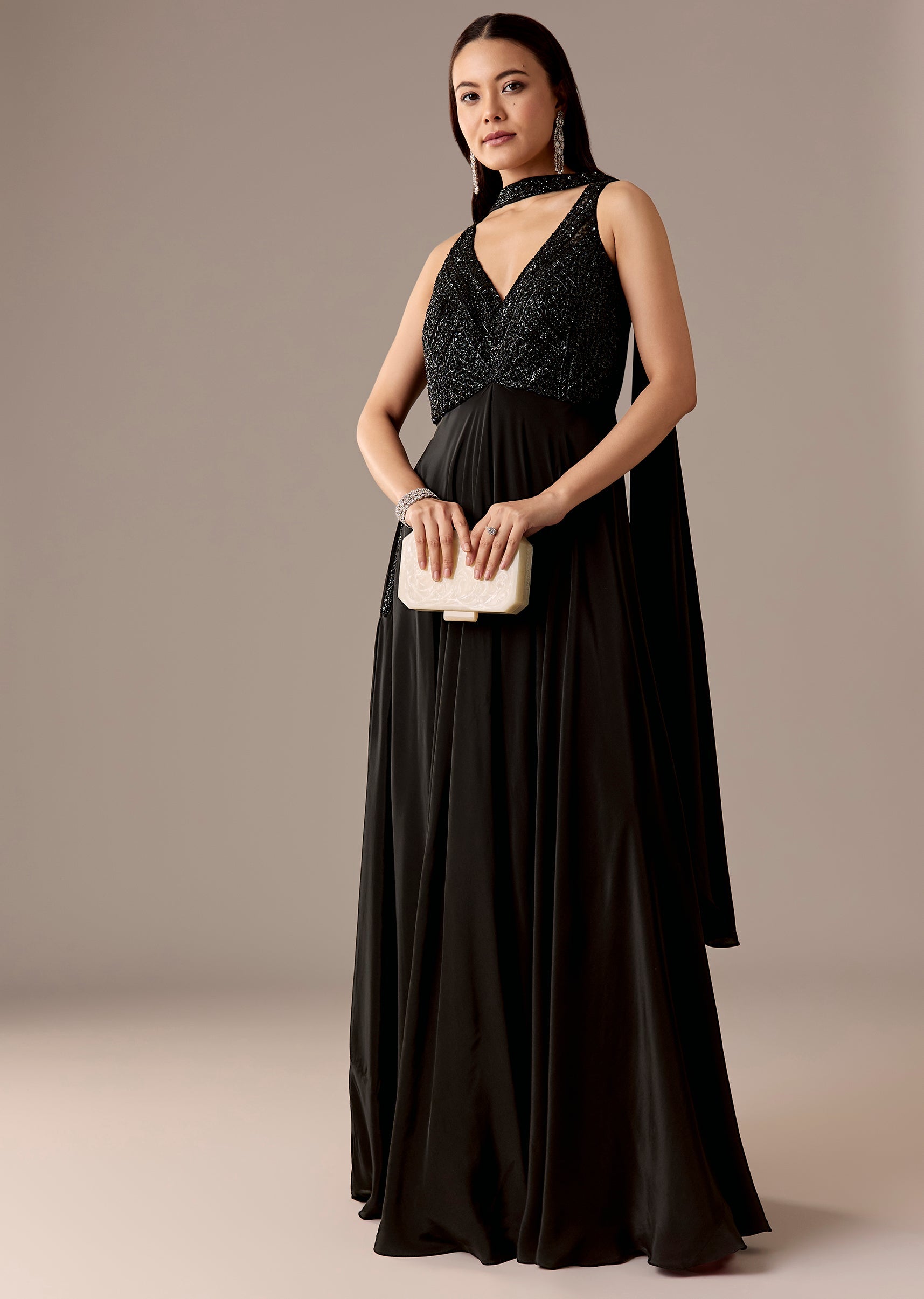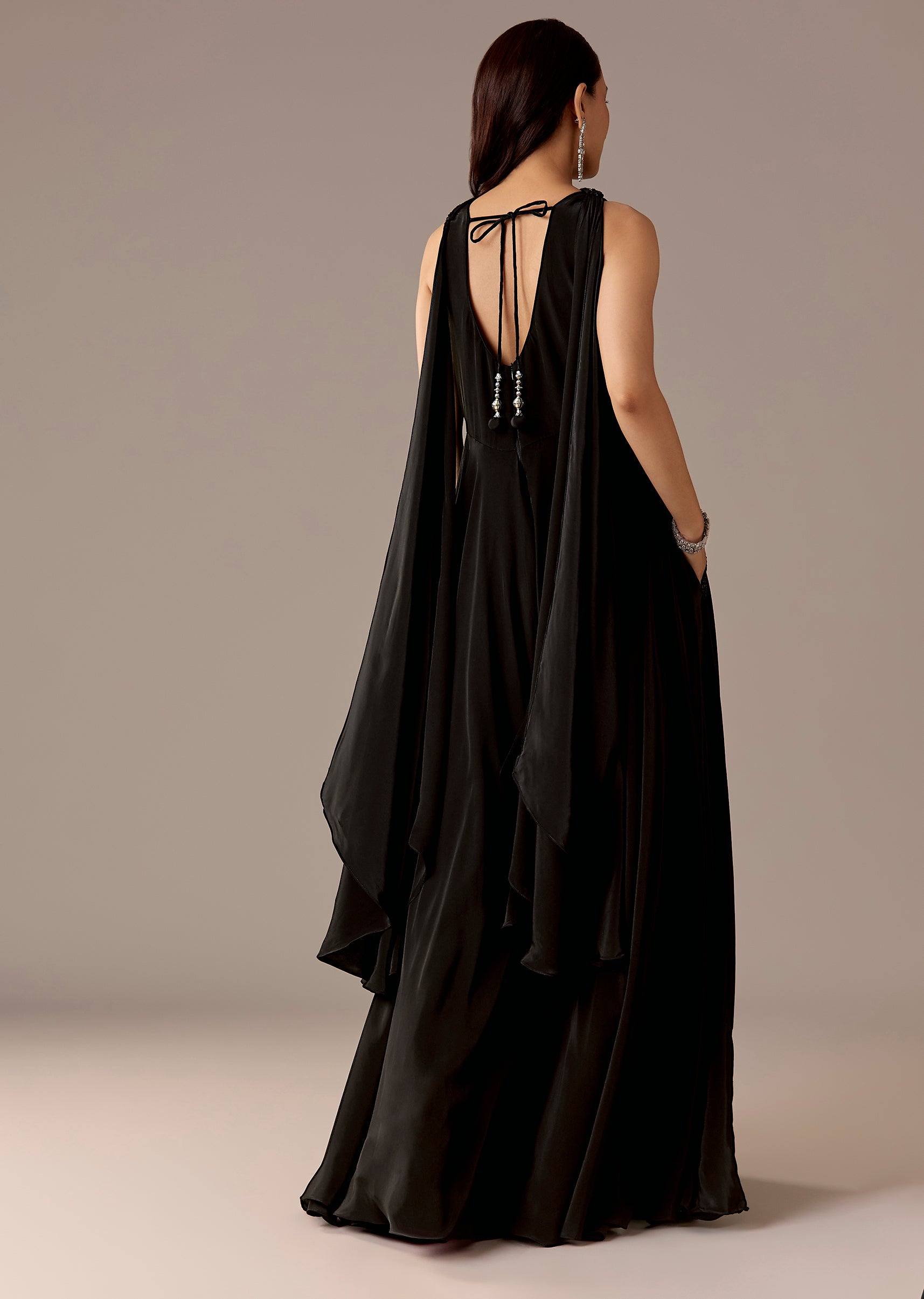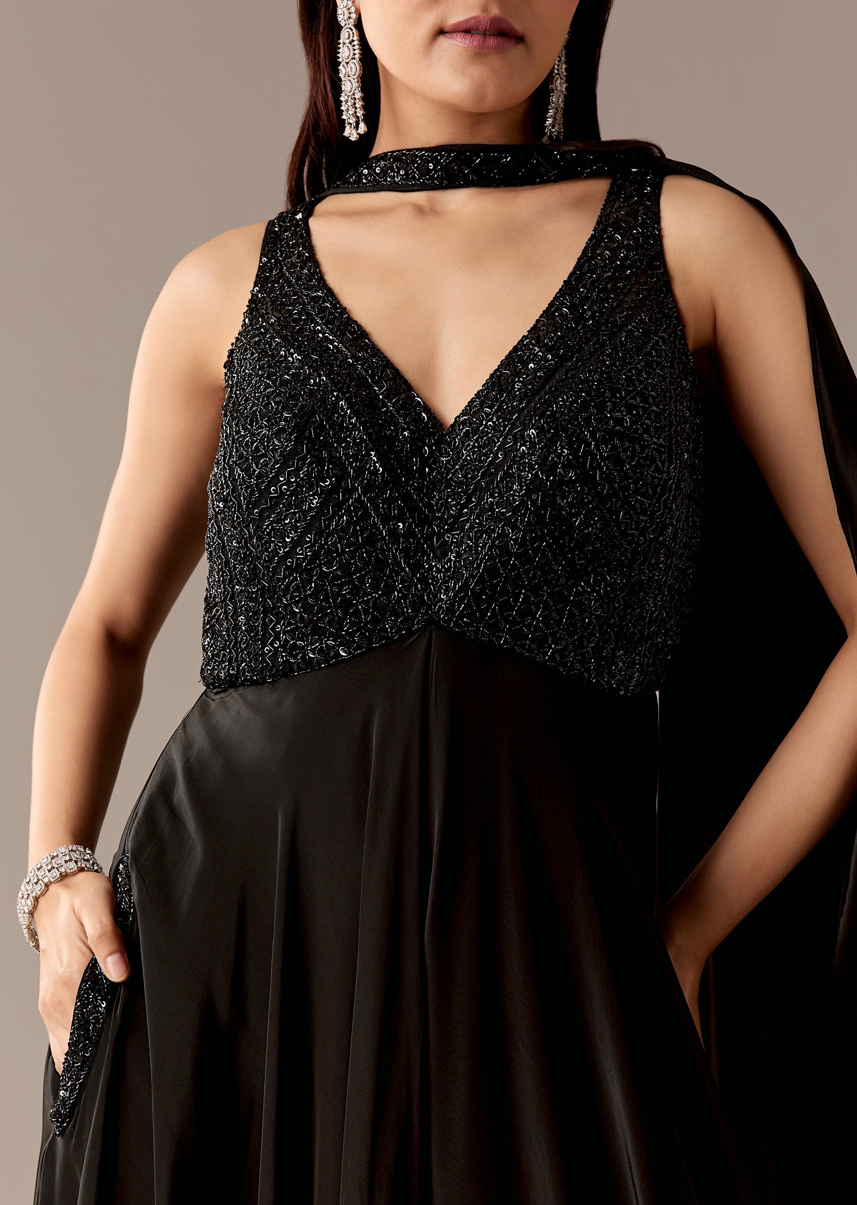 A statement black crepe jumpsuit featuring sequins, cut dana, and beadwork, paired with a choker-style dupatta for extra edge. Sleeveless V-neck with back zip—perfect for cocktail, party, and reception looks.Awarded... More Product Details