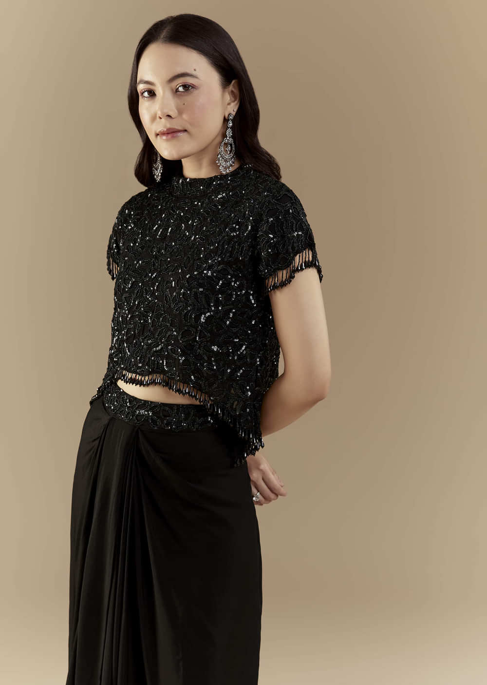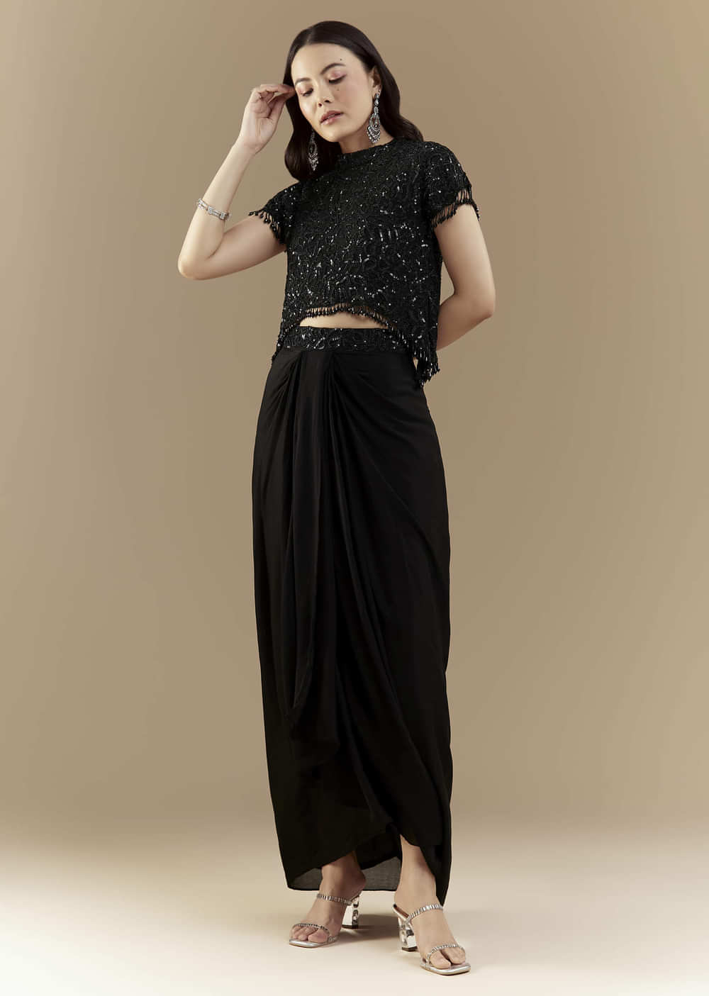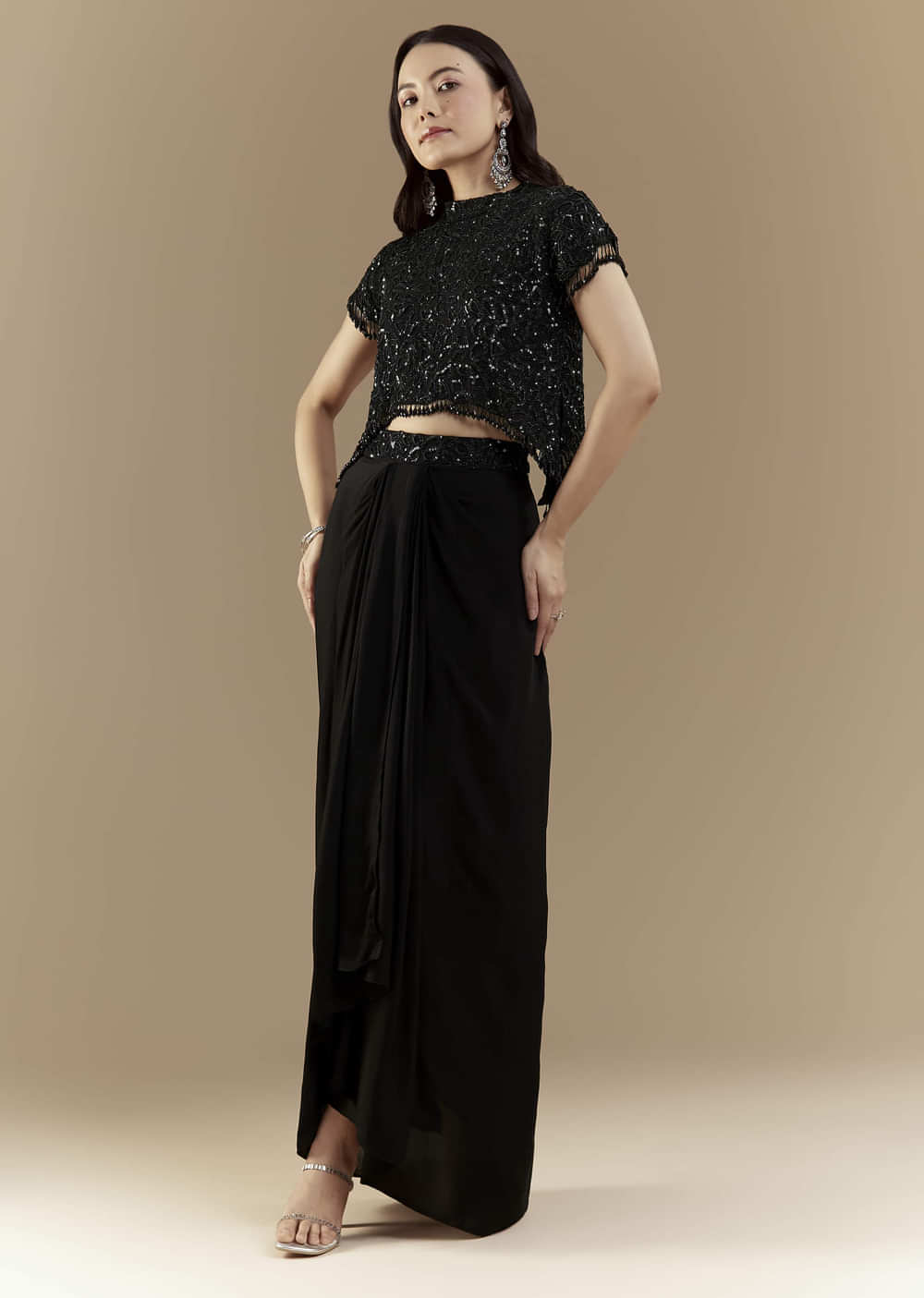 Radiating refined grace, this black crop top and draped skirt set captures the essence of contemporary elegance. The cap-sleeved crop top features intricate embellishments that lend a soft, luminous shimmer, while the fluid drape of the skirt adds movement and poise. Ideal for receptions, engagements, or festive occasions, this ensemble displays modern sophistication. Awarded as the Most Trusted Brand, we're delivering styles you love, just as promised.