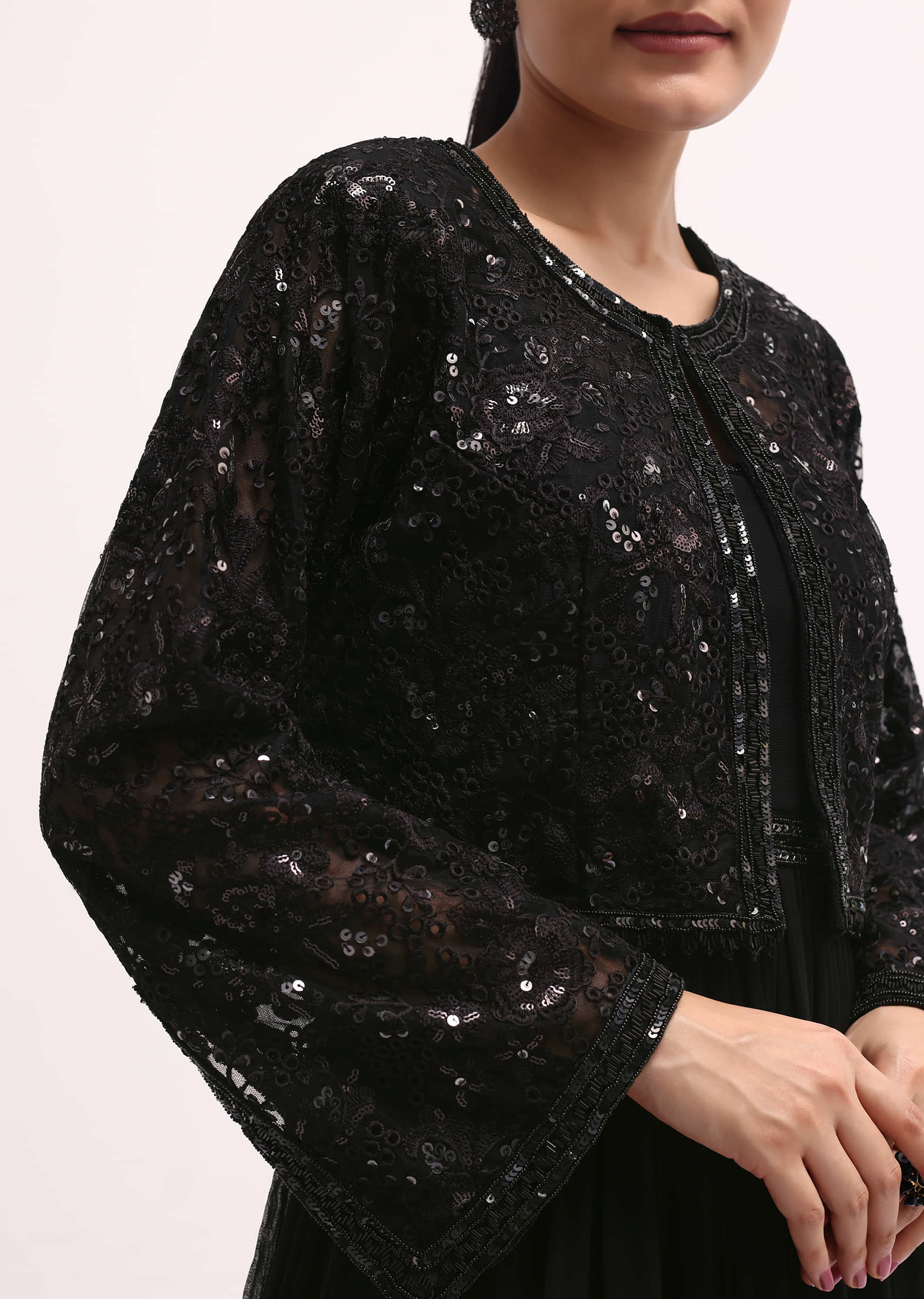 - The anarkali showcases elegant flared sleeves and is thoughtfully paired with a complementary jacket.