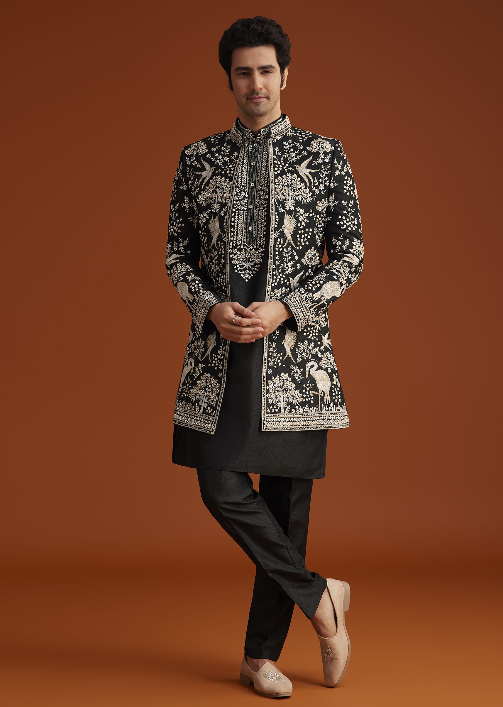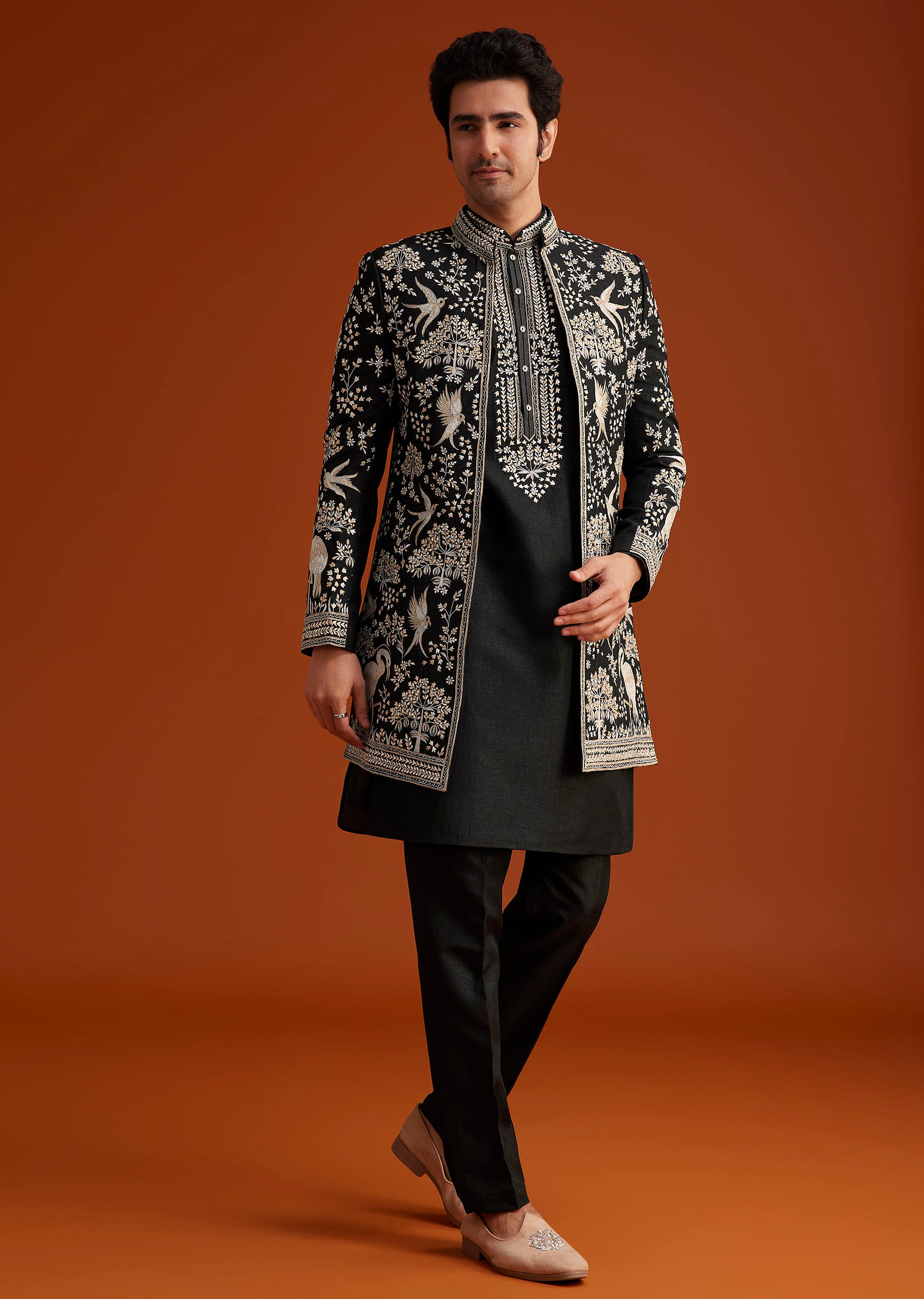 - Step into grandeur with this black Indo-Western sherwani, intricately adorned with rich thread embroidery and exquisite detailing.
